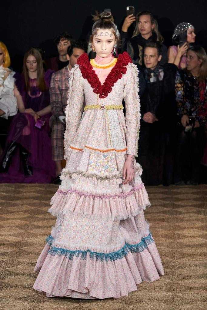 Viktor and Rolf : Viktor and Rolf were interesting, they used the patchwork technique surprisingly well in Haute Couture. It was a great use of a ton of fabric that lies around. the dresses gave a young and breezy feel. Inspired by Hally Hobbie the looks were cute and womanly and the perfect amount of sumptuous. The models were tattooed on the face which was highly reminiscent of Post Malone and added a more youthful appeal to the clothes. The prints individually were pretty and were composed pleasingly. The collection was rather unconventional and fun and I’m here for it.