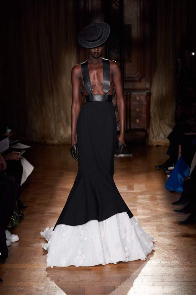 Ronald Van Der Kemp: RVDK was a mix of retro and sexy; even though I liked almost all the looks but nothing stuck with me. It seemed last-minute and somewhat casual and even though I’m all here for Casual Couture this wasn’t it. The ideas behind looks didn’t really translate, the execution could have been better which is literally the actual clothes. Parts of the collection was upcycled and Upcycled Couture I something I Stan but the fabrics looked flimsy and undone. The opening look was quite hot, a black fishtail skirt-gown layered over a white underskirt while a leather harness covered the breasts of the model paired with a fabulous hat.