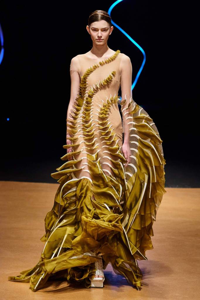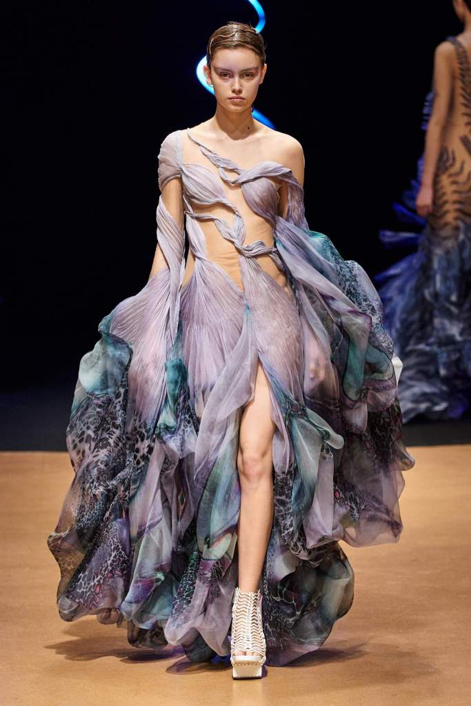Iris Van Herpen: Her collections are out of this world, How does she do it? She never ceases to amaze us. The collection was ‘ Sensory Seas’ and it was sheer enchantment. The collection was inspired by neuroscience and deep-sea organisms. With all of her signatures, this collection was Couture at its best with a seamless inclusion of technology. My favorite look was this pale purple-blueish gown that looked like water flowing and the last two looks were just sublime, the intricate details, movement of the dress and just the lasting impact it has on a person. I recommend watching a video of the show to actually understand the beauty of it. IVHis a genius and the collection was fascinating.