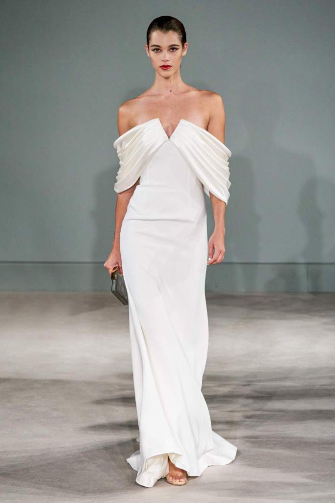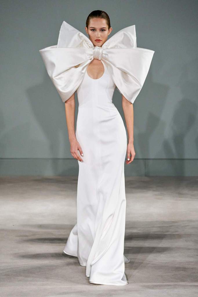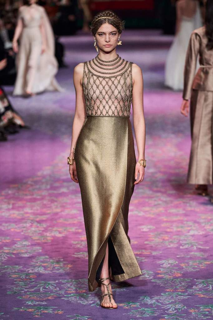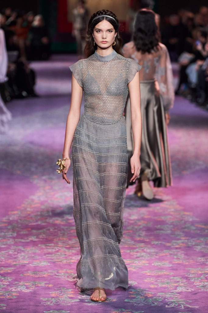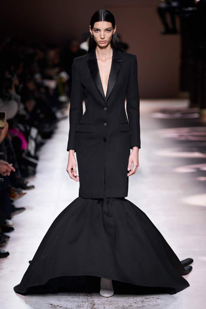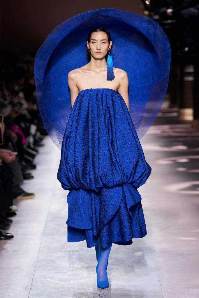 Schiaparelli: Daniel Roseberry dug into the Schiaparelli archives this collection. Some of the looks were beautiful and so nicely done like the suits and the all-black looks, the brown/beige looks and the white heavily embellished suit. My favorite was this nude embellished drees which sheer heavily embellished gloves a brilliant adaptation of the skeleton dress by Elsa Schiaparelli, It was beautiful. A brown dress was a version of the 1936 Etruscan dress. A bright blue dress with cloud-like ruffles covered in extravagant embellishments all over the dress extending to the model’s body. The crinoline life silhouettes were great but were cheapened by the rather juvenile colors. Roseberry seems to be moving in the right direction and let me tell you expectations are high.