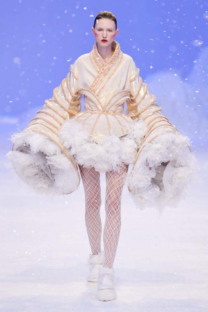 Guo Pei: It was snowy and beautiful, Guo Pei’s inspiration for this collection was the Himalayas, It was so pure and soothing. She says the Himalayas for her is a mysterious, spiritual and holy place. The look featured traditional prints and colors, My favorite look was surely the all-white look that literally looked like snow and there was an off white huge coat, it was beautiful. Icy eyebrows added a nice touch and white fishnet stockings complimented well.