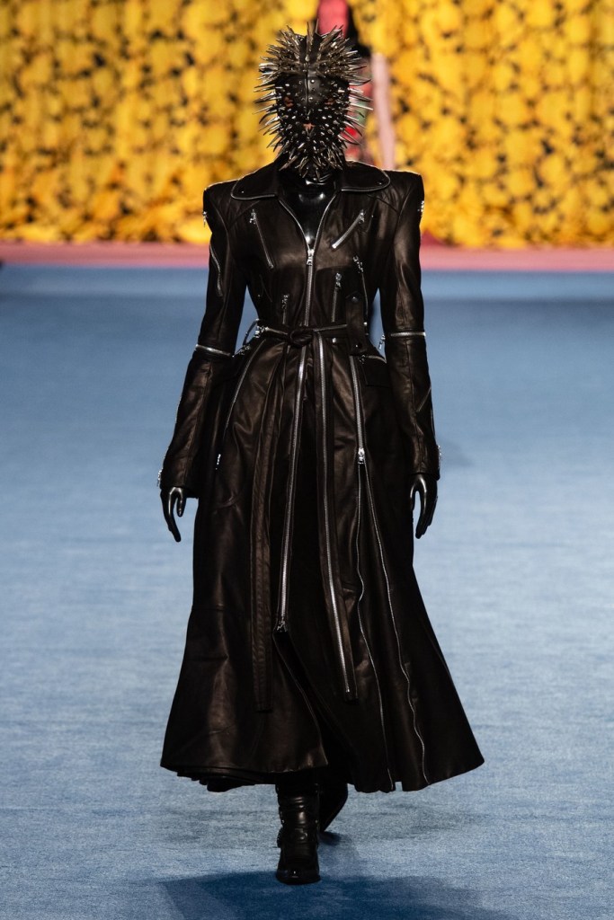 RICHARD QUINN: A classic Quinn collection, absolutely wonderful. The colors, the prints and beautiful chiffon looks. The favorites were obviously the heavy pearl looks with ‘God save the Quin’ embroidered on the back. The flower printed looks and the flowy chiffon outfits were beautiful. The yellow floral print was fabulous and the black leather looks with a spiked mask was one of the best looks of the season.