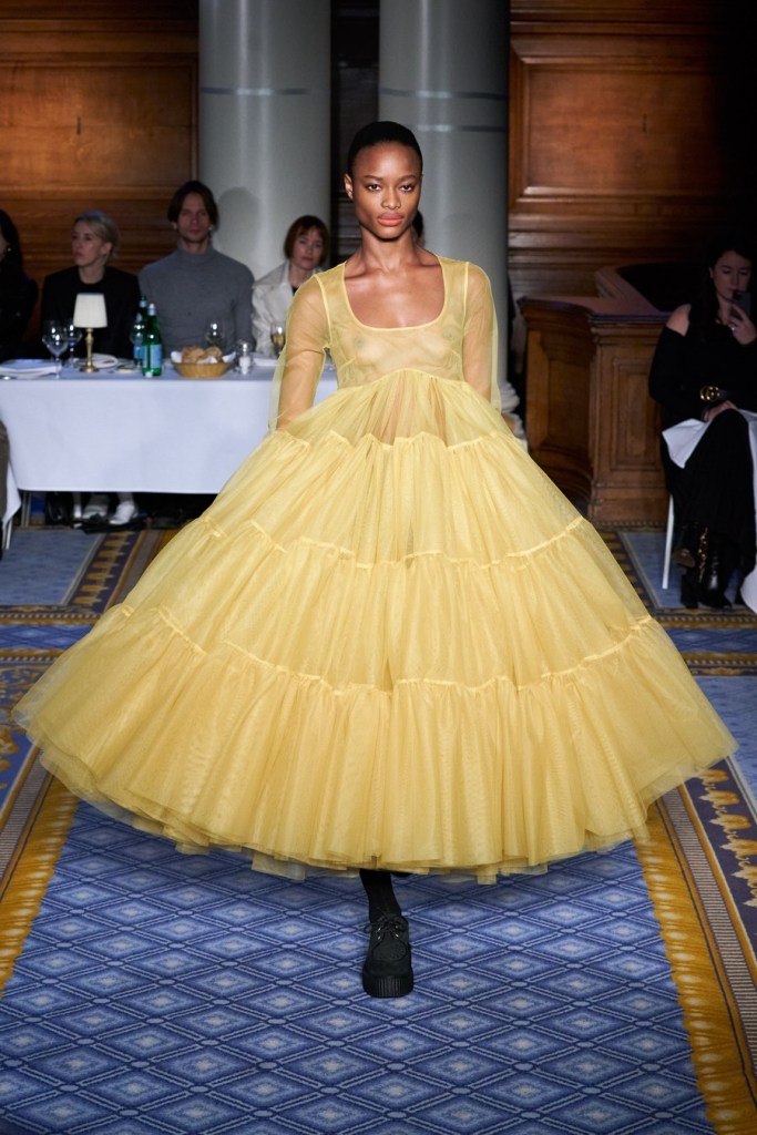 MOLLY GODDARD: Molly Goddard is slowly making her way, I sure liked this collection. There was this beautiful yellow tulle dress that I am for real ready to die for. there was a bright red dress too, absolutely stunning. Her pieces were a bit for commercial this season but done beautifully. The floral looks were pretty though the hats with bows were a little off.
