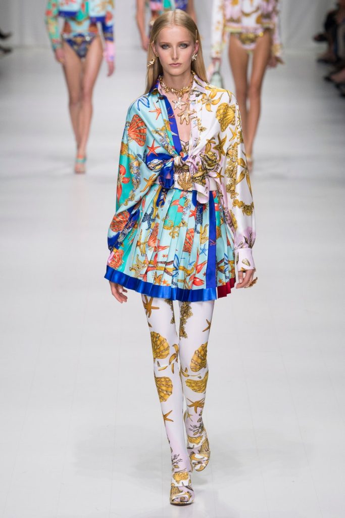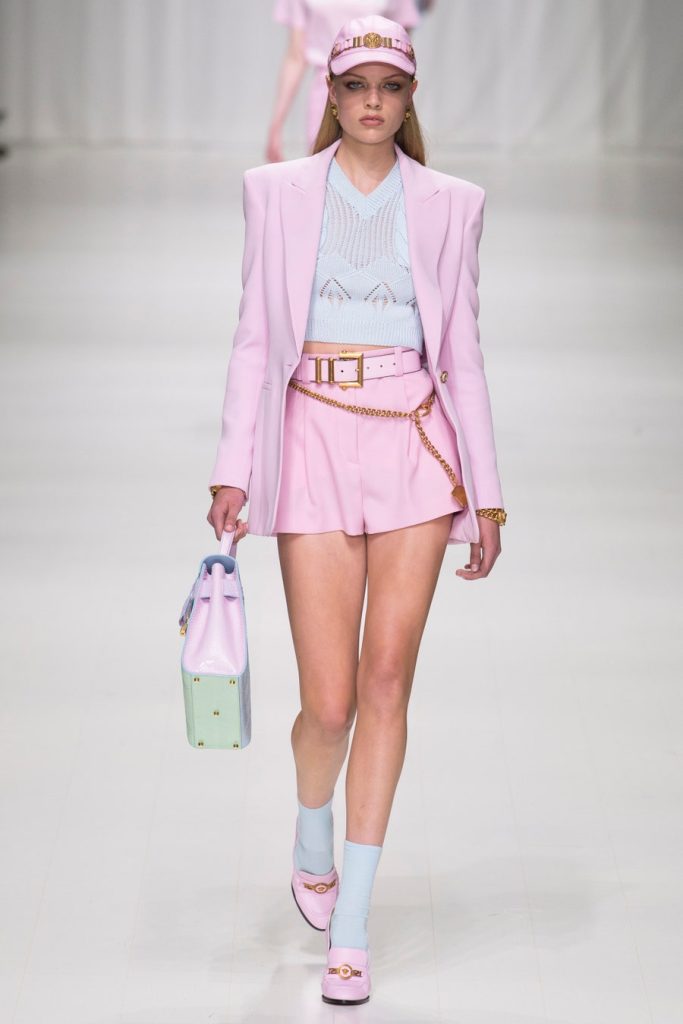 The show starts off with classic yellow and black print followed by some strongly tailored black looks paired with embellishments and brilliant boots. All the looks were in different fabrics leather denim and more. More signature Versace baroque trend followed in forms of dresses skirts pants coats and everything you can imagine. Then followed the similar print and lighter shades and came the pastel looks. as much as Versace is known for its bold and bright it has done some beautiful work with pastels. Then followed the pop art looks in abstract colors each look recreating many iconic runway moments. Then followed the famous butterfly bathrobe look, pastel velvet dresses, and bright monochrome suits. The show was closed by the 5 supermodels walking hand in hand wearing gold chainmail dresses along with Donatella Versace.