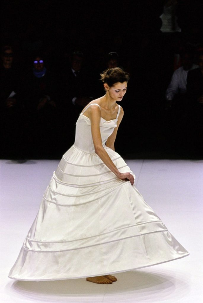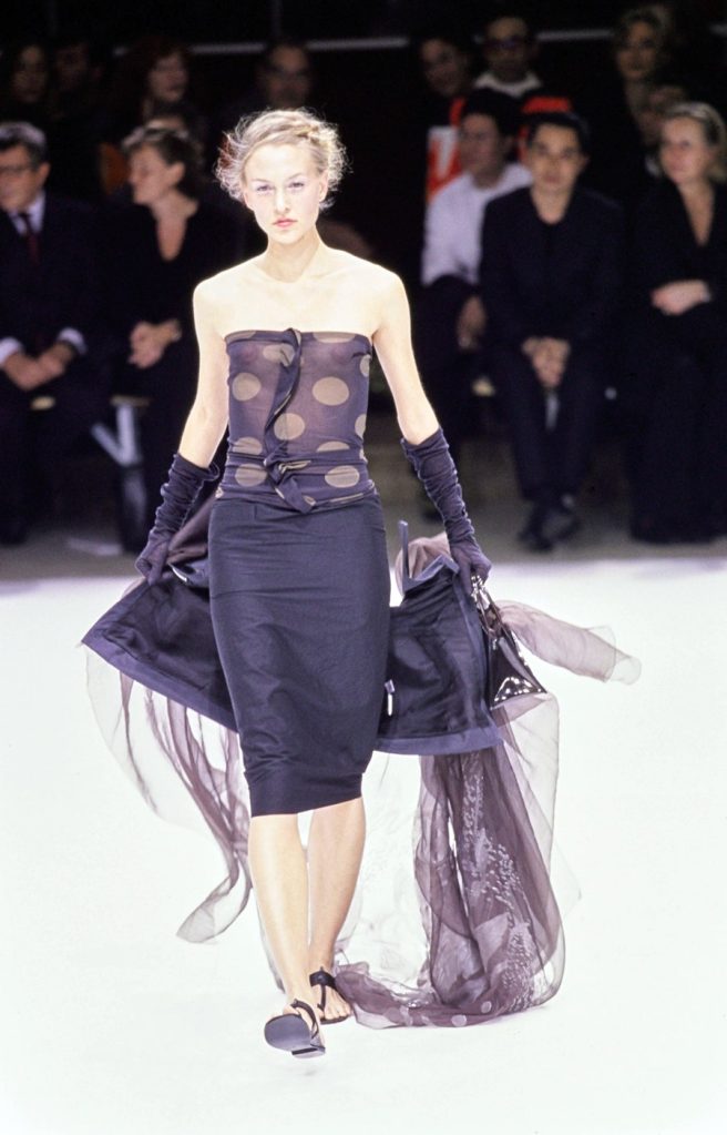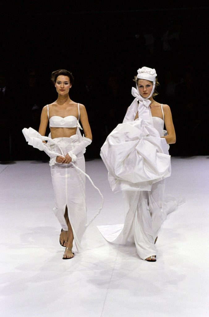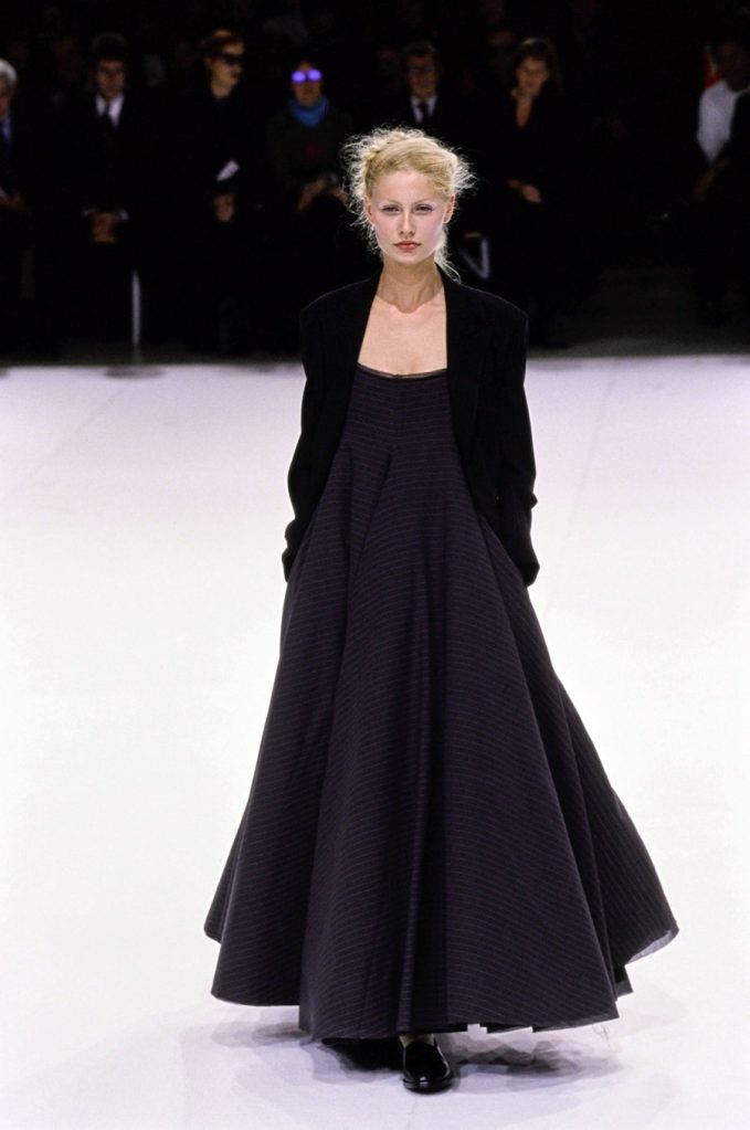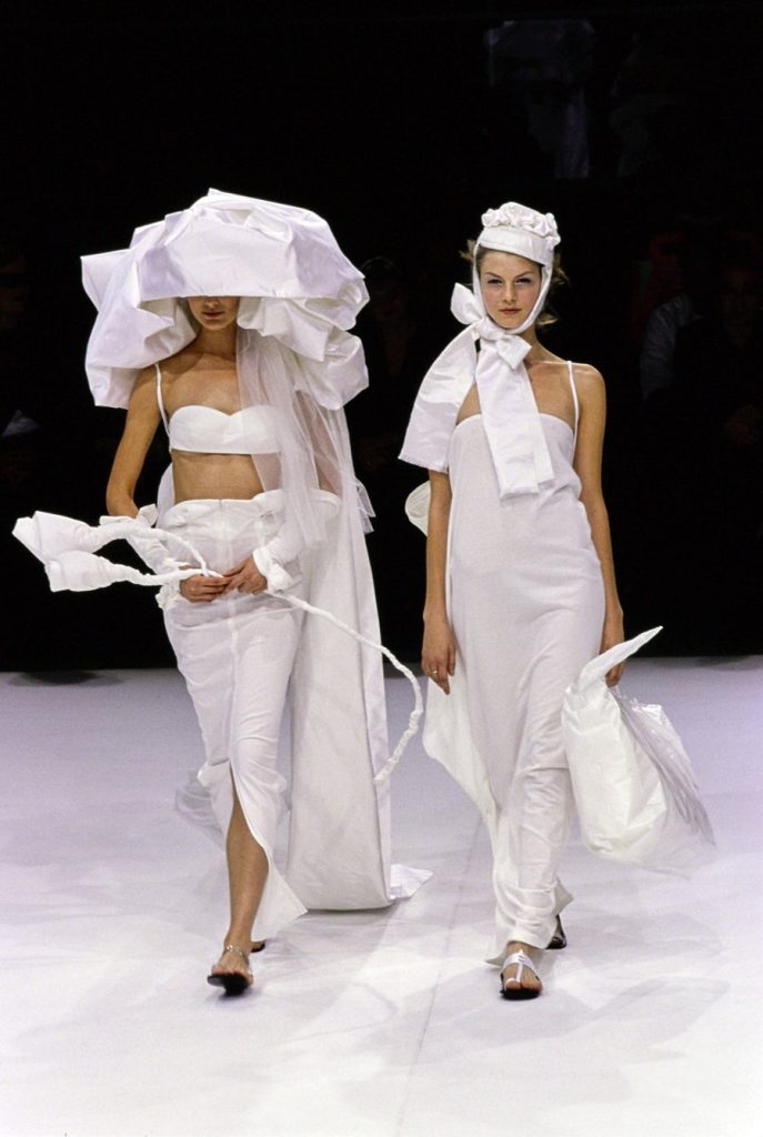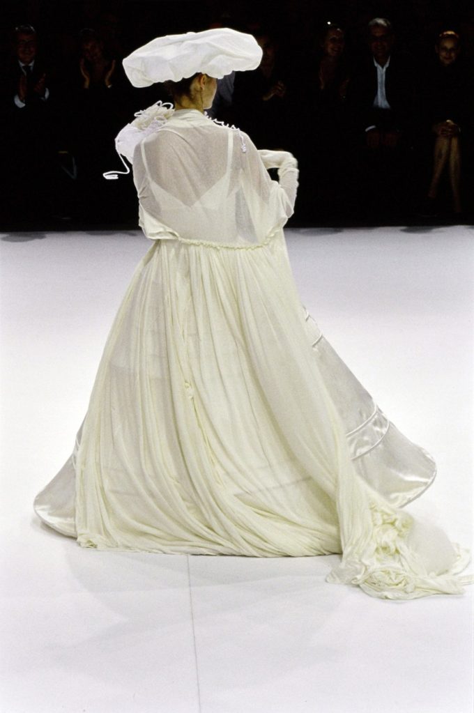 One of the most brilliantly wonderful shows in the history of fashion, Yohji Yamamoto’s spring-summer 1999 is beyond words. Tim Blanks called it “one of the most enchanting fashion shows I’ve ever seen” “As the show went on, it got more and more and more delightful. It took the audience somewhere; people were gasping and cheering. The things that happened to the clothing were just magical.” And Suzy Menkes called it the “zenith” of his career. Shalom Harlow said that it was “one of my all-time favorite shows… I think there was beauty and poetic sadness and laughter and humor.”