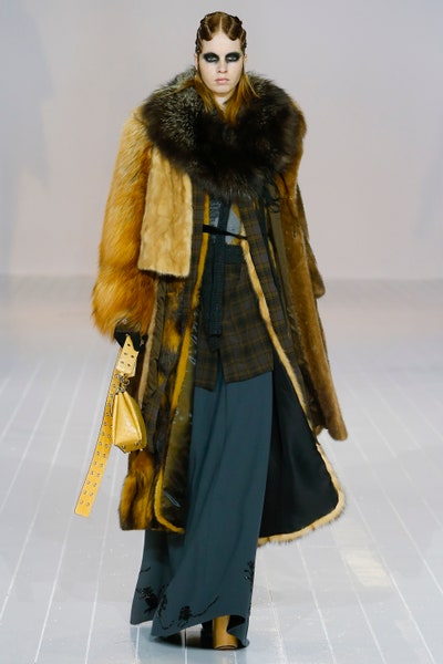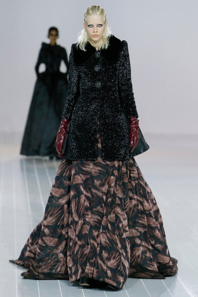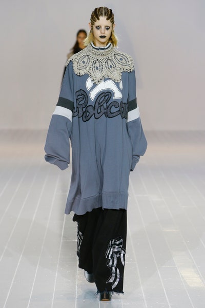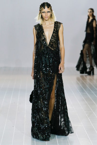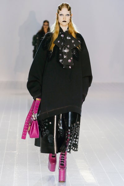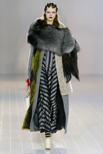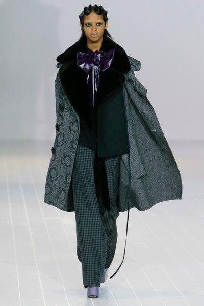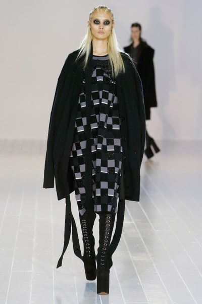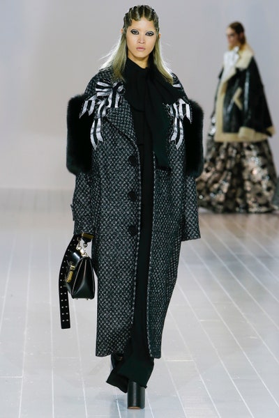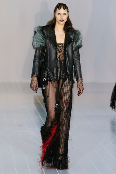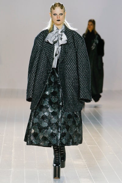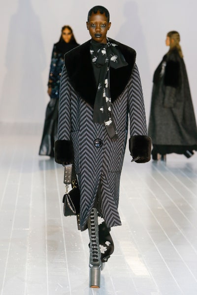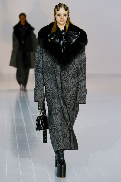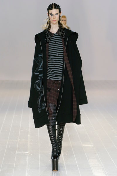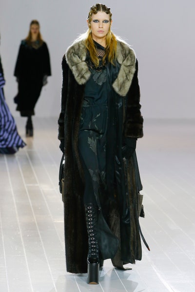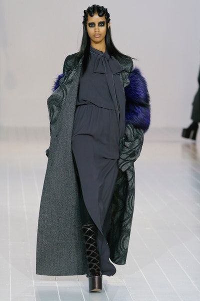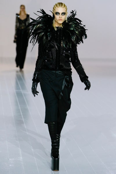 The collection starts and ends with black, comprised of all shades of black greys darkest brown blues, and green. Though there were tiny pops of mauve and green it was basically black. Enormous sweatshirts extravagant coats and a plethora of different textures. There were feathers sequins leather fur and everything you can imagine. The makeup was dark with heavy black eyes, occasional black lipstick, and slick extreme finger waves on each look crafted beautifully. One of the most important aspects of the show were the sky-high heels, and by sky-high I mean just that.