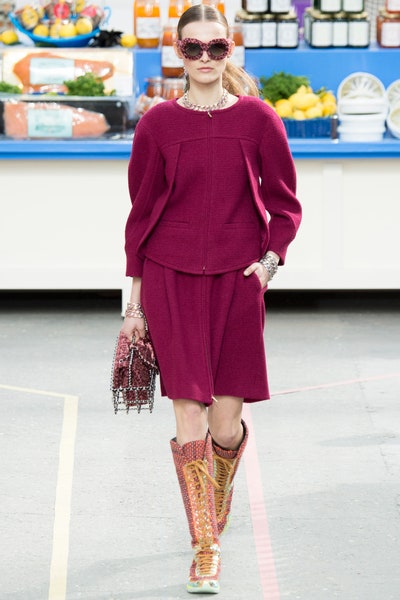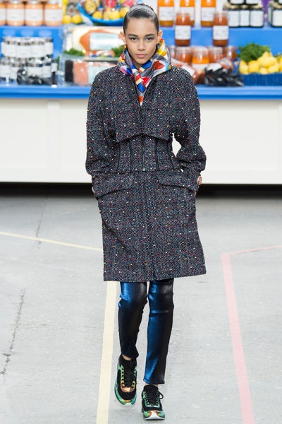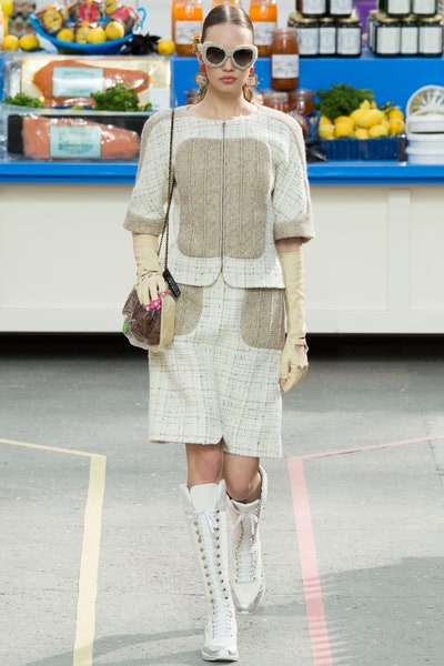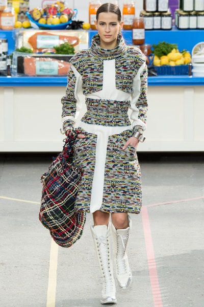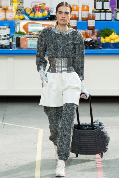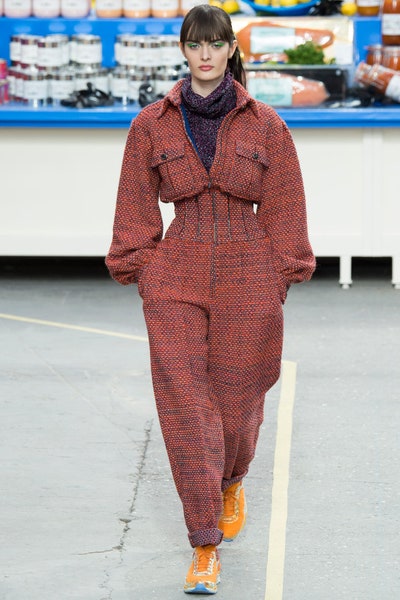 A relatively sportier collection starting with sneakers and rugged workout looks. We saw a lot of hourglass structure, knee-high lace-up sneakers, and the most sportiest Chanel suits yet. The bags in the show were pure genius be it the shopping basket bags, lait de Coco bag, or the plastic-wrapped Chanel bag(which literally might be the most creative bags ever). A rusty orange hourglass jumpsuit stole my heart along with a red-orange off-shoulder fuzzy dress. With a collection so extravagant and real at the same time, it was easy for it to look corny and try-hard but the meticulous details and the planning is what made it so memorable. With each product from detergent to corn flakes everything was Chanel approved.