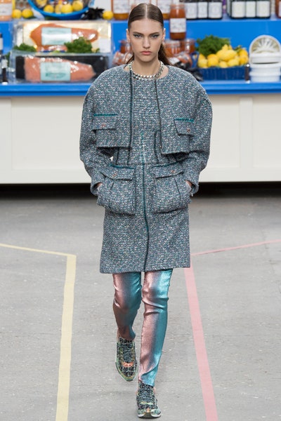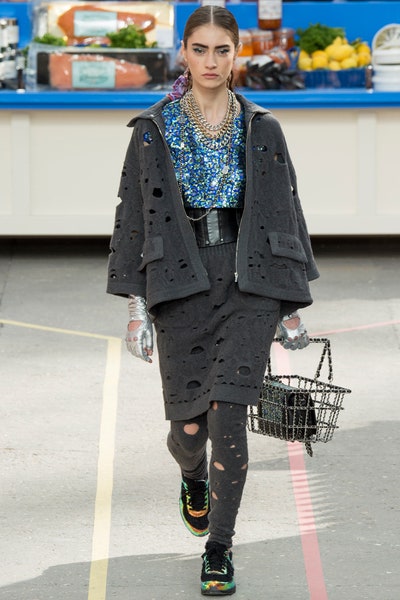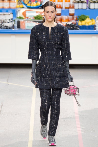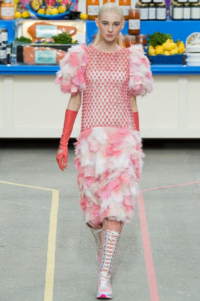 Undoubtedly one of the most iconic Chanel shows to date. I am still confused if Lagerfeld was appreciating or mocking consumerism. But it is not the easiest thing to decipher him so I am not even going to try and just admire his genius. Every detail in the show was well thought and executed. Be it the Chanel branded canned goods or the Chanel trolley bags. Lagerfeld has always had extravagant and unrealistically creative set designs but this one was unforgettable. The collection featured democratic women as Tim Blanks rightfully put it, just how in a normal supermarket you would see women of all backgrounds. With sporty chic to high French, this show had it all. Which women wearing ripped workout clothes to leather trenches and Couture like dresses this show had it all. Somehow it is one of the most unattainable and wearable collections. The collection began with Cara Delevingne in a pink sporty rugged look and ended with a pink dress made flower-petal applique, Karl represented real women in the most Chanel way ever.