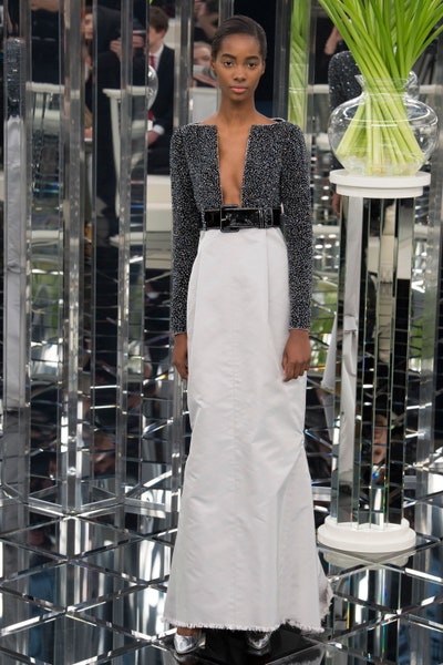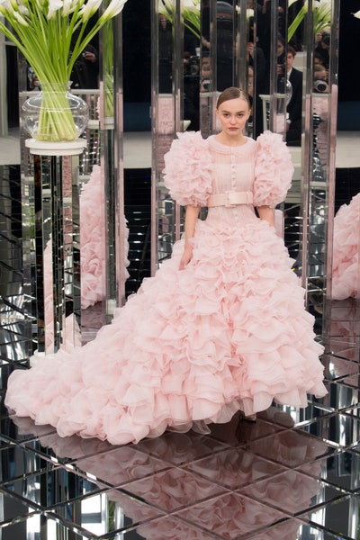 The collection began with some impeccably tailored suits in pretty pastels such as yellow, blue, green, pink, lavender, and a beautiful grey. Most all of the looks were paired with big complementary square belts. The show gradually moved to more fancy looks, there came a structural white gown with deep energy of elegance and strength. Then came a stunning silver suit that Cara Delevingne wore for the Met Gala 2017. A little black dress with a twisted accentuated waist with a deep yet stiff neckline stole my heart. A few more sumptuous looks though not each one of them was my favorite but it brought the collection together while approaching a wide range of styles and clients. We now advance to the more dramatic and the highlights of this collection, dripping with sparkles, sequins, and feathers. One look that stood out was a flowy light grey gown with tweed and feathers. Feathers that created extravagant silhouettes and blinding sparkles and elevated classic yet powerful gave us the best of Haute Couture. To close the show came Chanel muse Lily Rose-Depp in an immensely ruffled pink gown.