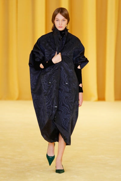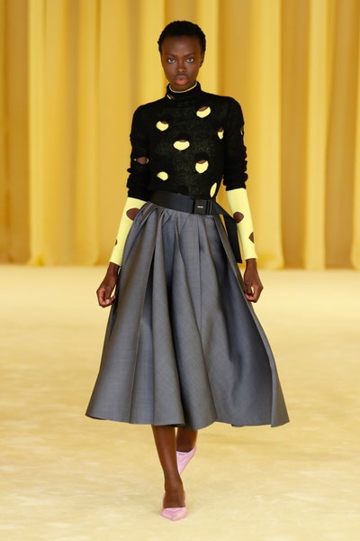 The collection started with a model in a black look with a Prada logo just below the neck and she was clutching her coat that was reminiscent of Simons’s final collection at Jil Sander. The collection was filled with signatures from both the designers. Colors were mostly black and white with a few here and there, some ugly chic Prada archive prints were revisited. The printed looks were hoddies paired with a pleated skirt which we also saw in all-white looks with large graphic prints in black. Among some sporty looks, there was a 60s silhouette sleeveless top and trousers which was lovely. There were stunning trenches one in yellow and one in beige followed by 2 stunning satin looks in yellow and pink with flower appliques made from the same fabric and black random prints. Classic Prada? Yes. There was some Knitwear with circles cut out paired with some stunning grey pleated midi skirts again a perfect blend of both. My love for kitten heels was gratified by some that we saw in a plethora of colors. The bags were classic and Prada logo stud earrings were quite nice as well. There were a few interpretations of a more utilitarian look as well which was a pleasant initiative but comprised of one hideous black skirt/bag. The idea of a uniform which basically every Prada look exudes was also represented through a more youthful and work from home friendly collection. And controversial opinion I loved the huge Prada logos below the neckline, I think its a smart move that will appeal to the current aesthetic-centered generation. The collection was relevant and relatable and had some defining commercial moments. Miuccia Prada is one of the few designers who seem to have a sense of humor in their work, second would probably be Raf Simons. After the show, both designers came together for a virtual conversation which was insightful and super cute.