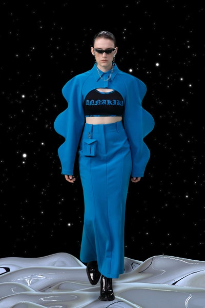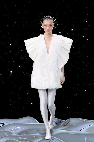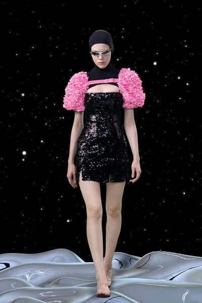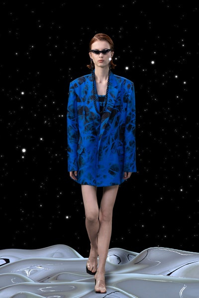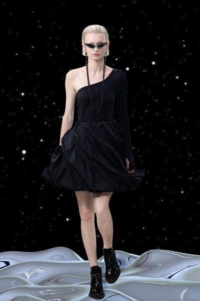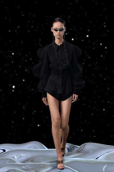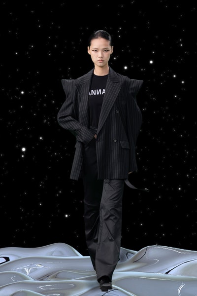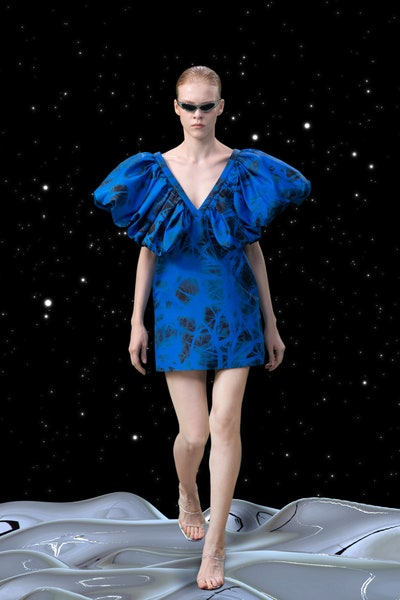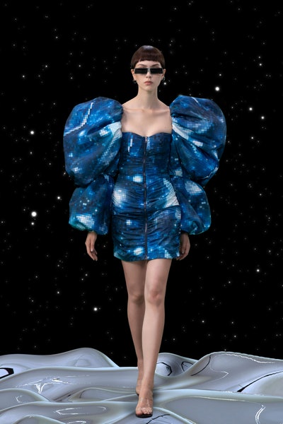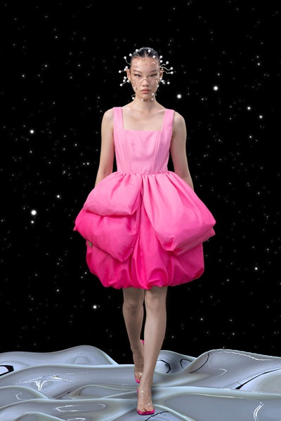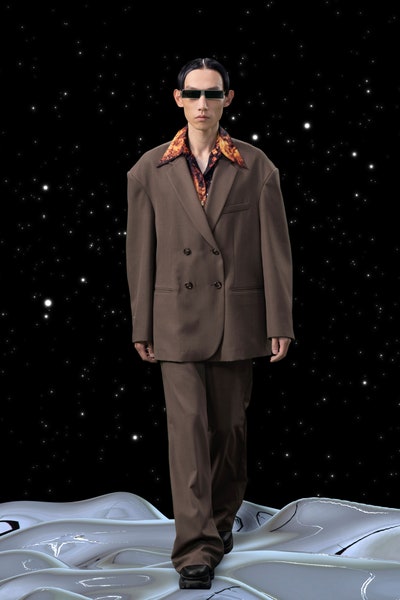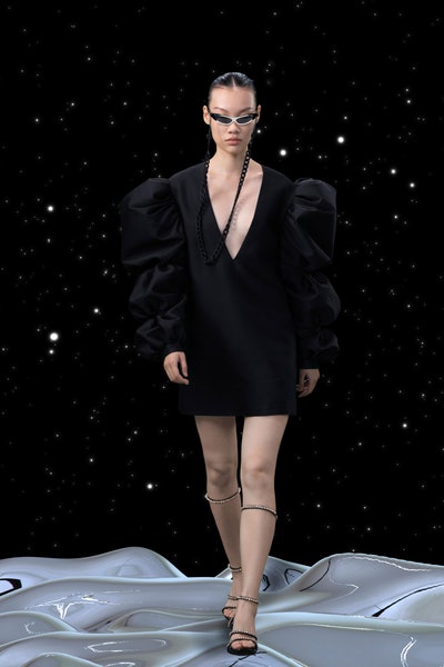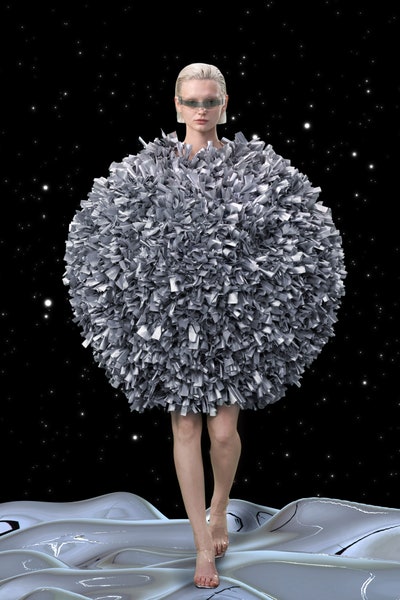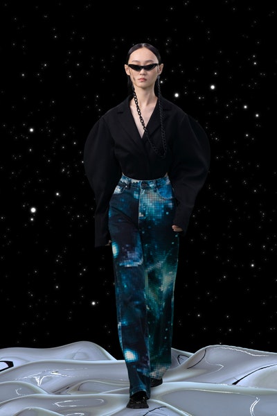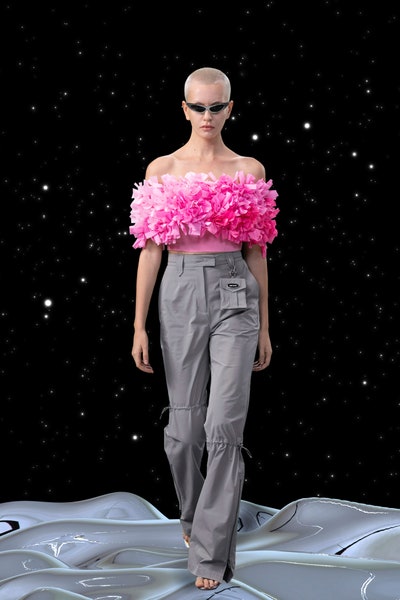 1997 movie Contact was the inspiration, the clothes had all the brand signatures. Bright pink, orange and blue were the primary colors apart from the monochromes. The cosmic prints but impactful but not in an obvious way and thankfully all looks were paired with Matrix sunglasses. Each outfit featured a distinct exaggerated silhouette with streetwear and classic elements blended seamlessly. The last look was a silver balloon-shaped dress which basically looks like a ball of tin foil but I imagine it is the perfect intergalactic wedding dress.