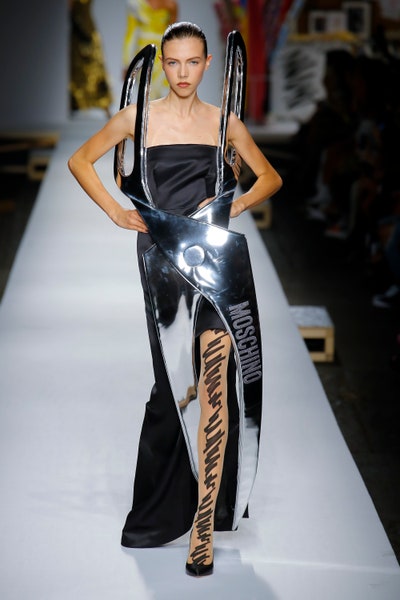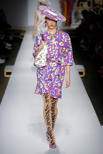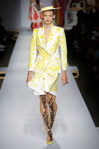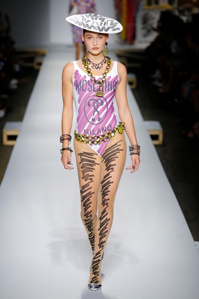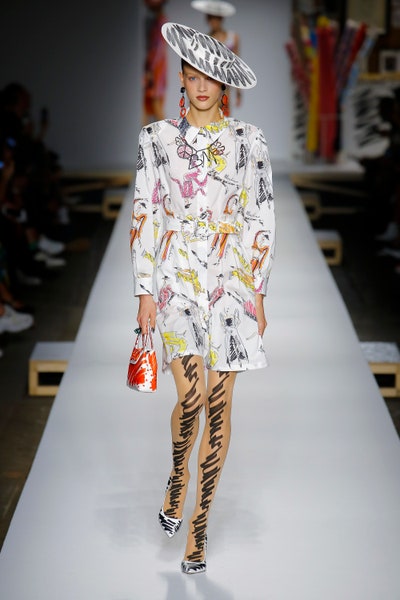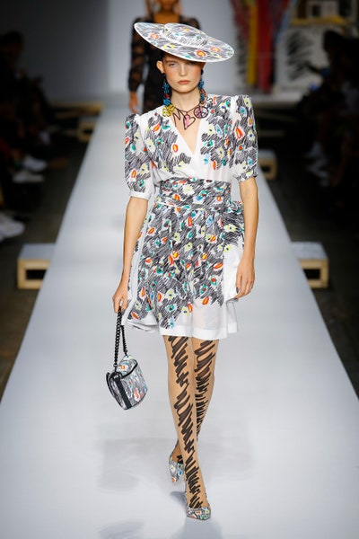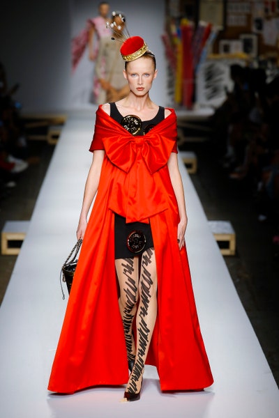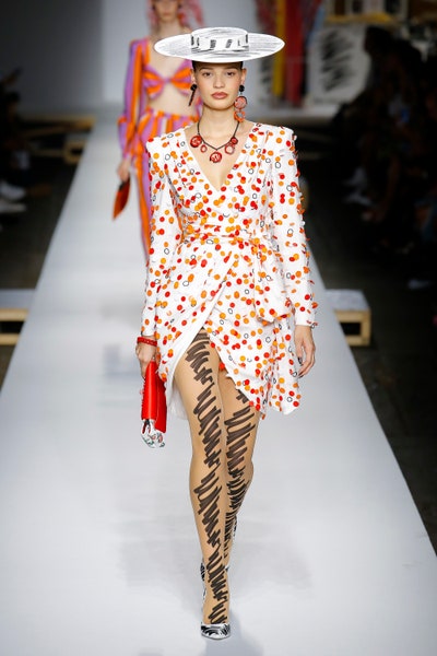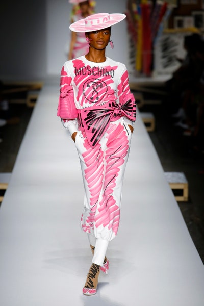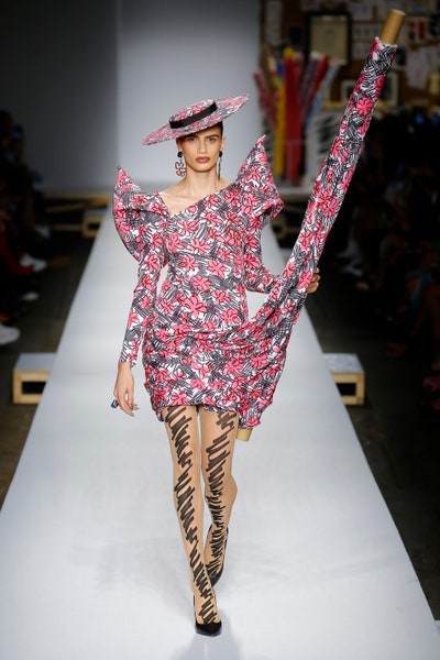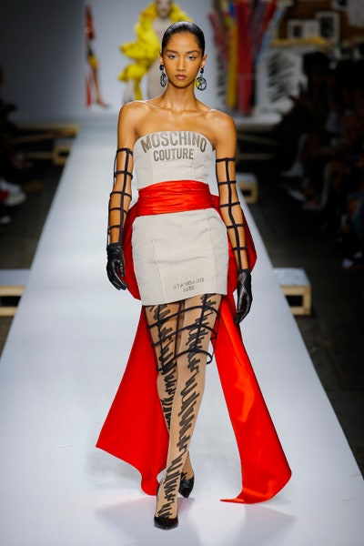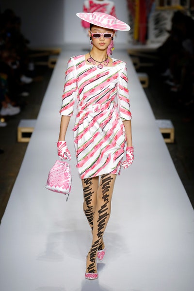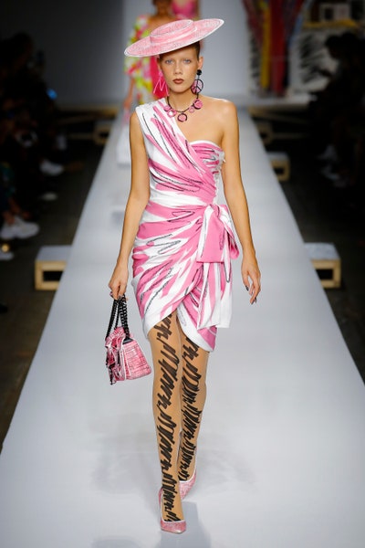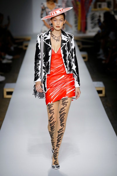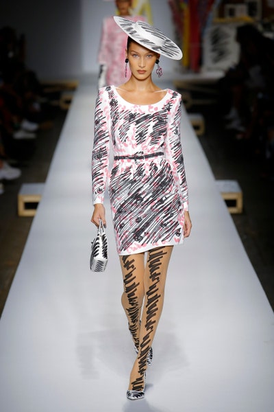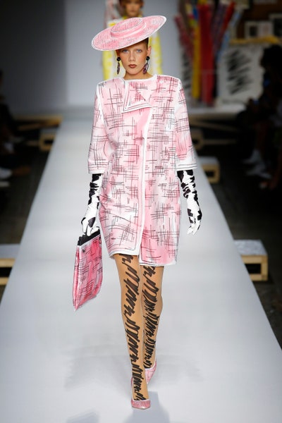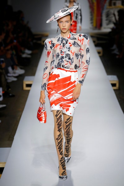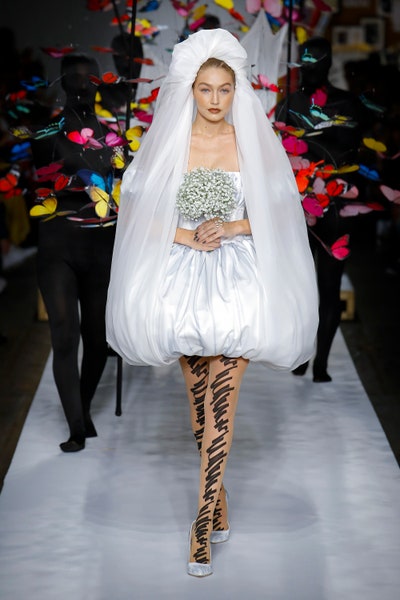 The show started with white dresses and suits sketched with vivid colors paired with matching hats bags and shoes. Moving on to some more detailed looks involved a variety of prints. A red suit with black lapels and coordinated accessories was quite splendid that was also sported by Alia Bhatt a while ago. A lot of 80s signatures like poofy hats, flat hats, and bold colors paired with a trendy Barbie aesthetic. Out of all the quirk and frenzy, the most memorable item for me was the black stockings. An accessible yet standout item with Moschino drawn all over it, Dresses with fabric roll attached to them were slightly infantile but an explicit Behind-the-scenes example. A giant measuring tape worn as a scarf was marvelous while giving off fairly Schiaparelli vibes. A collection deeply rooted in reality as well as fantasy. A quite theatrical finale, Gigi Hadid in a mini poofy wedding dress with a swarm of butterflies following her. A little bit of drama is always fun and with Moschino it is mandatory.