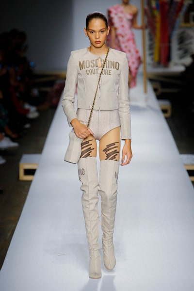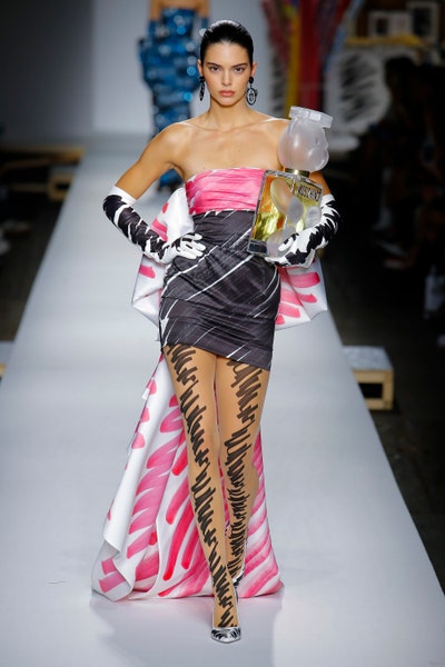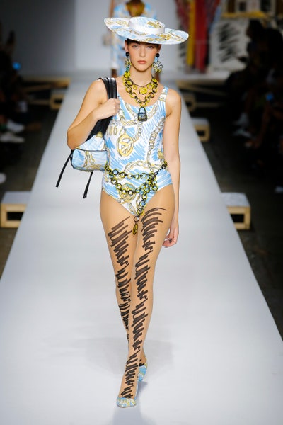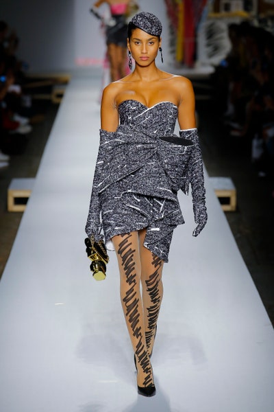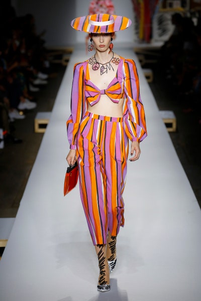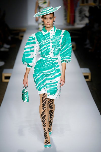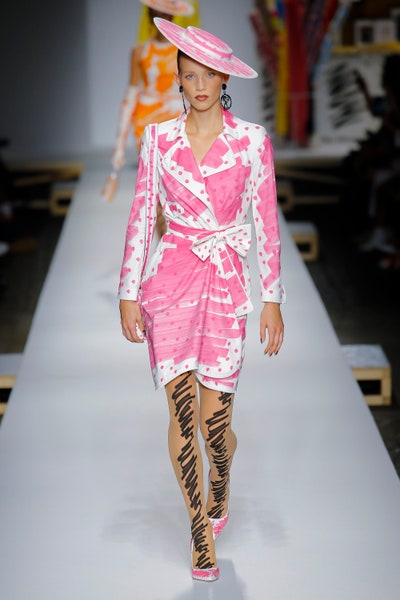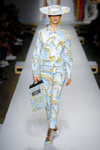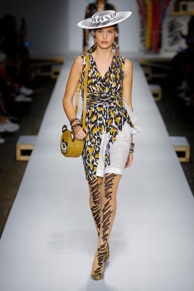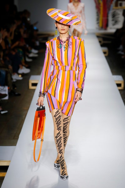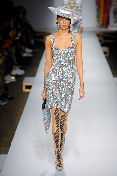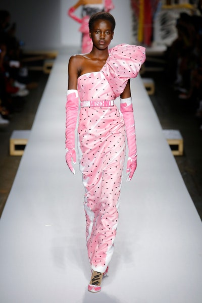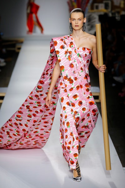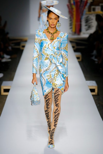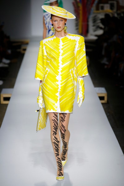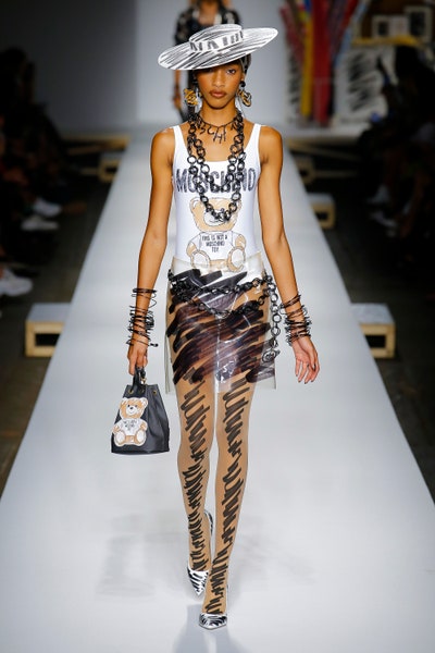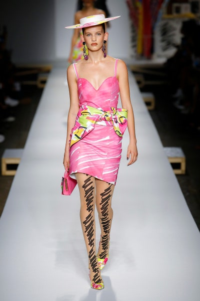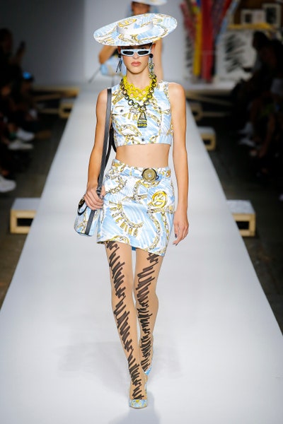 The show started with white dresses and suits sketched with vivid colors paired with matching hats bags and shoes. Moving on to some more detailed looks involved a variety of prints. A red suit with black lapels and coordinated accessories was quite splendid that was also sported by Alia Bhatt a while ago. A lot of 80s signatures like poofy hats, flat hats, and bold colors paired with a trendy Barbie aesthetic. Out of all the quirk and frenzy, the most memorable item for me was the black stockings. An accessible yet standout item with Moschino drawn all over it, Dresses with fabric roll attached to them were slightly infantile but an explicit Behind-the-scenes example. A giant measuring tape worn as a scarf was marvelous while giving off fairly Schiaparelli vibes. A collection deeply rooted in reality as well as fantasy. A quite theatrical finale, Gigi Hadid in a mini poofy wedding dress with a swarm of butterflies following her. A little bit of drama is always fun and with Moschino it is mandatory.