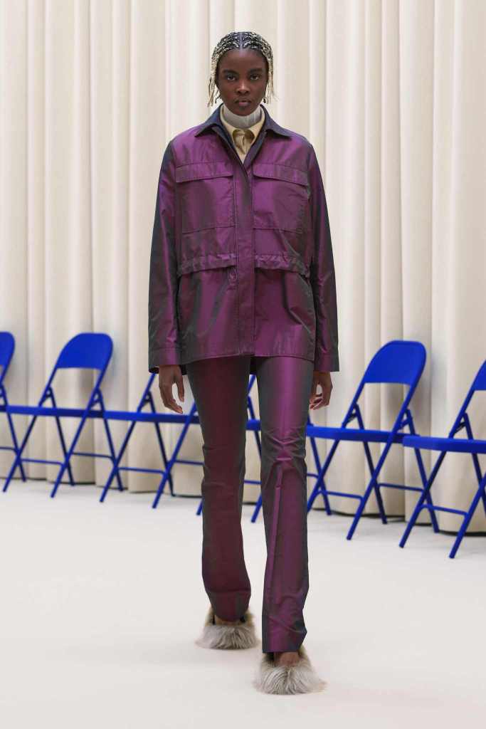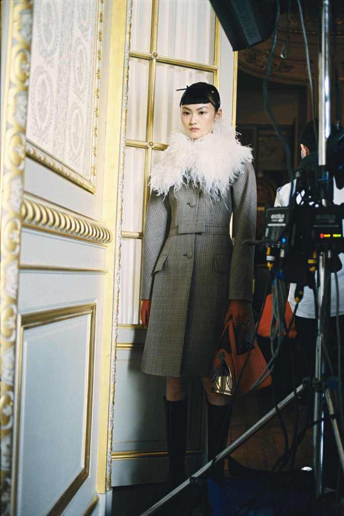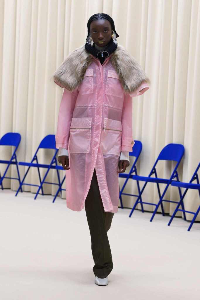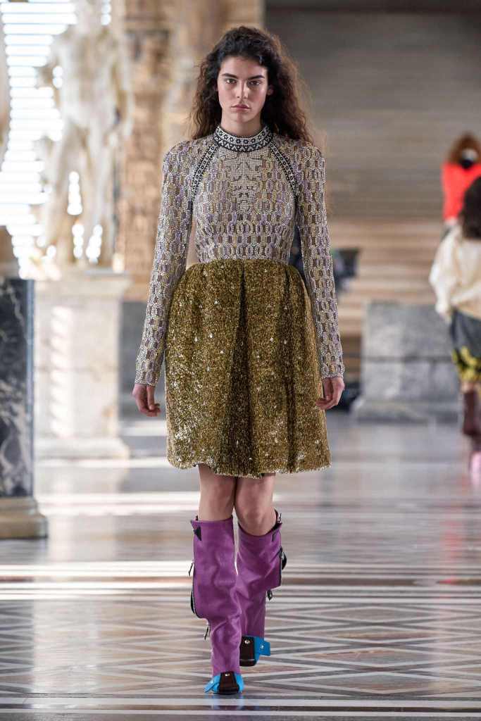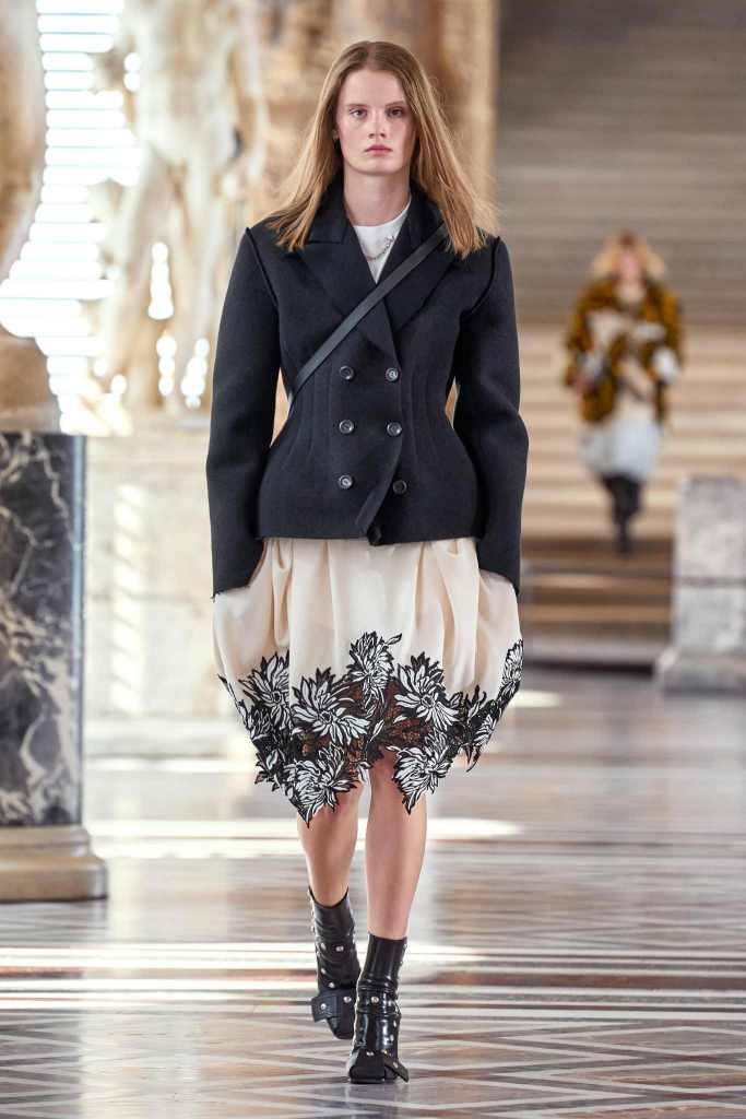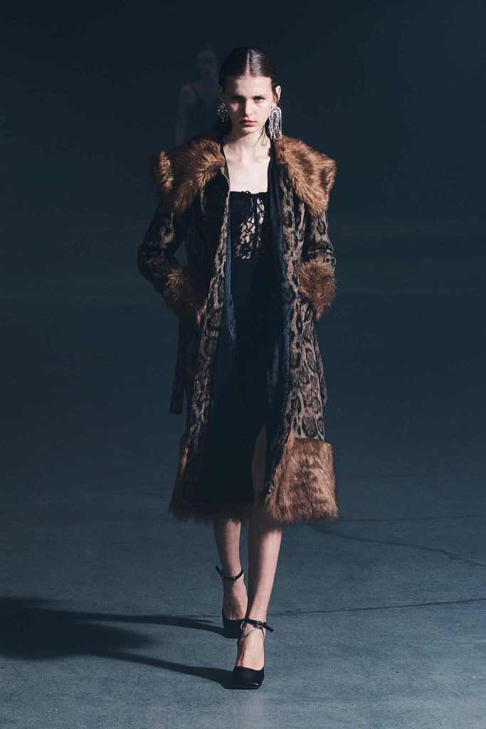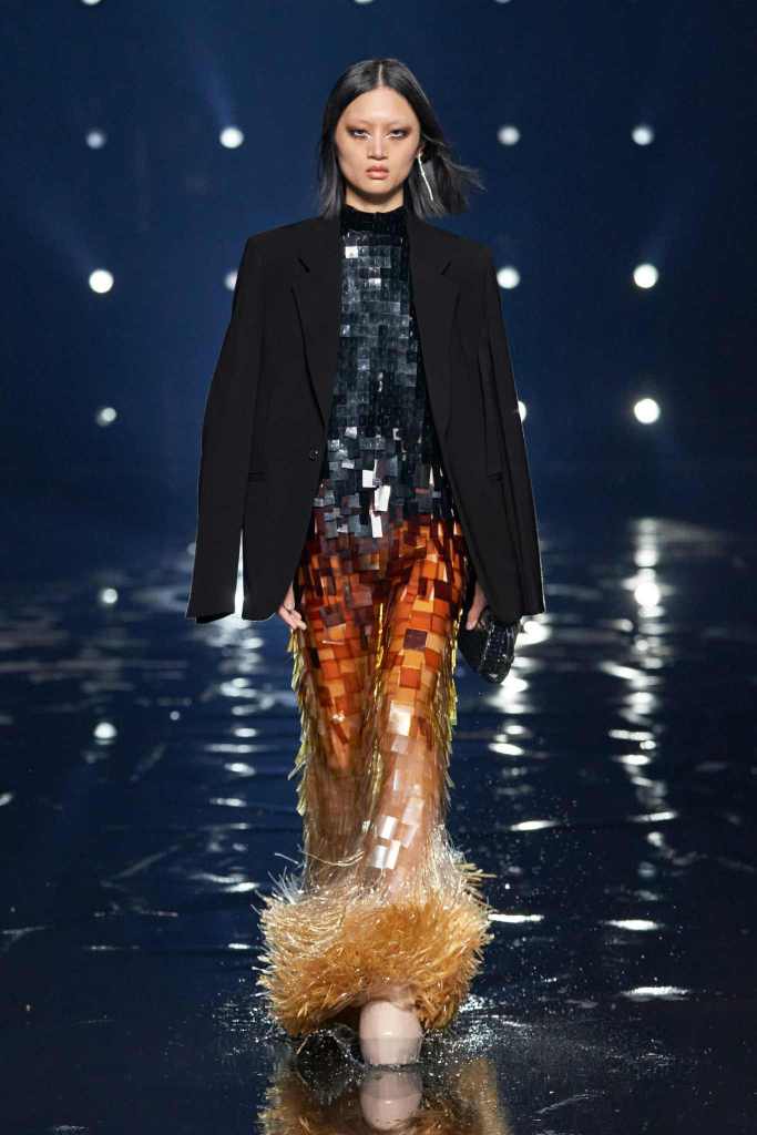 Dries Van Noten: A deeply poetic energy persisted throughout the collection. In retro-romantic colors, there were dramatic elements and animal appeal. It started with a woman wearing a white dress holding a big bunch of red roses and progressed with a focus on movement and dancing. The standout looks included a blue blazer with fur-trimmed sleeves and a seductive pink-red sequined dress.