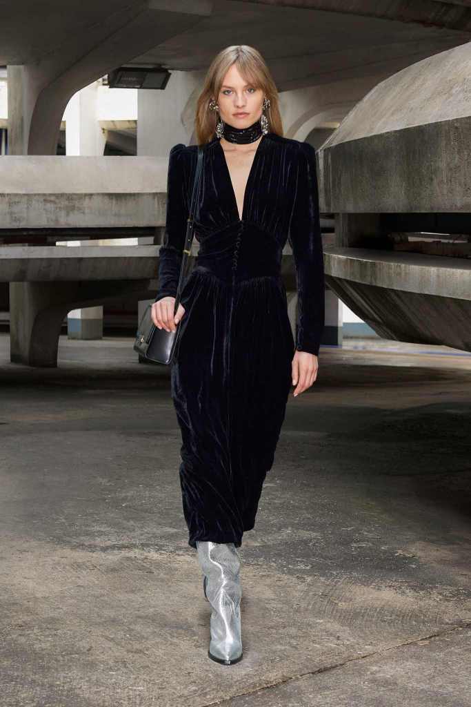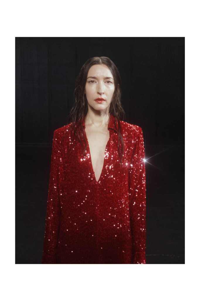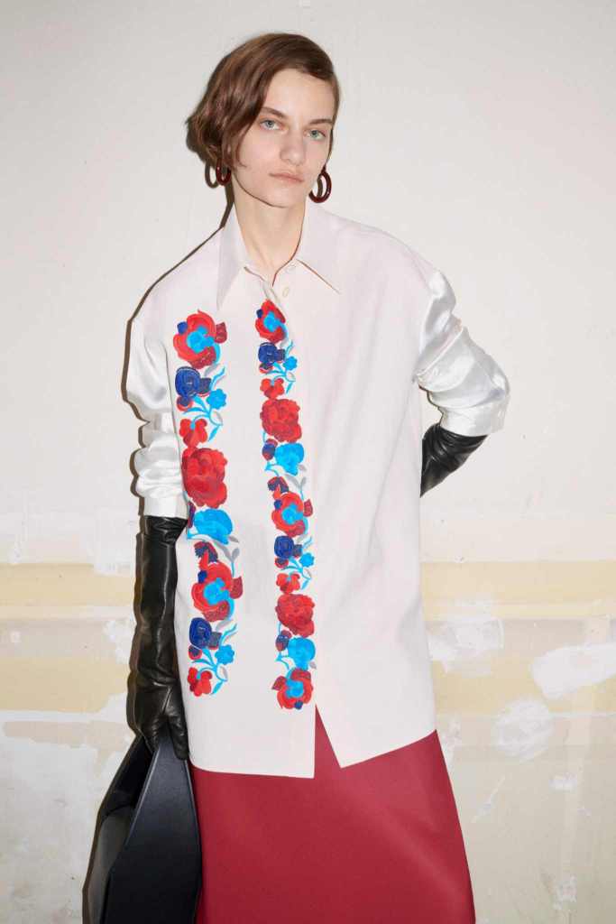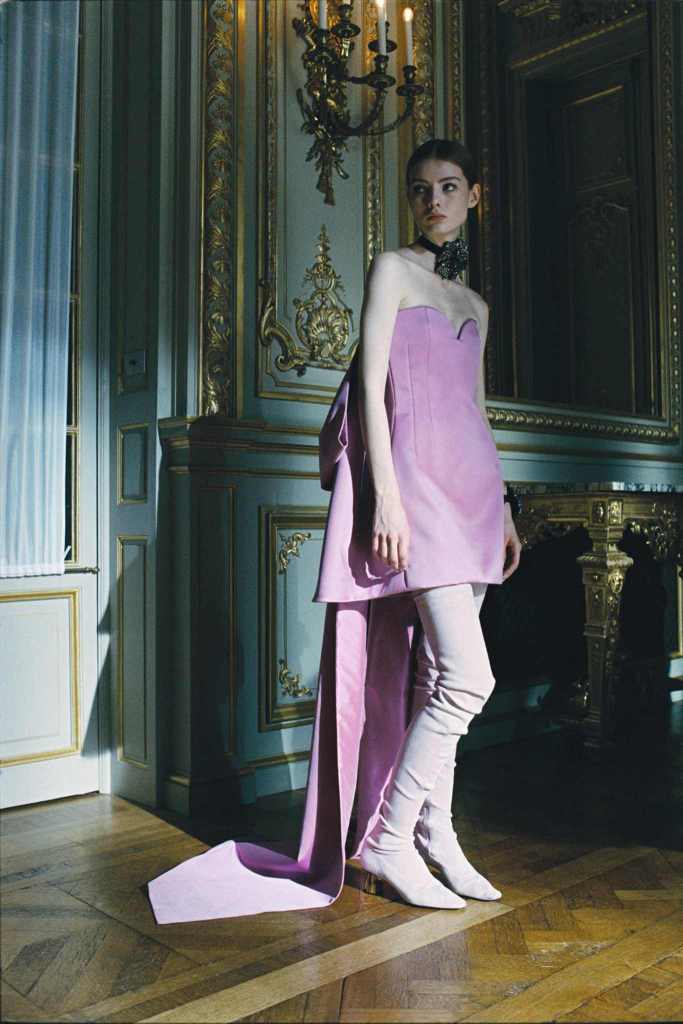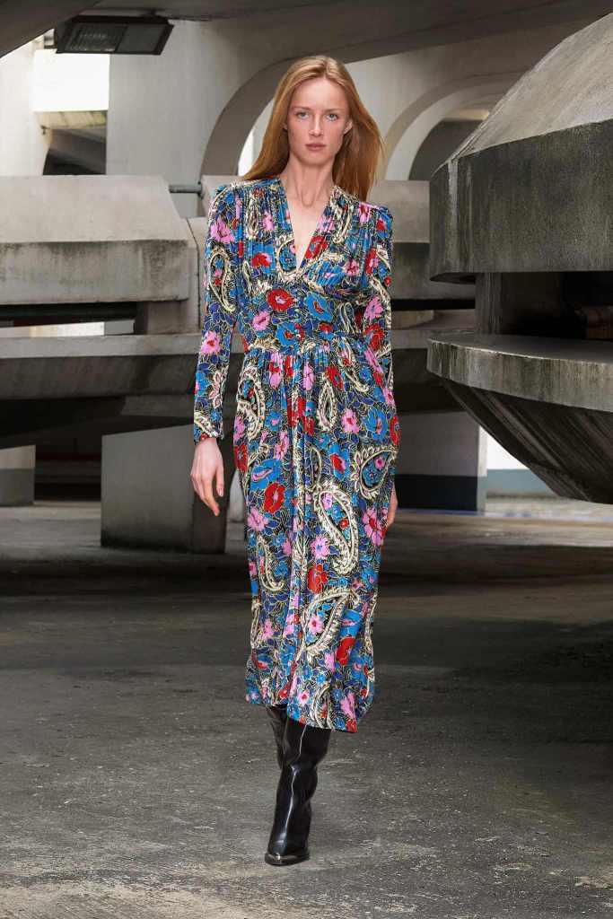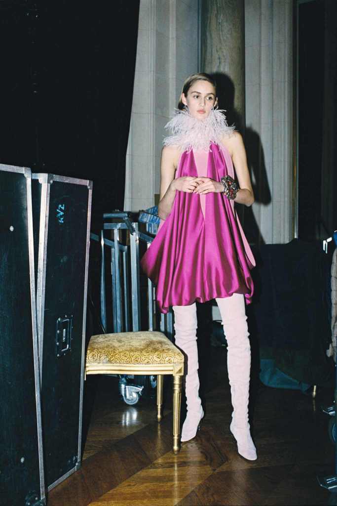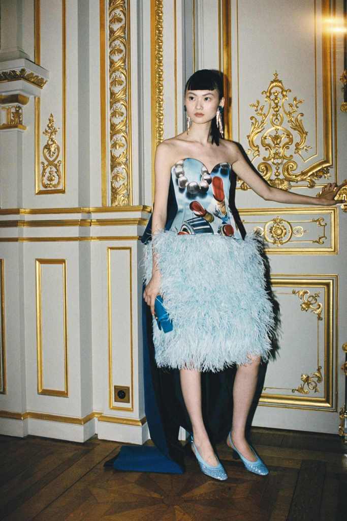 Dries Van Noten: A deeply poetic energy persisted throughout the collection. In retro-romantic colors, there were dramatic elements and animal appeal. It started with a woman wearing a white dress holding a big bunch of red roses and progressed with a focus on movement and dancing. The standout looks included a blue blazer with fur-trimmed sleeves and a seductive pink-red sequined dress.