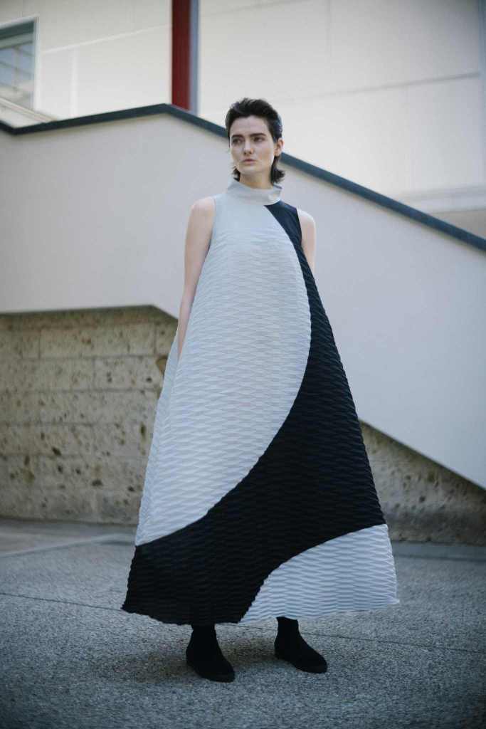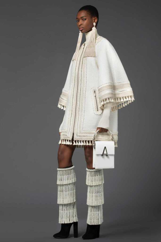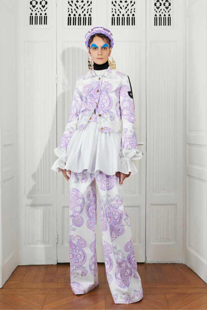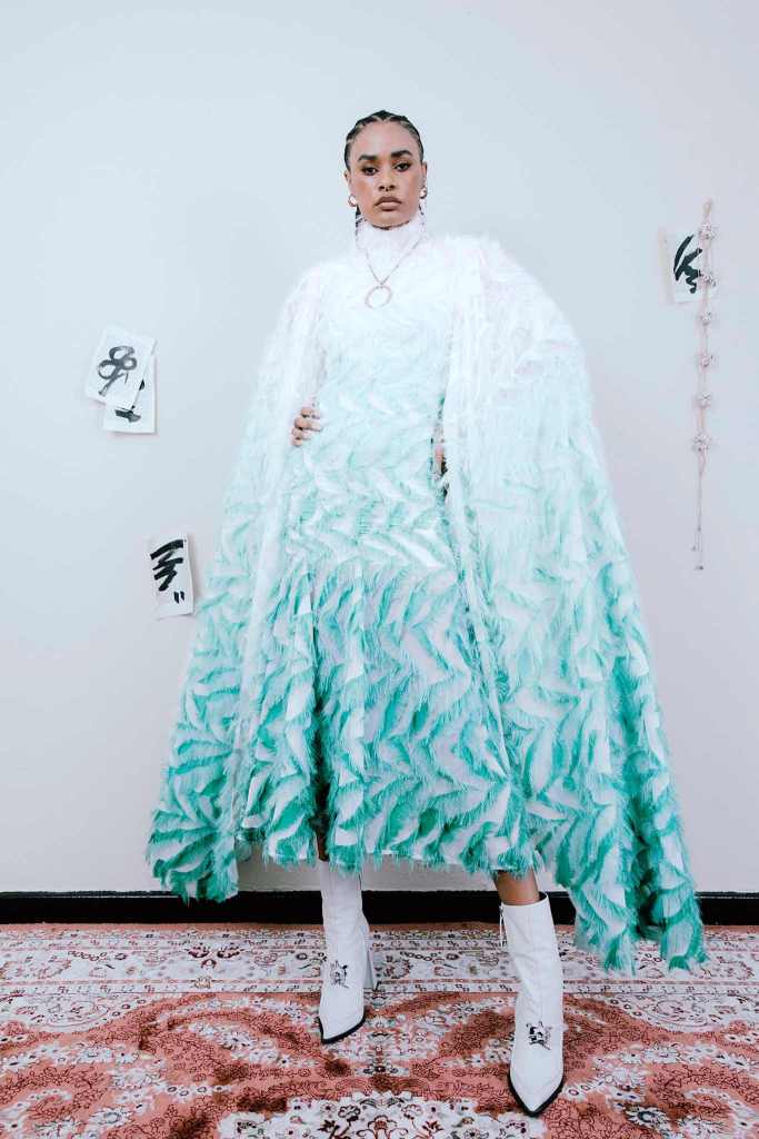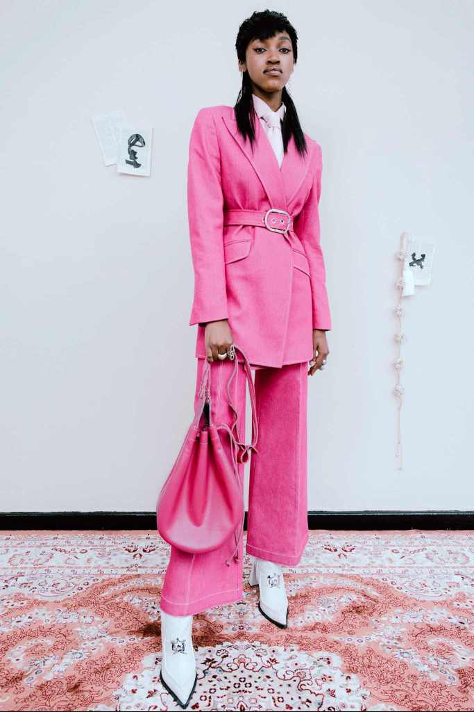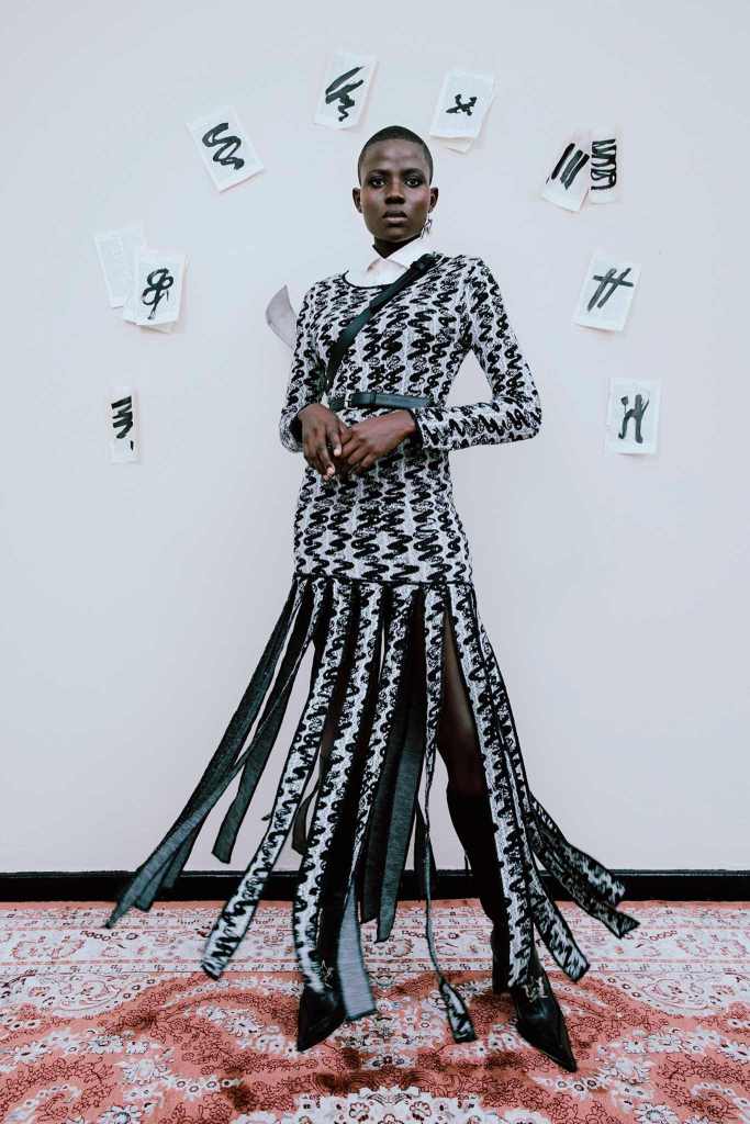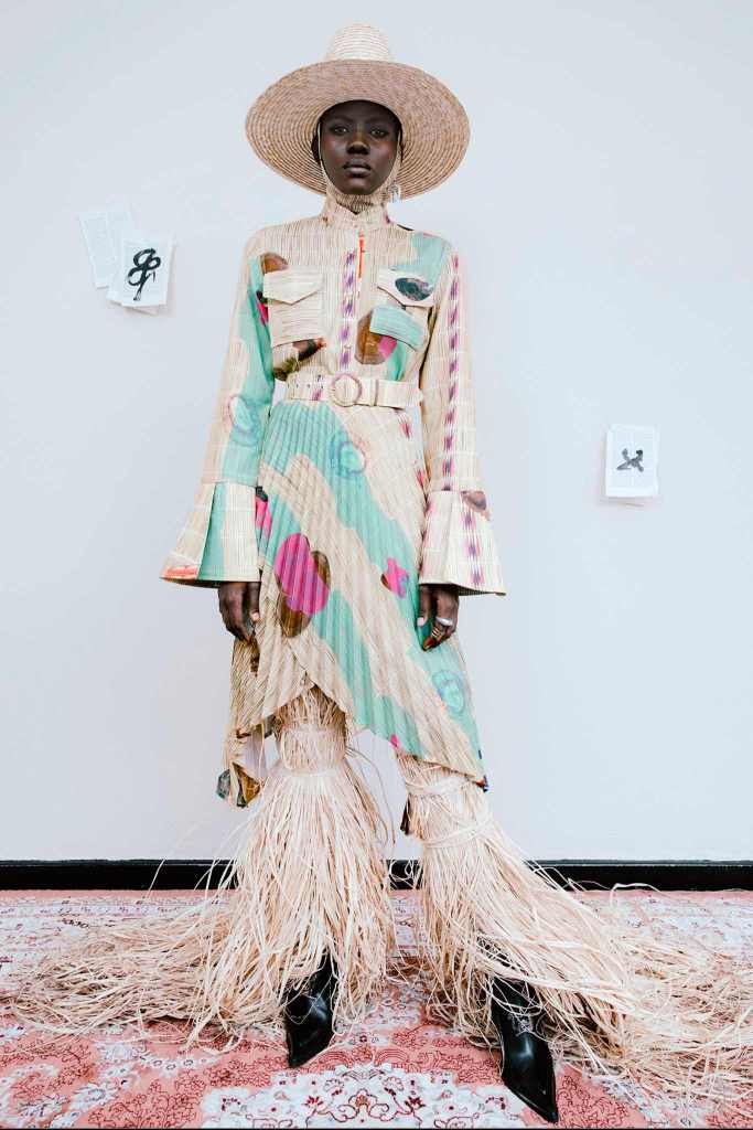 Thebe Magugu: Fringes, colors, hats, pleats, and elements came together to give us some uniformed looks. Highly intellectual subtle references were present throughout the collection; polygraph prints, court statements printed on shirts, tiny microphones, fingerprint-polka dots are just some of them. The show closed with a stunning white dress with a cape over with ombre teal detailing. With just 19 looks Magugu was one of the highlights this fashion week and rightfully so.