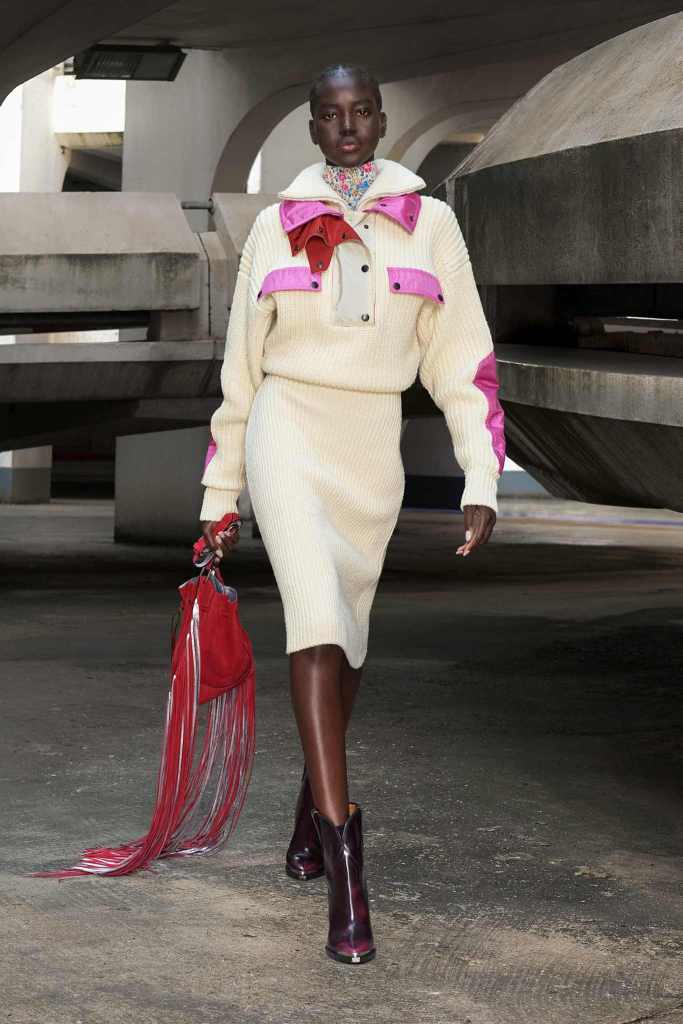 Isabel Marant: Quite a lovely collection by Marant. Big shoulders, bright colors, feisty prints it was all retro here, and I’m here for it. Standout look? A gorgeous dress in shiny vinyl and a knitted white co-ord sported by Adut Akech.