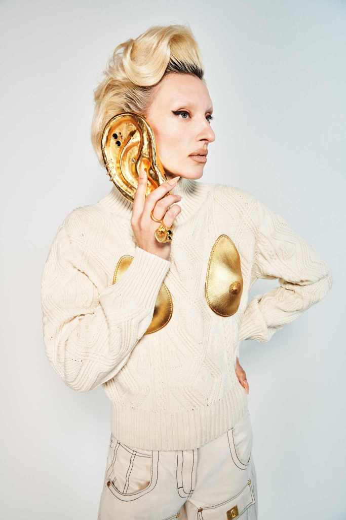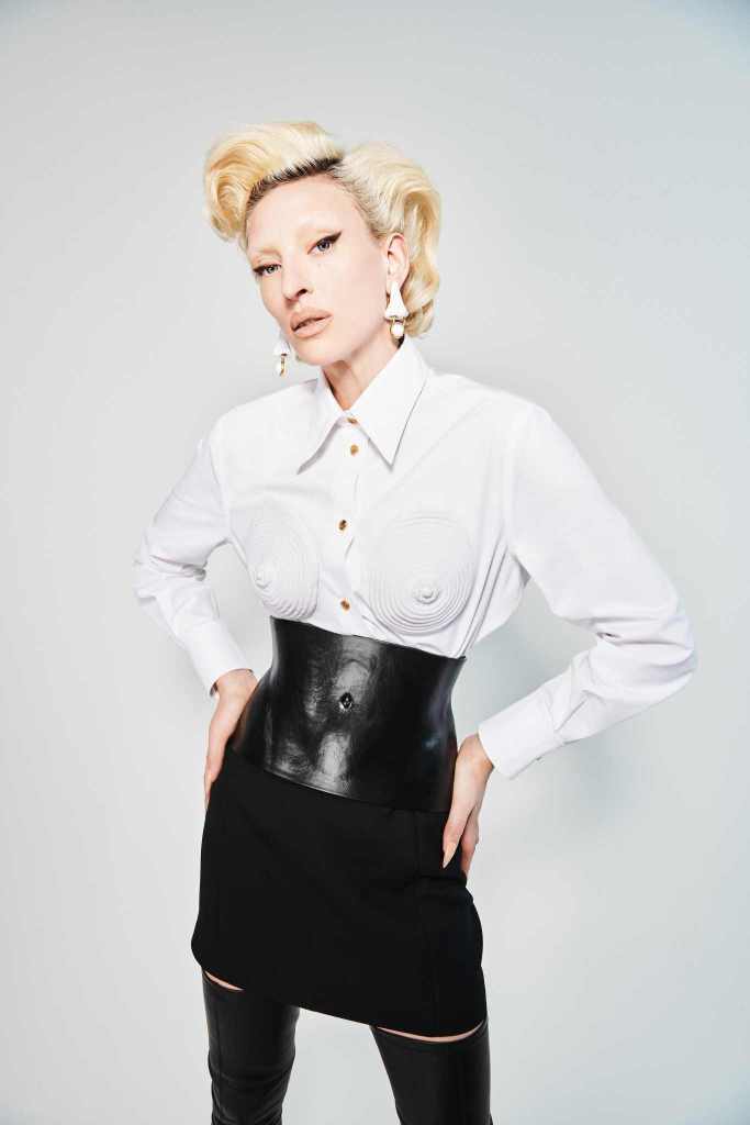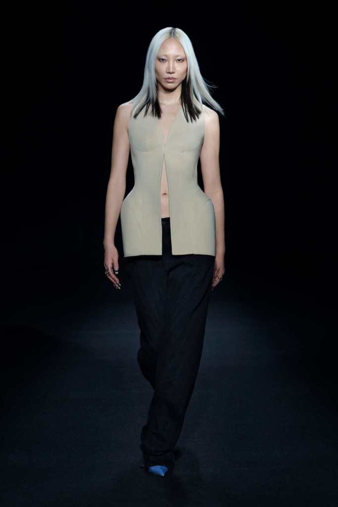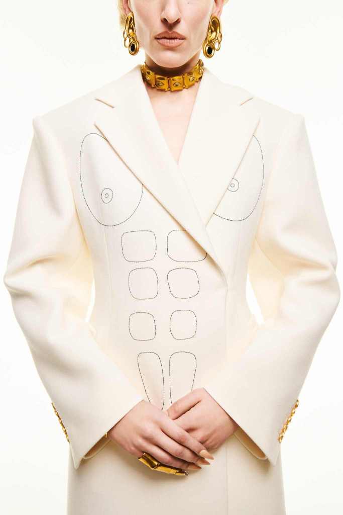 Schiaparelli: This website might soon turn into a Daniel Roseberry fan page and I’m into that idea. Schiaparelli was of course beautiful. Highlights were some hardcore platform boots, gold ear-shaped phone cases, and a striking step towards the normalization and un-sexualization of breasts. A crisp white shirt with highlighted ribbed breasts was a piece of perfection. Gold headpieces, quirky bags, and poetic cuts gave us a Schiap classic.