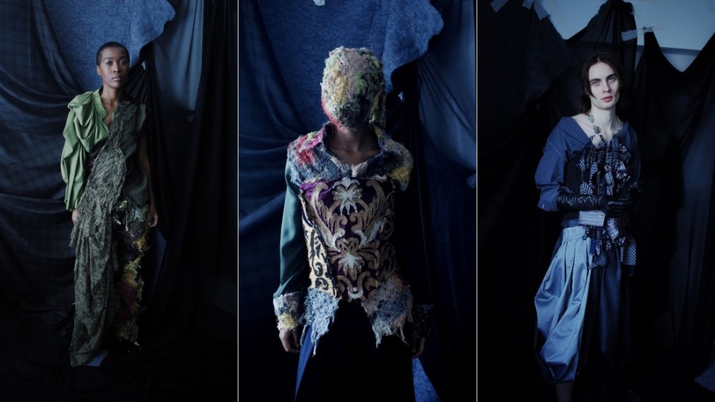 On the other hand, Antonio Castro found inspiration in a folk Portuguese tradition (not to be shady, but here we can see how they’re both collection have a connecting dot AKA they were inspired by the designers’ roots). “I created these characters from this ritual—it’s a Celtic tradition like the wicker man. They get transported by a glitch that takes them from this initiation to these other Zoom calls that are happening, I cut vintage garments and rewove them. I made corsets and shirts, but I don’t think in gender. It was a challenge at first, but it was also very good to focus, to construct on my own body. Because of that, I think the outcome was much richer.” if I am being completely genuine Castro’s collection might have been my favorite. The dark blue set was to die for. His attention to detail gave an extra dimension to his work. Castro created a seamless balance in the silhouettes; he created a contrast between the “busy silhouettes” and simpler; more polished ones. After seeing his work I can tell that Antonio understands fabrics and how to work with them. Overall, the collection is absolutely flawless and I have no choice but to stan. Bravo Antonio!
