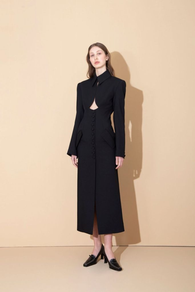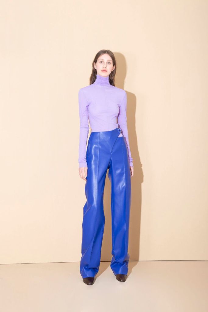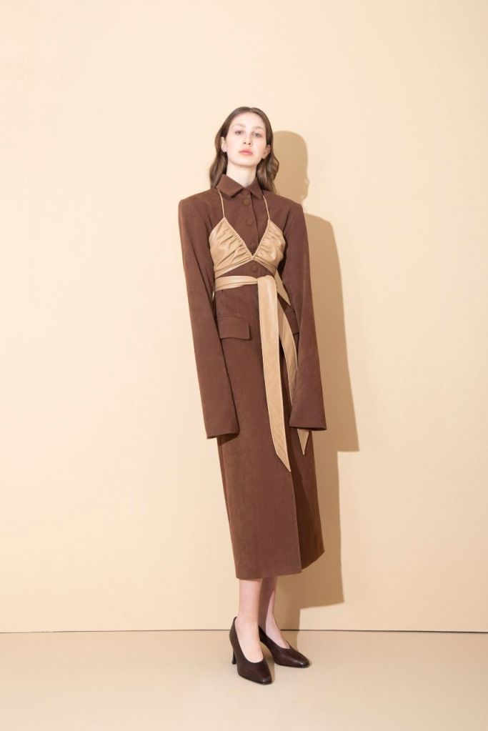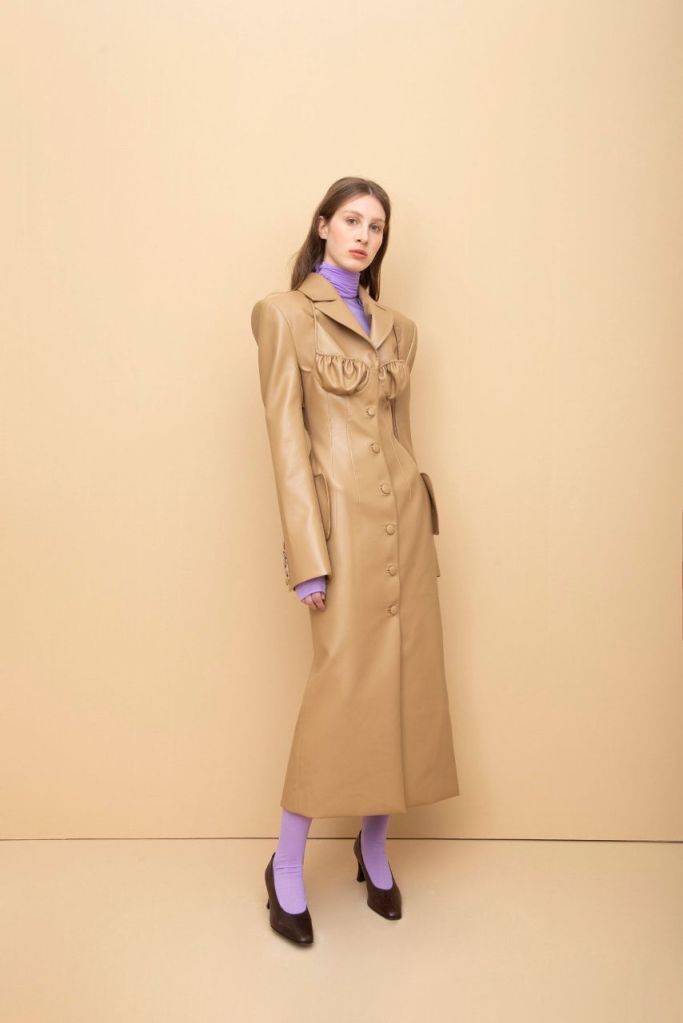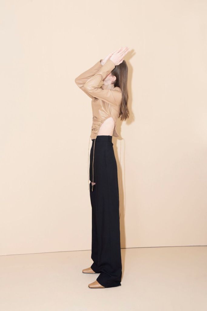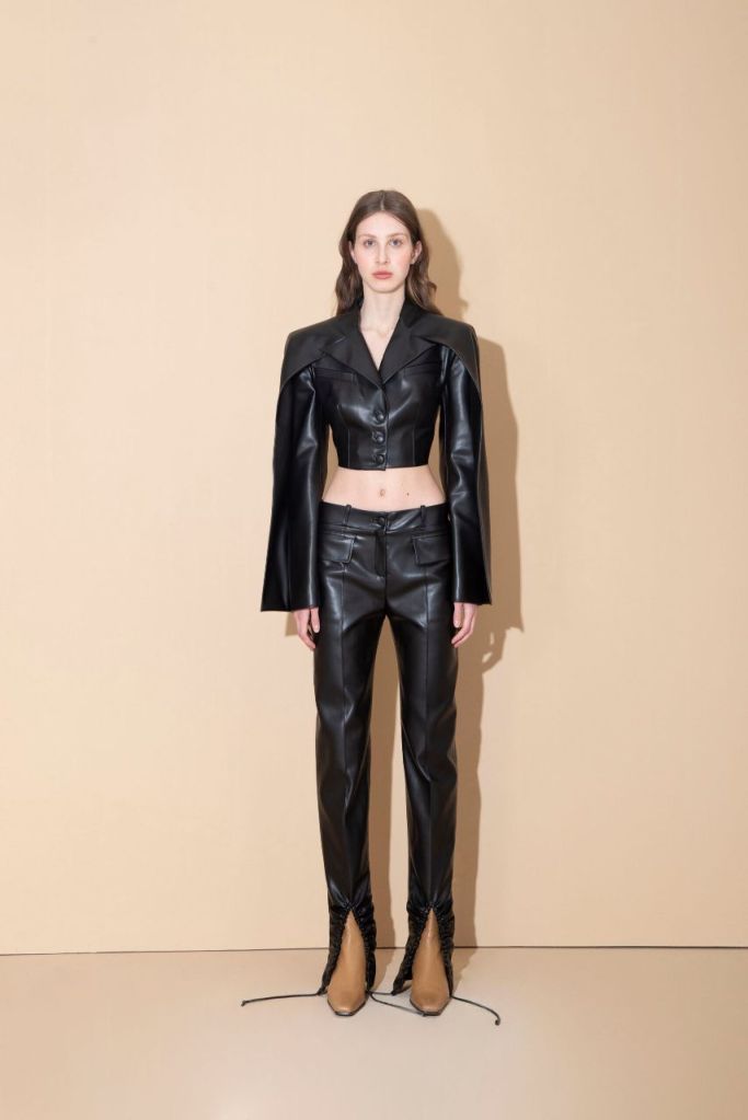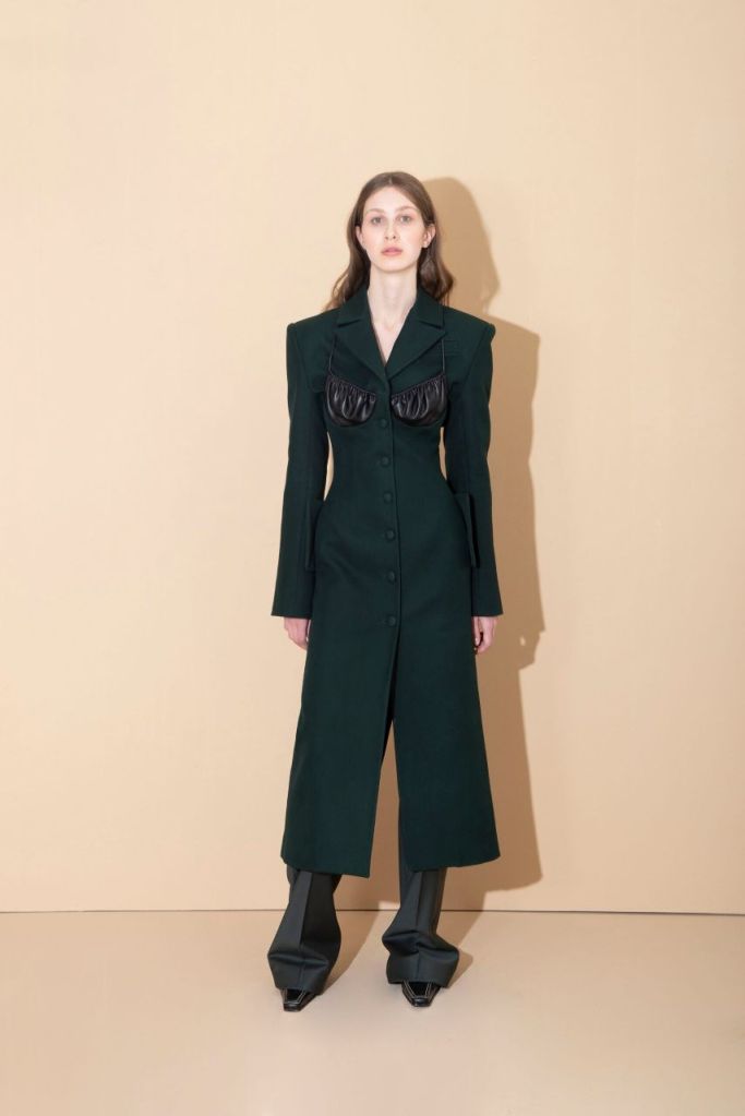 The colors in this show was substantially diverse with neutrals, a brilliant Cobalt blue to statement red and pretty pastels it had something for everyone. The collection starts with some suits with straight pants and a structured blazer nipped at the waist, with more vintage energy these suits were traditional an idea but dynamic in details. A look of Black faux leather pants and crop jacket was quite rockstar chic and Two blazer dresses with underarm cutouts and ruching were beautifully made. Then came a faux leather blue suit dress with a bra detail over it; it was delightful. Clean lines, minimal silhouettes, sharp cuts, brilliant fabric manipulation are just some of the strengths of Akhalkatsishvili and leveraged all of them in this collection. Looks with similar elements followed; leather diamond-shaped cutouts and precise silhouettes with sharp details. A faux leather bralette worn over a wool coat dress is the perfect blend of conservative looks and a brazen sex appeal which is a persistent concept throughout the collection. Some more trench coats with attached bra details again were magnificent.