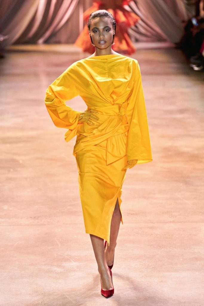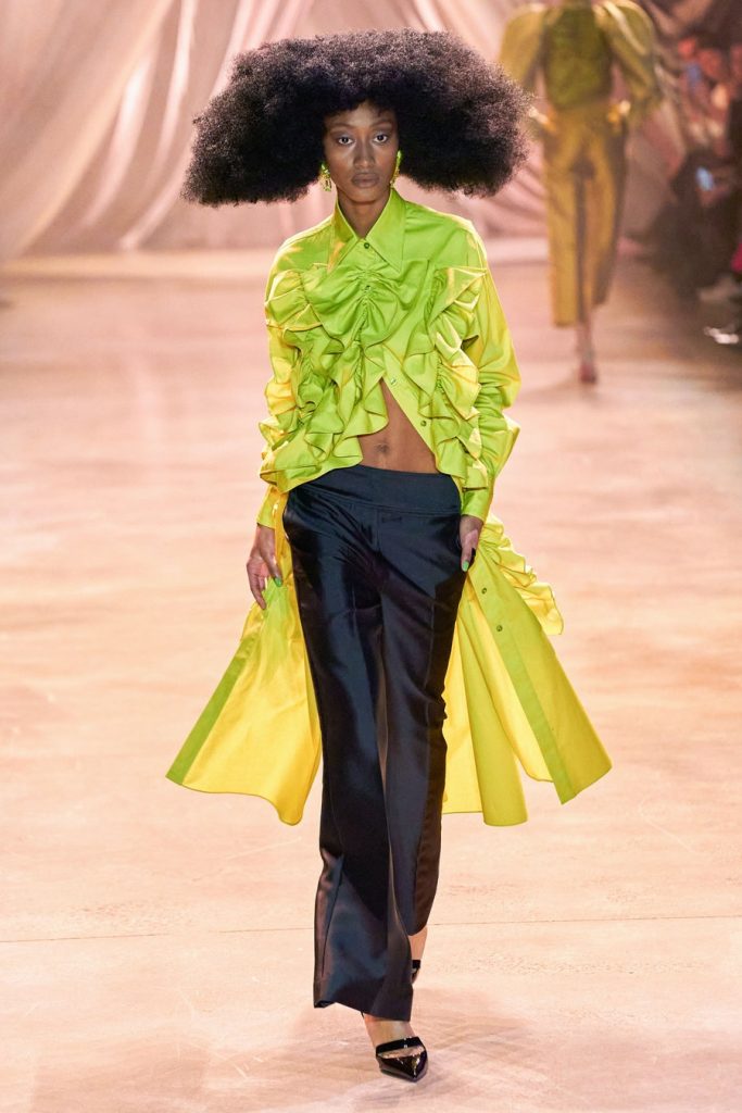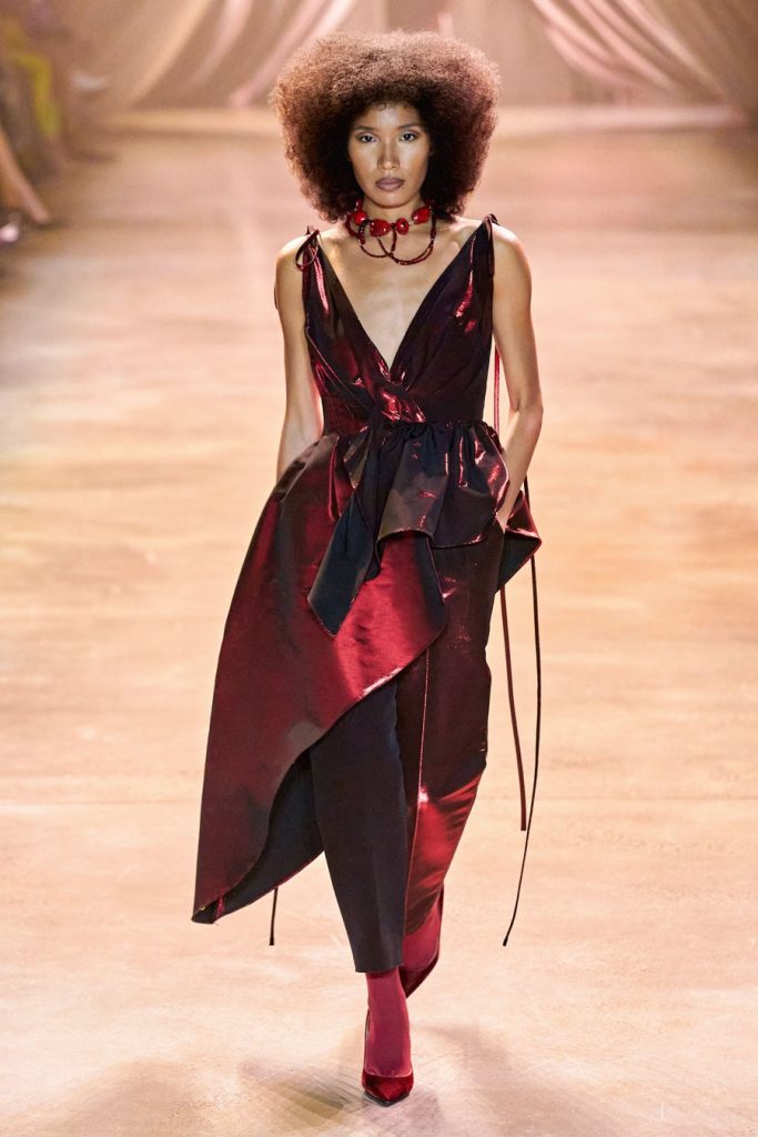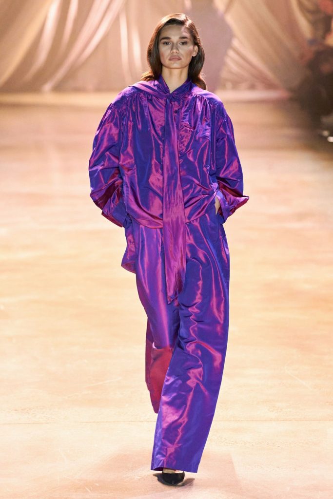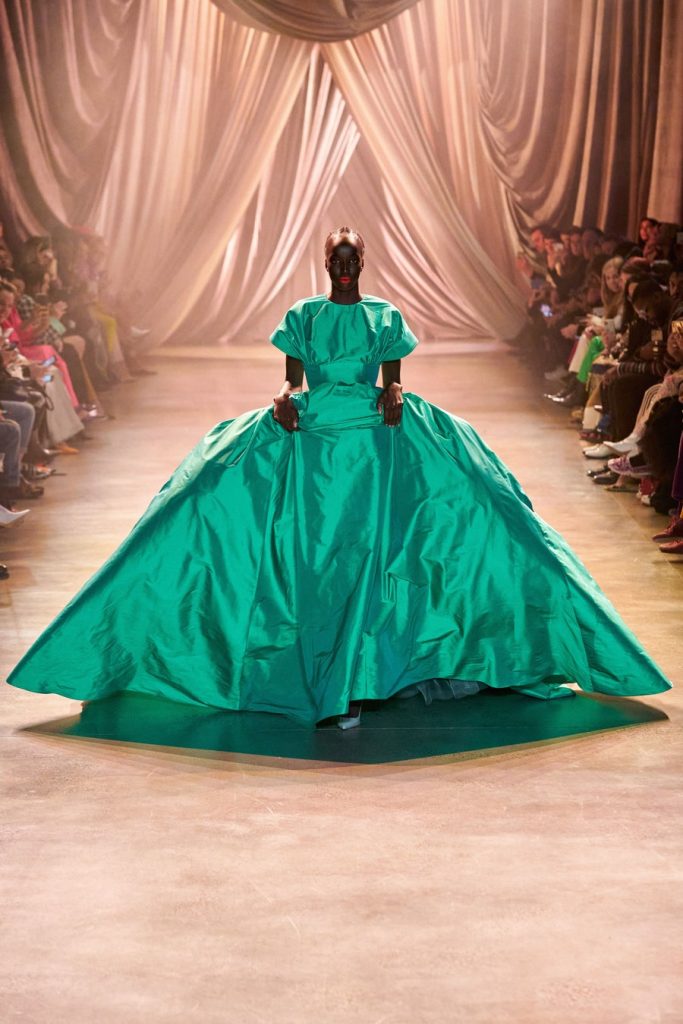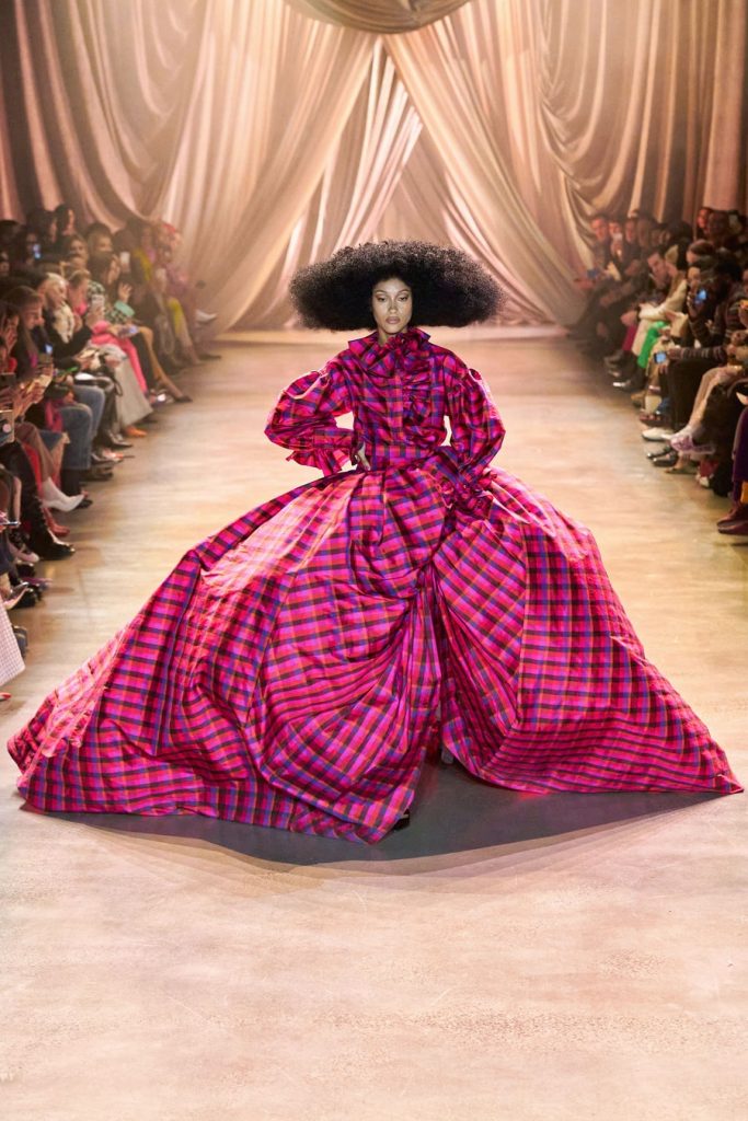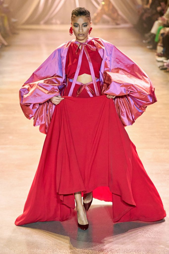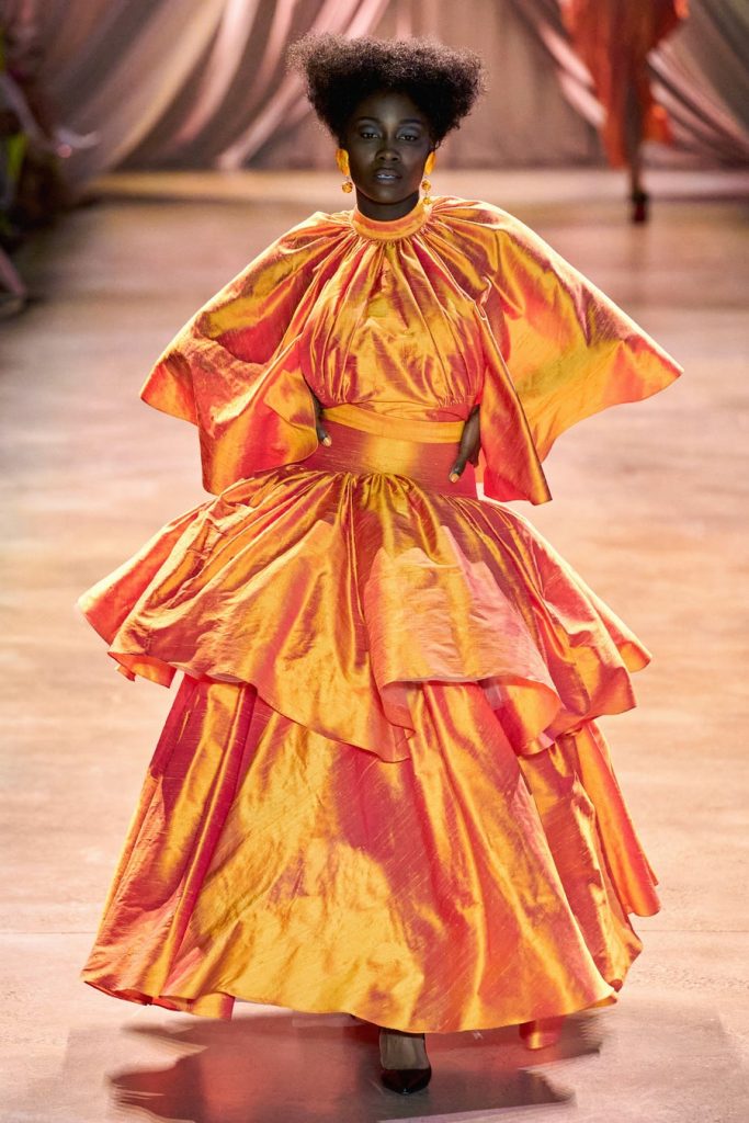 Comprised of dazzling colors, voluminous silhouettes, crinkled textures, sparkling fabrics; Christopher John Rogers Fall 2020 was a defining fashion moment. Trash bags was one of the inspirations of this glorious collection along with Madame Grès, pink and orange carryout bags, and monochromatic church wear. The set design by Sauras + Garriga was old-school glam meets cozy comfort, an absolute beauty.