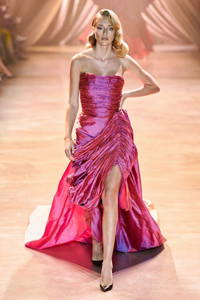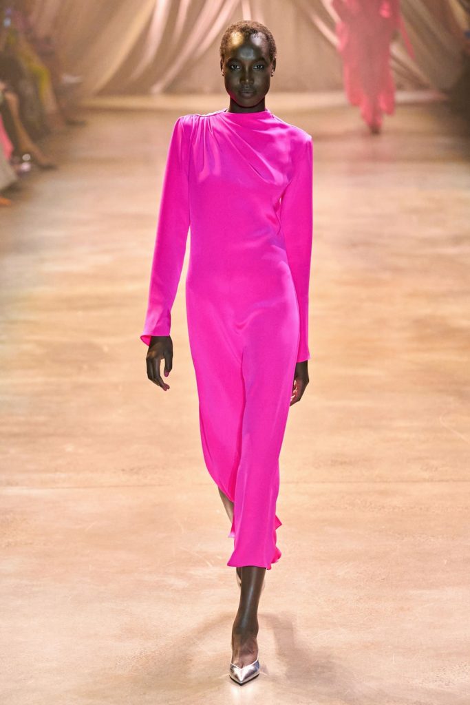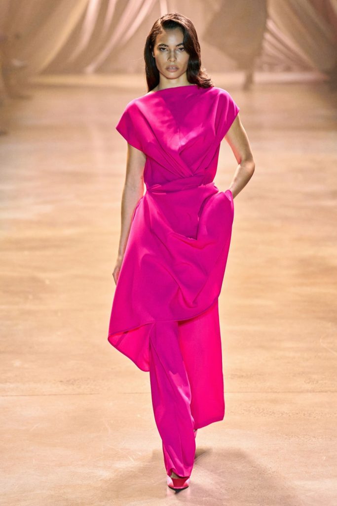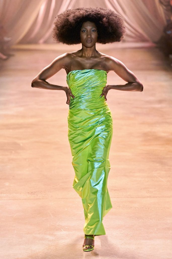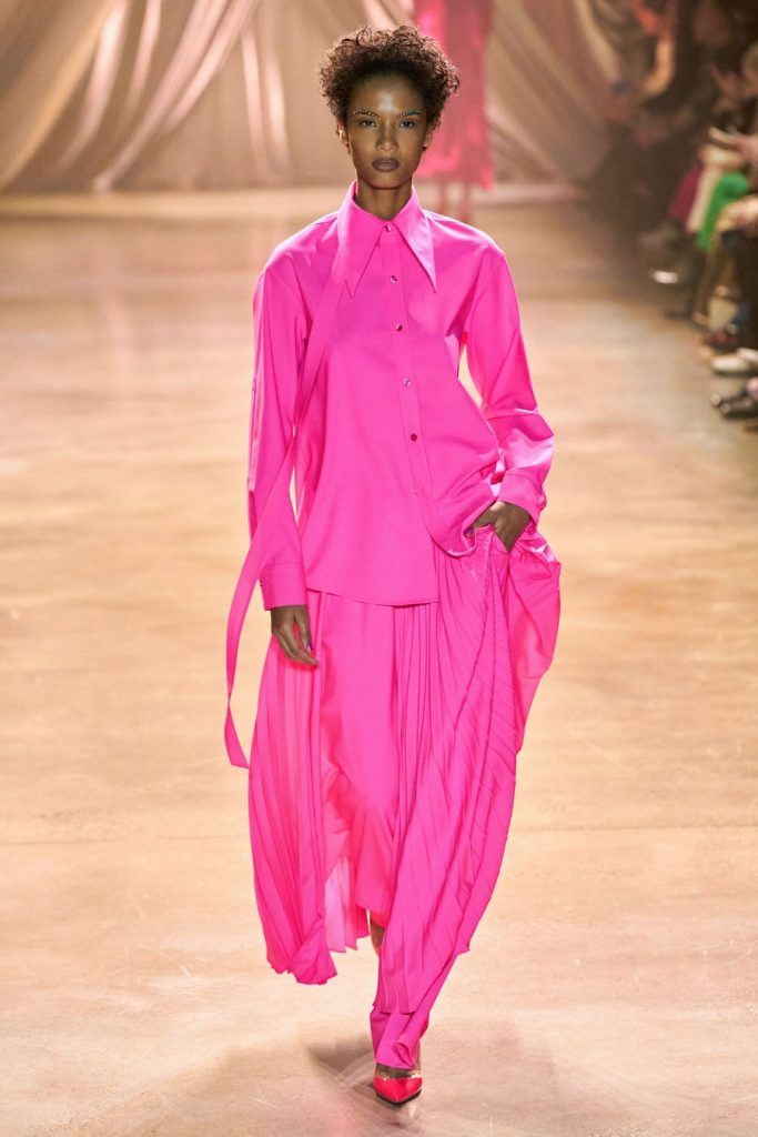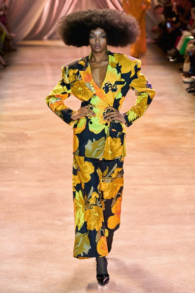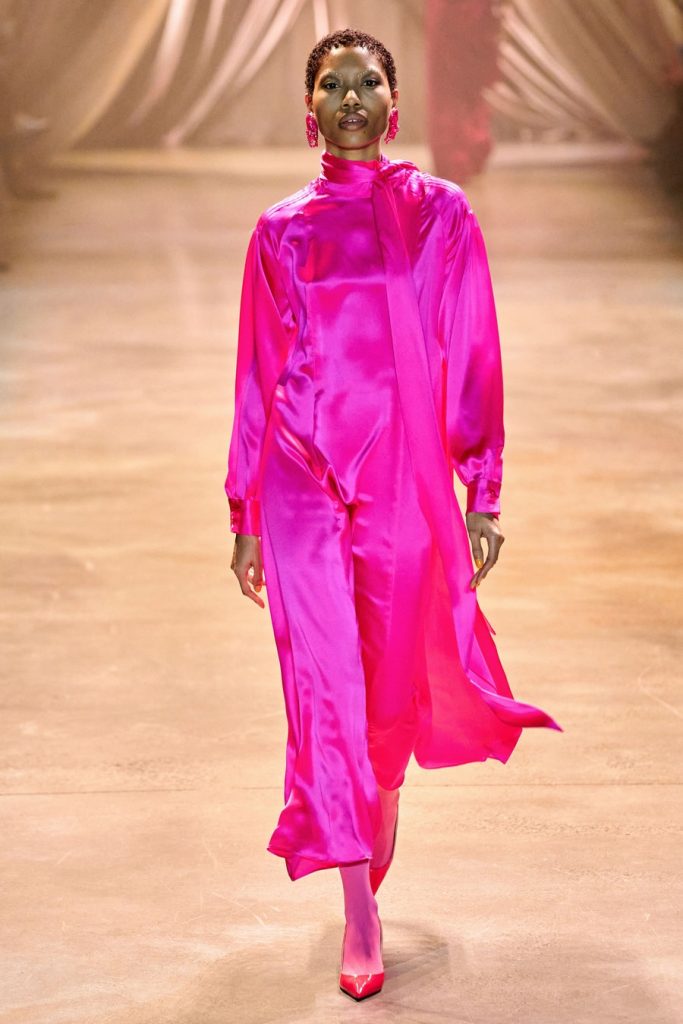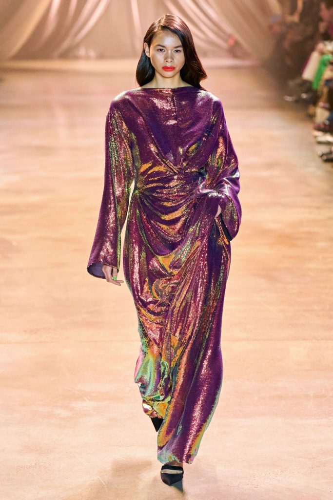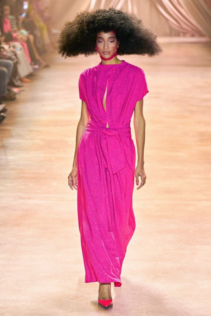 Comprised of dazzling colors, voluminous silhouettes, crinkled textures, sparkling fabrics; Christopher John Rogers Fall 2020 was a defining fashion moment. Trash bags was one of the inspirations of this glorious collection along with Madame Grès, pink and orange carryout bags, and monochromatic church wear. The set design by Sauras + Garriga was old-school glam meets cozy comfort, an absolute beauty.