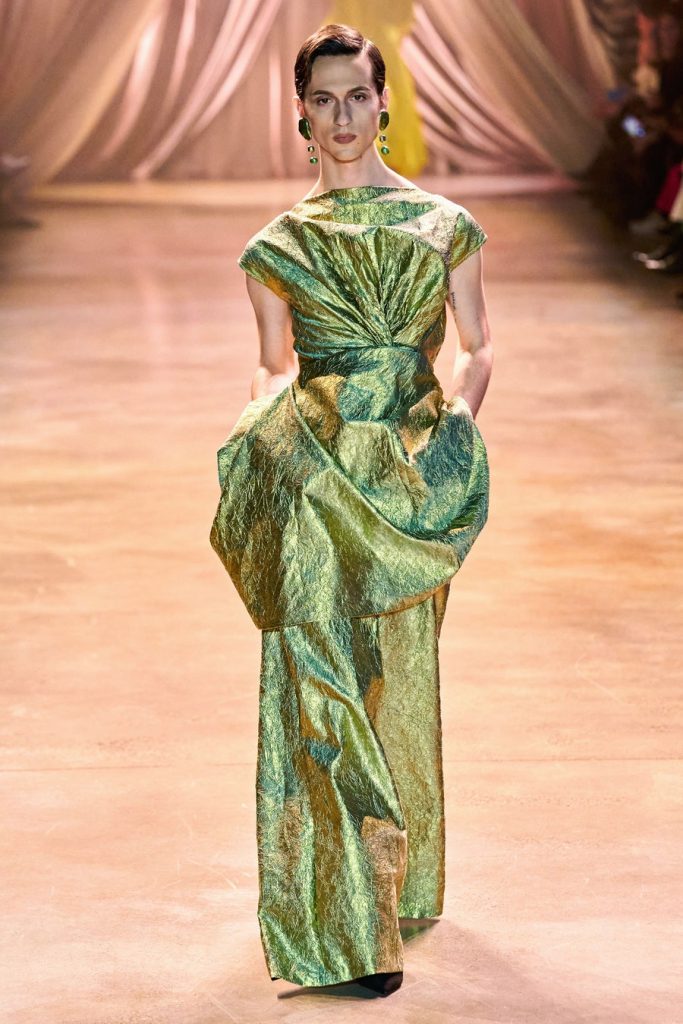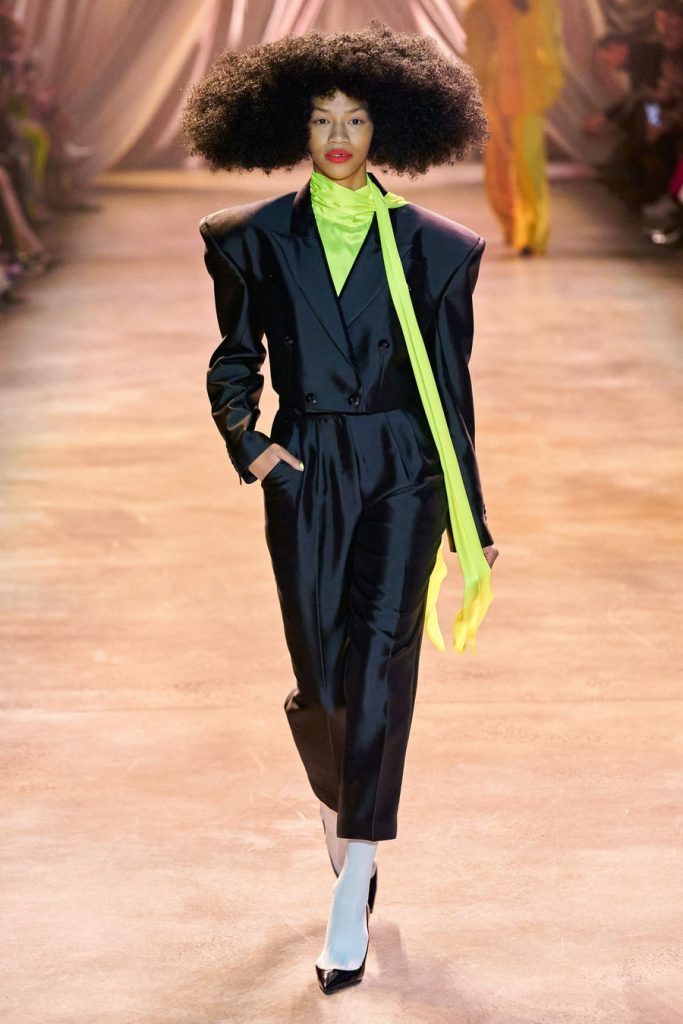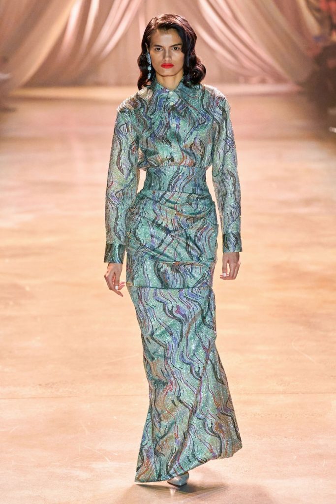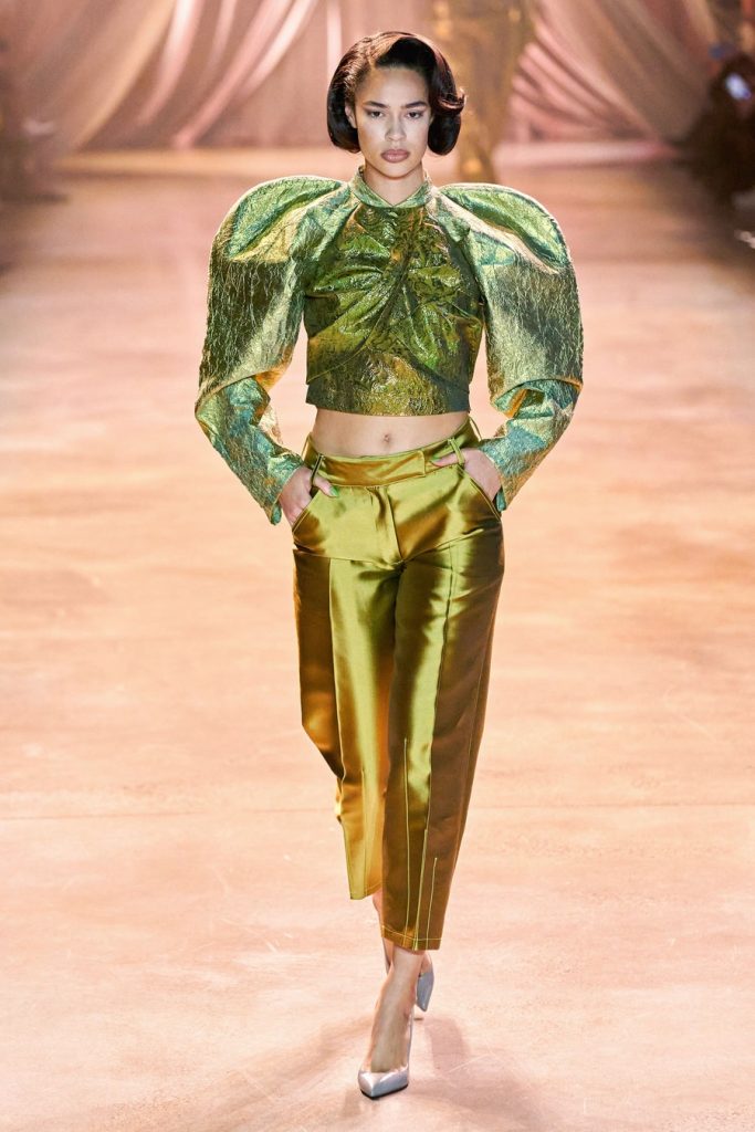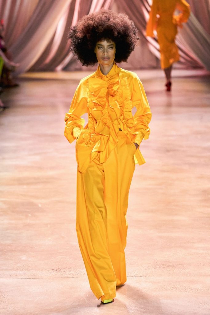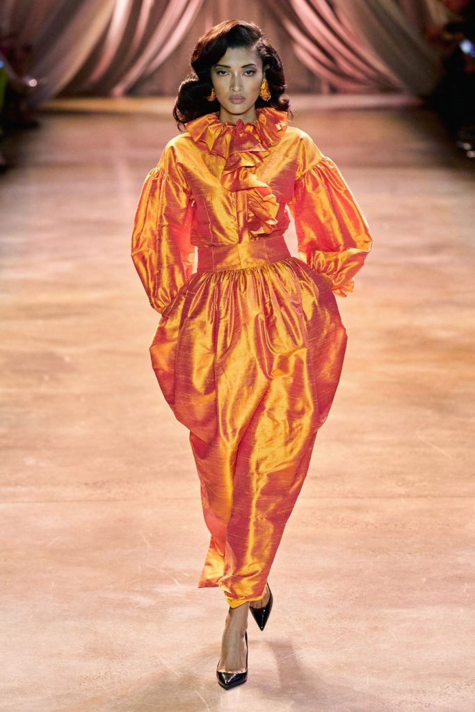 CJR’s extravagant silhouettes included exaggerated sleeves, cinched waists, dramatic skirts, big shoulders, and ruffled collars. The colors in this collection, Magnificent. Orange, yellow, olive, neon, violet, fuchsia, red, maroons, pink; all of them on acid times a hundred. We saw promising tailoring in some gleaming suits and some intense monochromatic color-blocked suits in shades of yellow and red. Each look here was better than the next, among these came a big blazing brilliant teal gown. Every element blends seamlessly throughout, the light, the music, the colors, the shine, the drama, and the love.