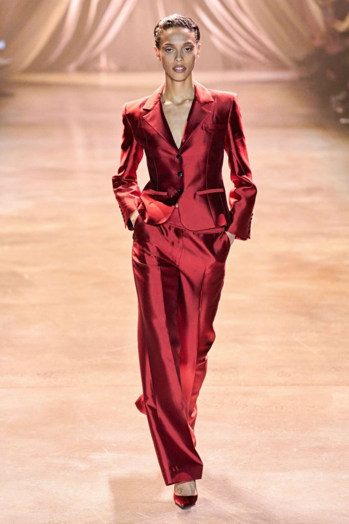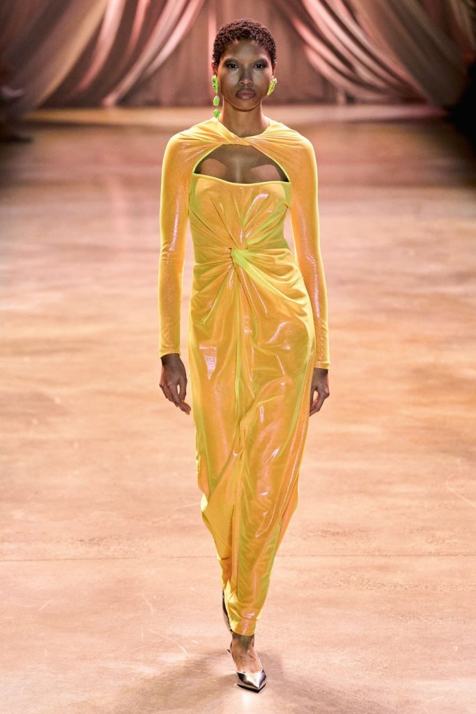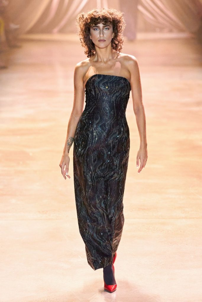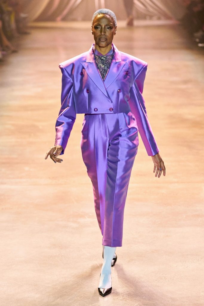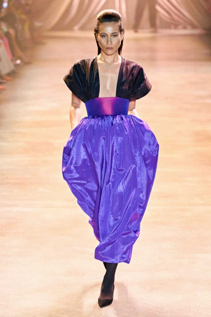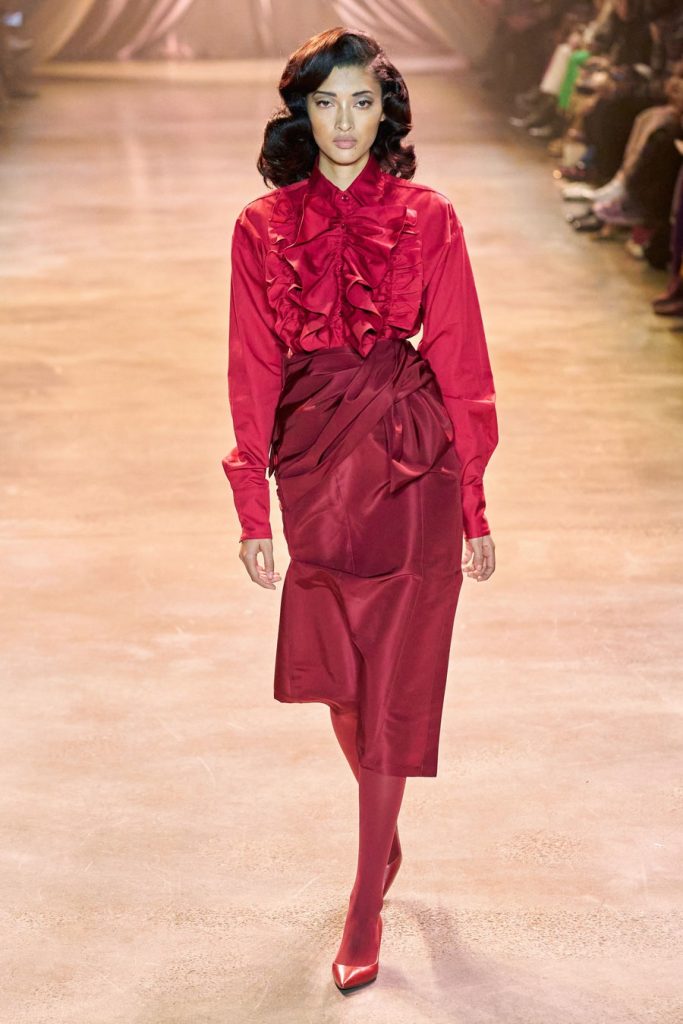 CJR’s extravagant silhouettes included exaggerated sleeves, cinched waists, dramatic skirts, big shoulders, and ruffled collars. The colors in this collection, Magnificent. Orange, yellow, olive, neon, violet, fuchsia, red, maroons, pink; all of them on acid times a hundred. We saw promising tailoring in some gleaming suits and some intense monochromatic color-blocked suits in shades of yellow and red. Each look here was better than the next, among these came a big blazing brilliant teal gown. Every element blends seamlessly throughout, the light, the music, the colors, the shine, the drama, and the love.