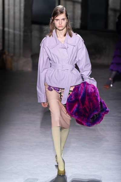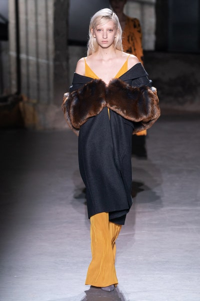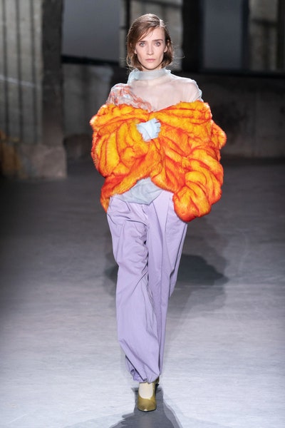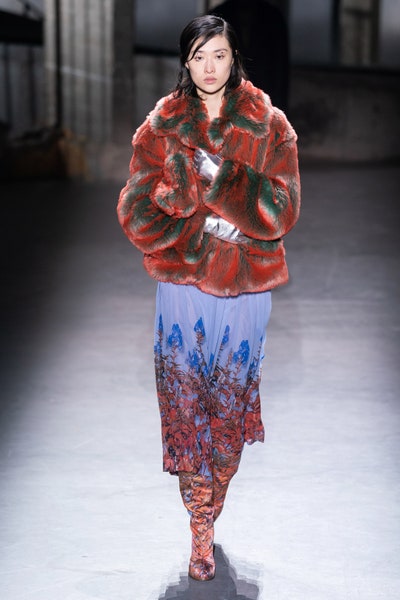 Faux fur stoles and bags ranged in colors like neon orange, browns, and an elegant pink-purple; Boots were a staple along with Lucite heels. Chunky scattered glitter eye makeup was summed up the essence perfectly.