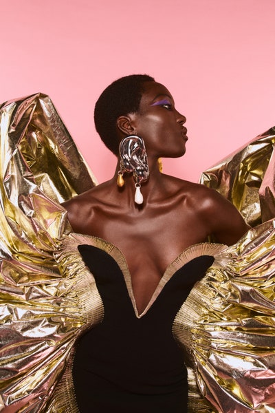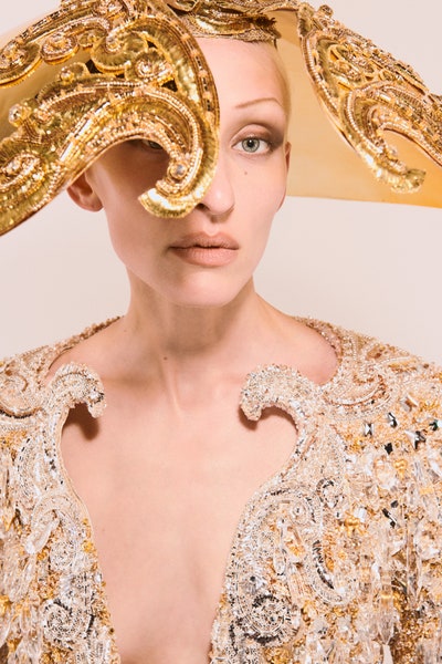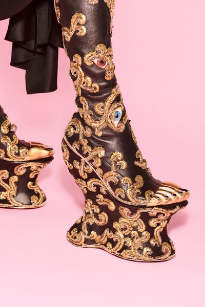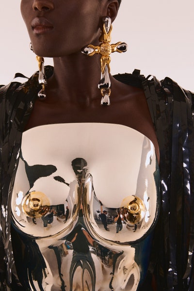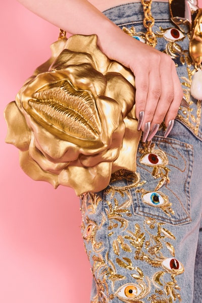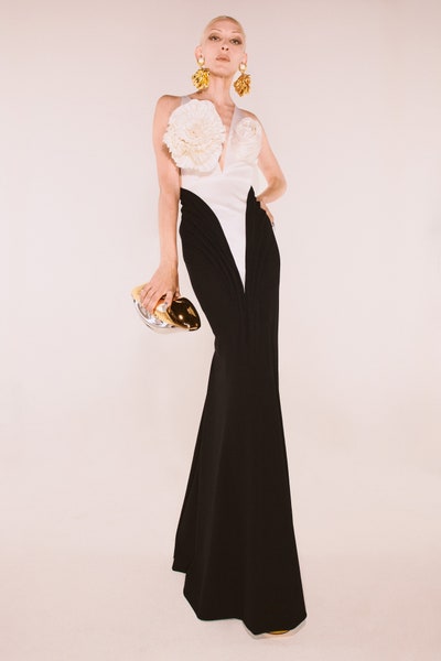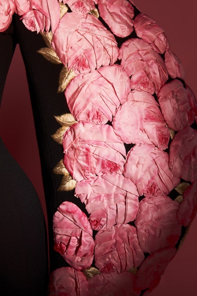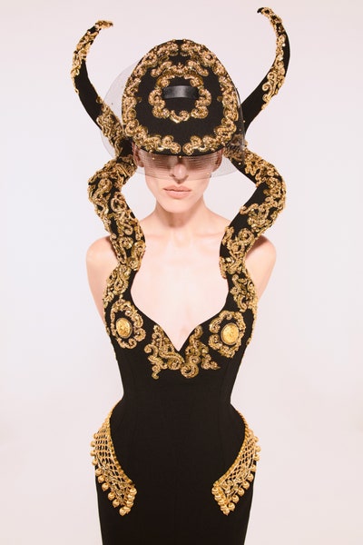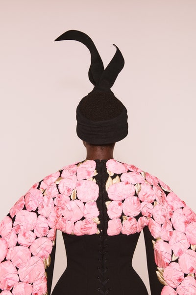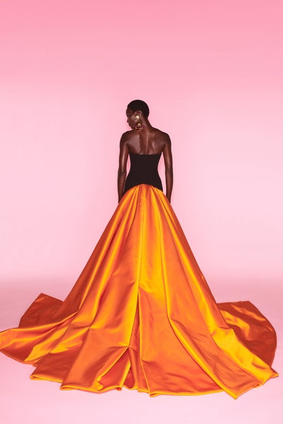 A black off-shoulder dress featured a huge pink rose appliqué whereas a black sculptural minidress embroidered with pink silk roses was a tribute to a Jean Cocteau and Schiaparelli collaboration from 1937. We also saw Coture Jeans dramatized with Roseberry signatures and a shit ton of gold. A black gown with an orange bust-line shaped like lips with a matching train was quite stunning.
