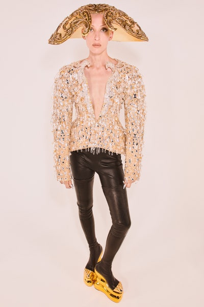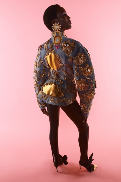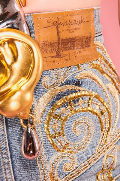 The collection began with a colorful heavily embellished Matador jacket, made from 1930’s Schiaparelli swatches revived from couture embroidery house Lesage archives. The denim version patchworked from 11 pairs of vintage Levi’s was adorned with exquisite gold embroidery and embellishments.
