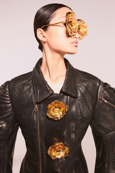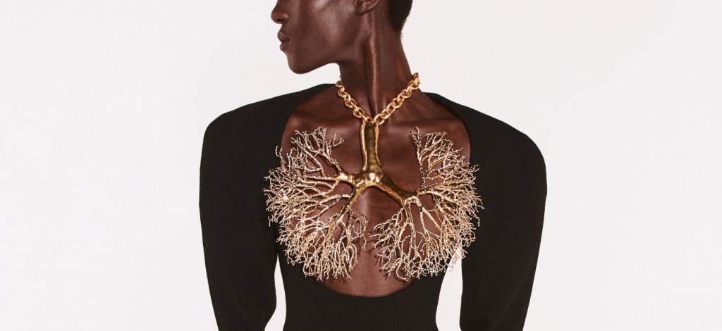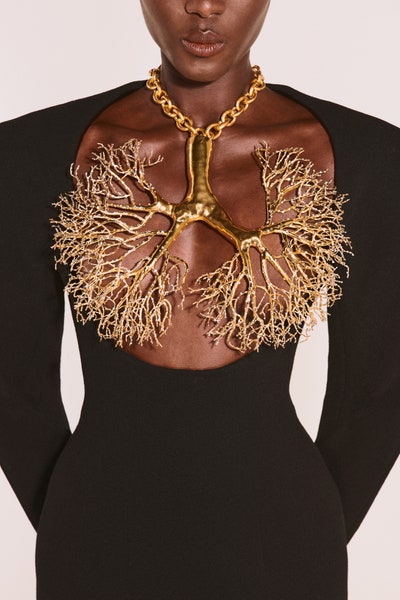 One of the standout looks was a sleek black scoop dress paired with a gold necklace showing the complex bronchi of our lungs adorned with rhinestones. Another similar look used two huge gold roses(corset of a sort) to cover the model’s chest. A breastplate that accentuated the breasts was paired with a stole from made fringed black garbage bags.
