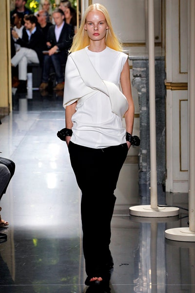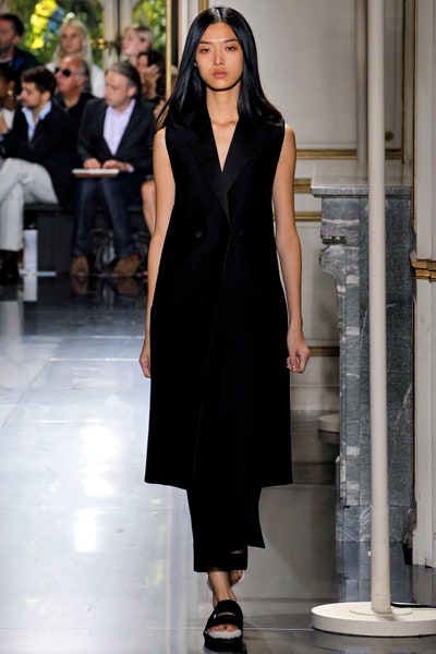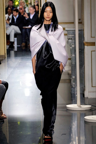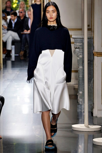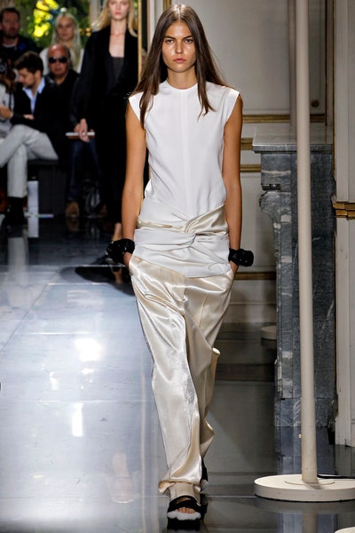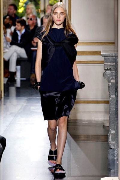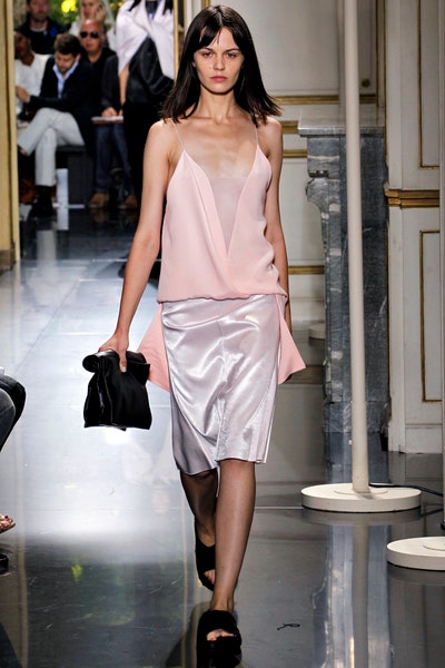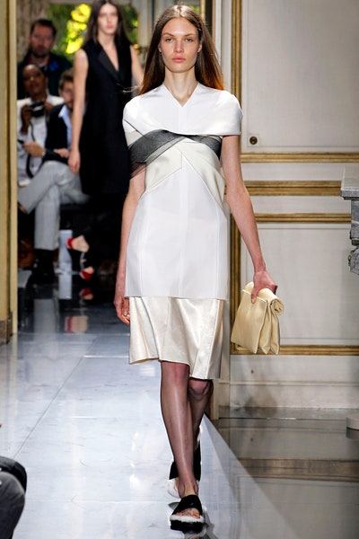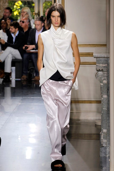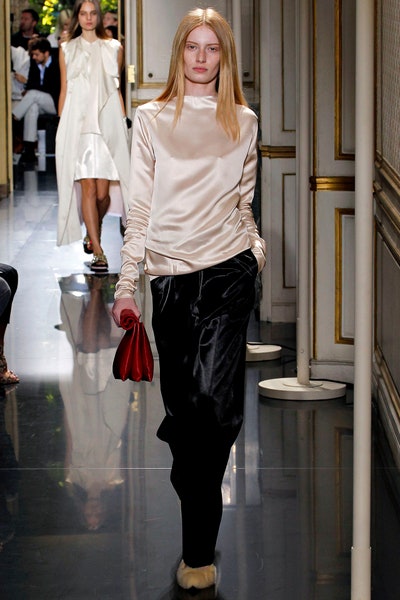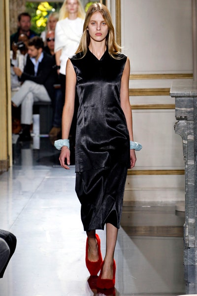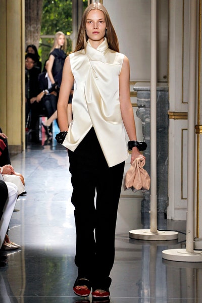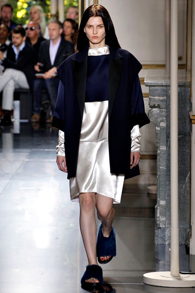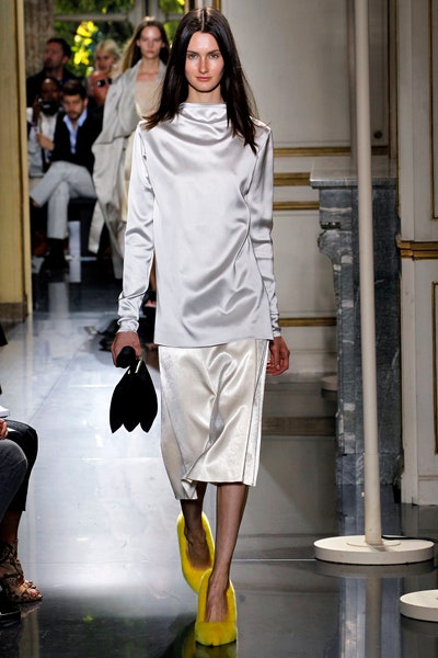 The shoes were clearly on the funkier side; Fur footwear was intriguing enough and the trompe l’oiel toes peeking out of fur-lined slides were the cherry on top. A pair of yellow fur stilettos was a Celine piece I didn’t know I needed. Layered clutches with a rolled top were a handbag hit.