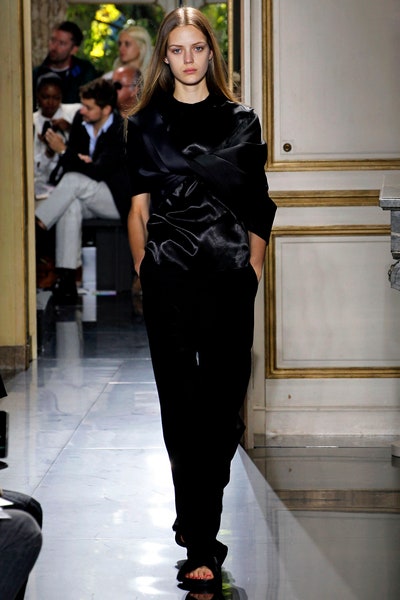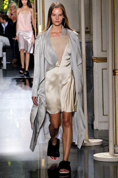 Relaxed femininity was the strong force here. A twisted fabric motif was persistent in all tops complimented by luxurious satins was simply stunning. Liquid silks draped to perfection was the clear standout and while the shapes and silhouettes were not explicitly feminine it was the fabrics and the movement of the clothes that spoke for it. Mesh paneled dresses were seen with minor variations were seen that oozed a longing subtle sexuality. Undone hems gave the clothes a raw elegance while making sure not to overpower the look.