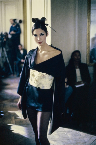 Kimono like minidresses, sensual bias-cut dresses, Obi belts were the cleat standouts in this collection. In order to be economical Galliano used 2 sides of the same fabric to give the look of depth and richness it didn’t have the budget for. He talks “There were, I think, two touches of pink. Kate and Christy had pink outfits. Those were the only colors in the entire show. We just didn’t have time for anything else.”