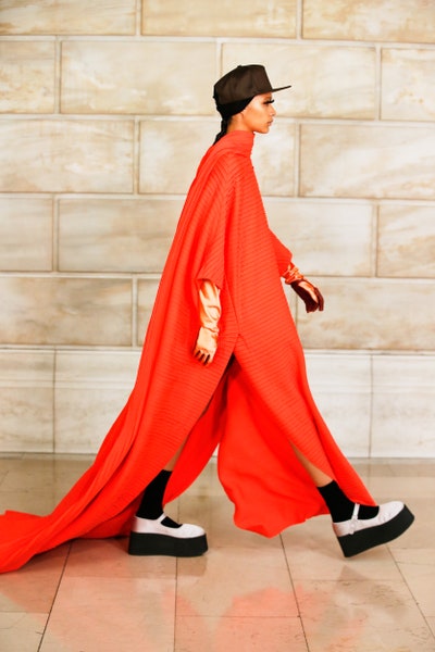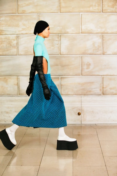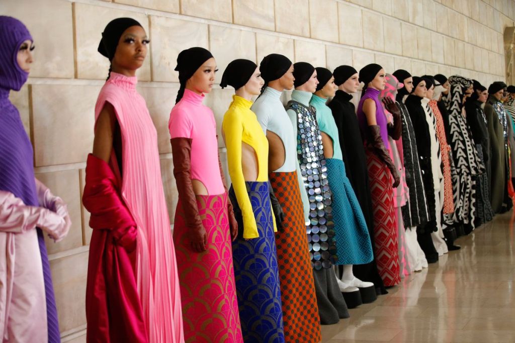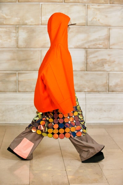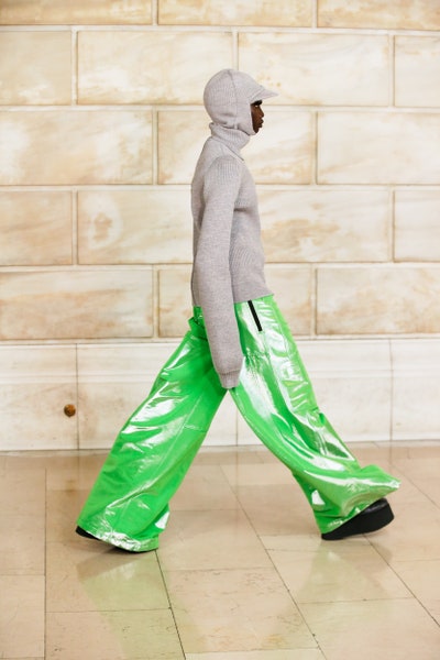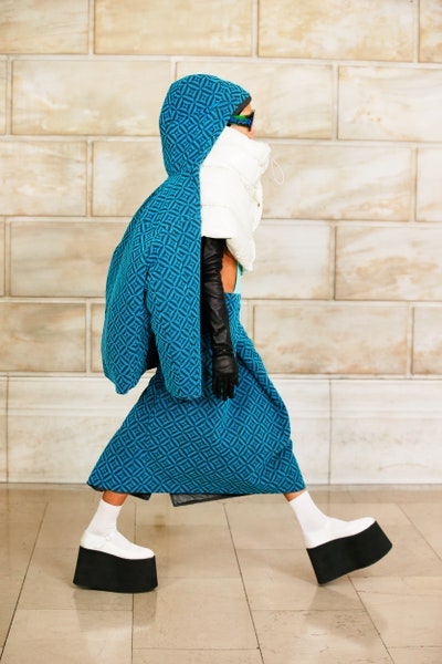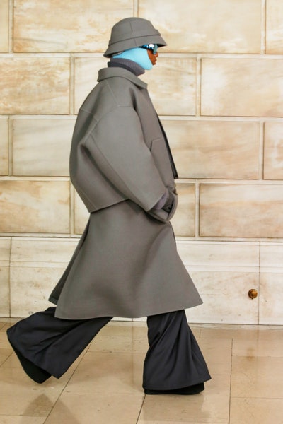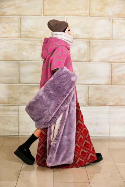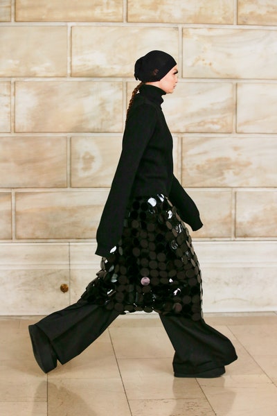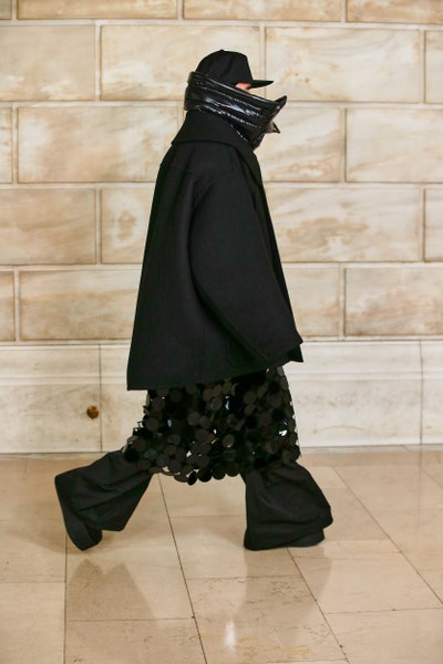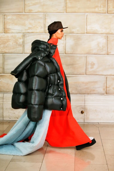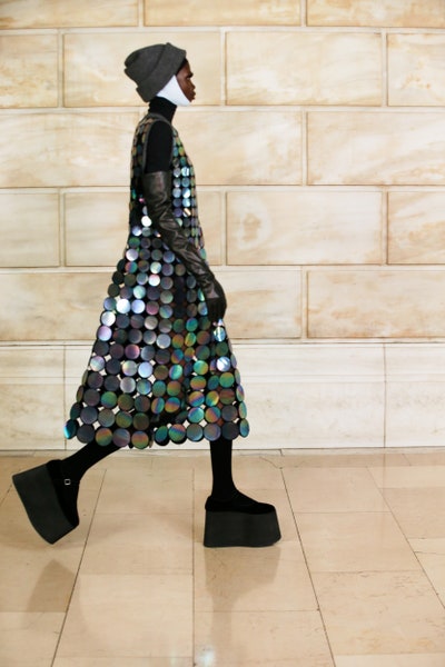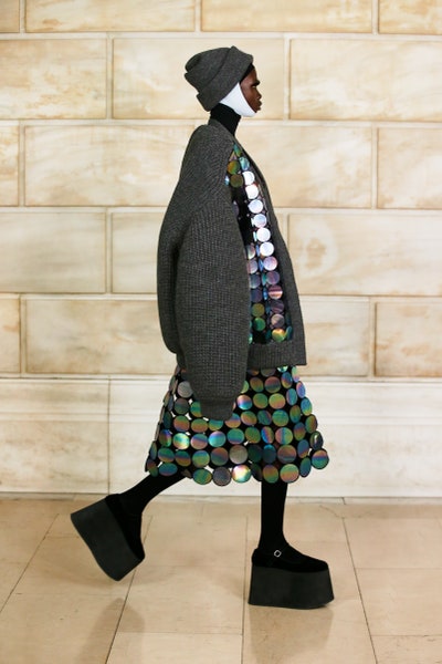 The color palette was so vast, it hardly was a palette; black and white, vivid romantics, some grounded neutrals and a little bit of neon. Large holographic paillettes added dimension to the clothes very reminiscent of Paco Rabbane,of course. Sky high platforms (almost 10 inches) were a reminder of his staple while displaying his understanding of trends and the ever-changing market. There were stoles and scarfs but not your typical old Hermes-silk kinda scarfs but huge puffers, fur, satin and whatnot. You’re basically carrying a mini bed with you. Some subtle cutouts were featured in a few looks, they were super sexy. Oversized puffer jackets, giant floor-length coats, flared pants, lively snoods were the undisputed highlights of this collection.