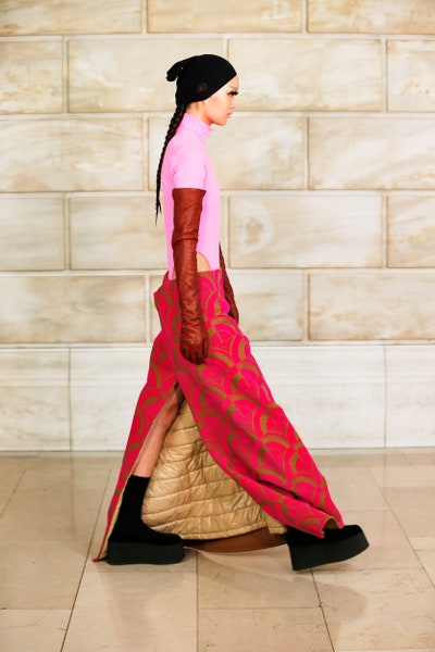 The collection was called “Happiness” did really live up to its name. Jacobs returned to the runway after a year, held inside the magnificent New York Public Library. The glamour and extravagance were pouring out of my mobile screen. The overwhelming silhouettes that engulfed the models completely were quite brilliant. The supersized use of the brand name somehow capitalizing on and mocking the logomania was quite smart, Quintessential Jacobs. Two big black and white puffer looks with a swirly print were all sort of trippy. Some puffer skirts with a homely print reminds one of a whimsical blanket you just wanna curl up in.