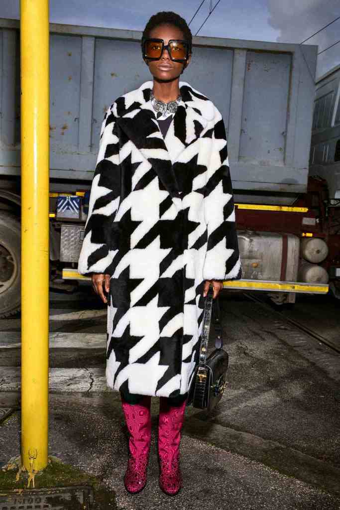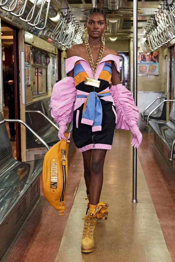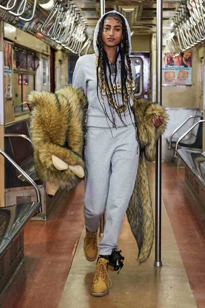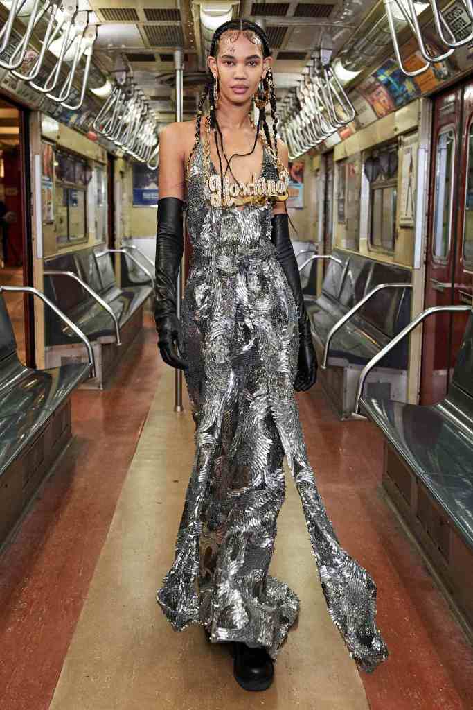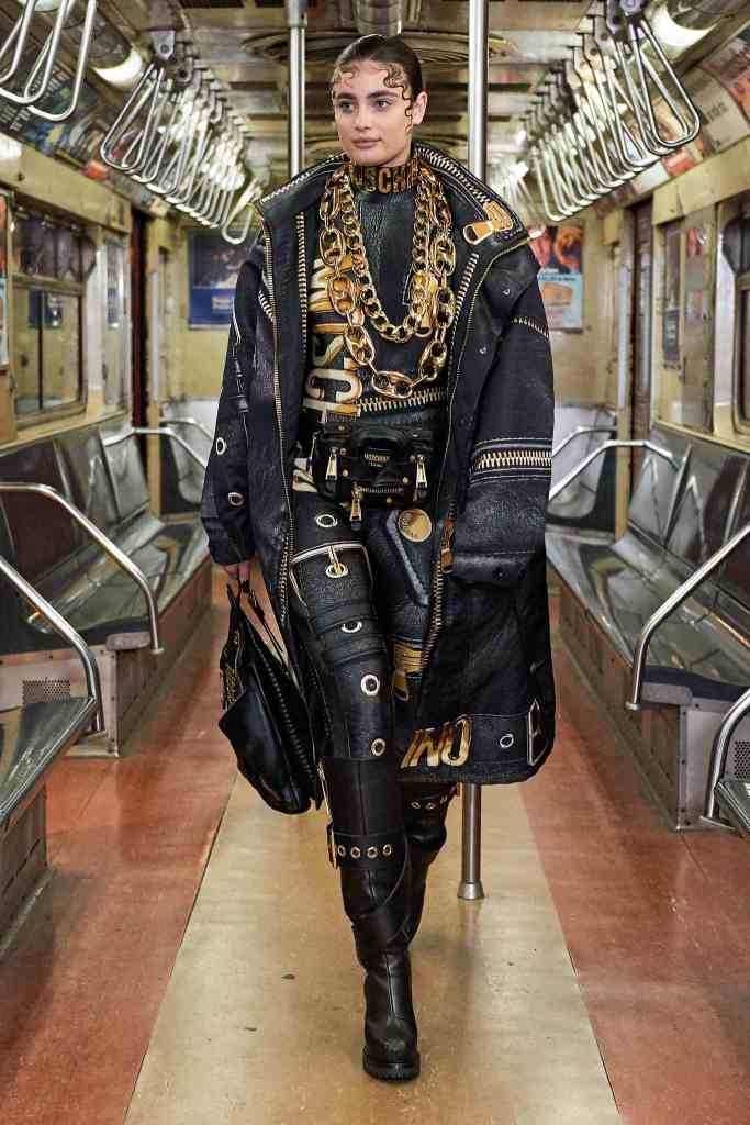 Moschino: Held in a New York subway Moschino was really good, loved the extreme energy. The all-black leather, elevated sweats, huge puffers and the exaggerated accessories, Big Gold jewelry was super fun. Elements from streetwear were played with to possibly show a stark contrast between luxury and reality.