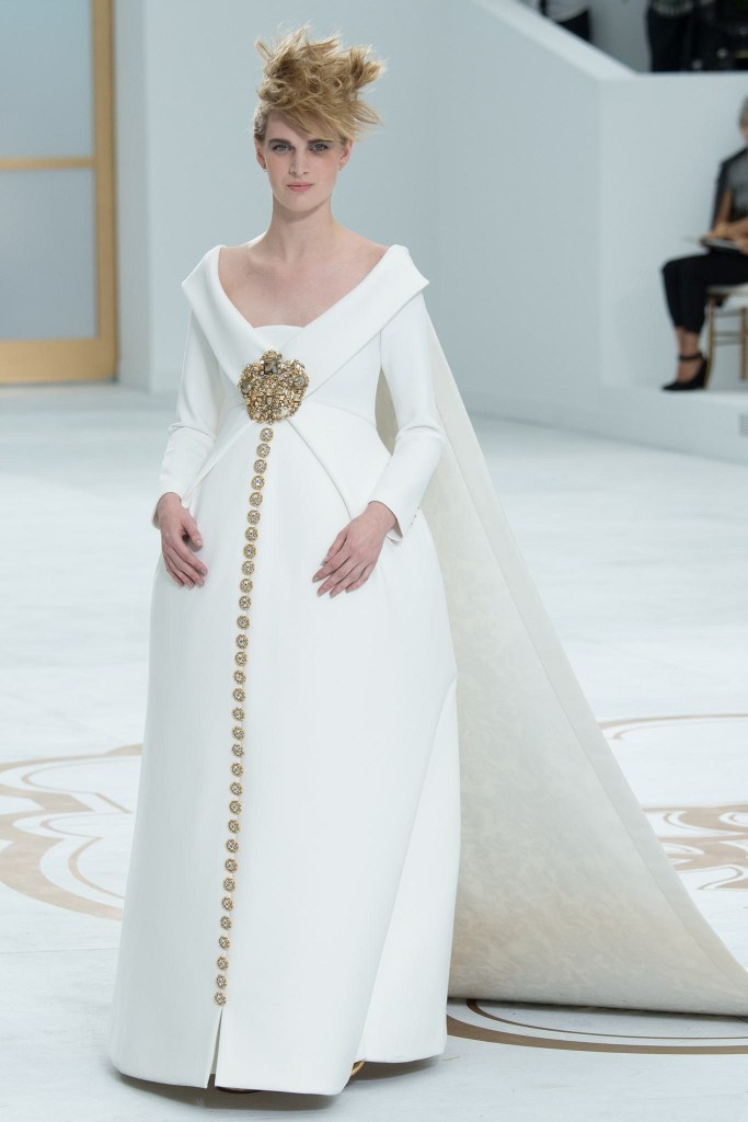 Edie Campbell wearing a wedding suit at the Chanel Couture Fall 2015-2016 show