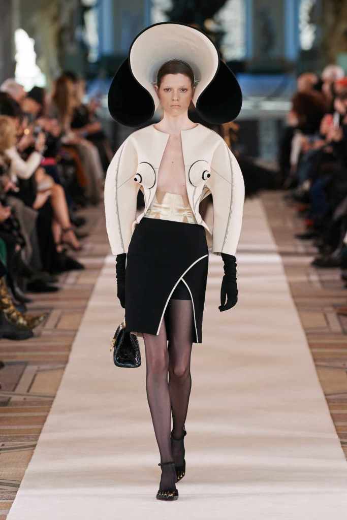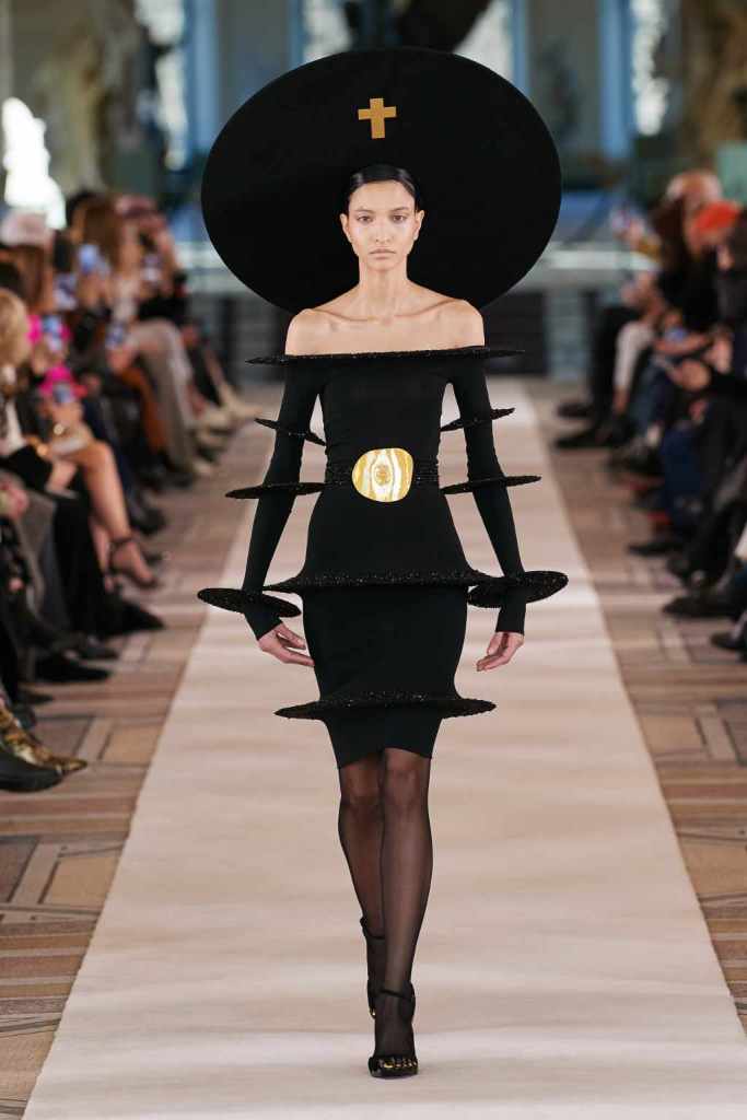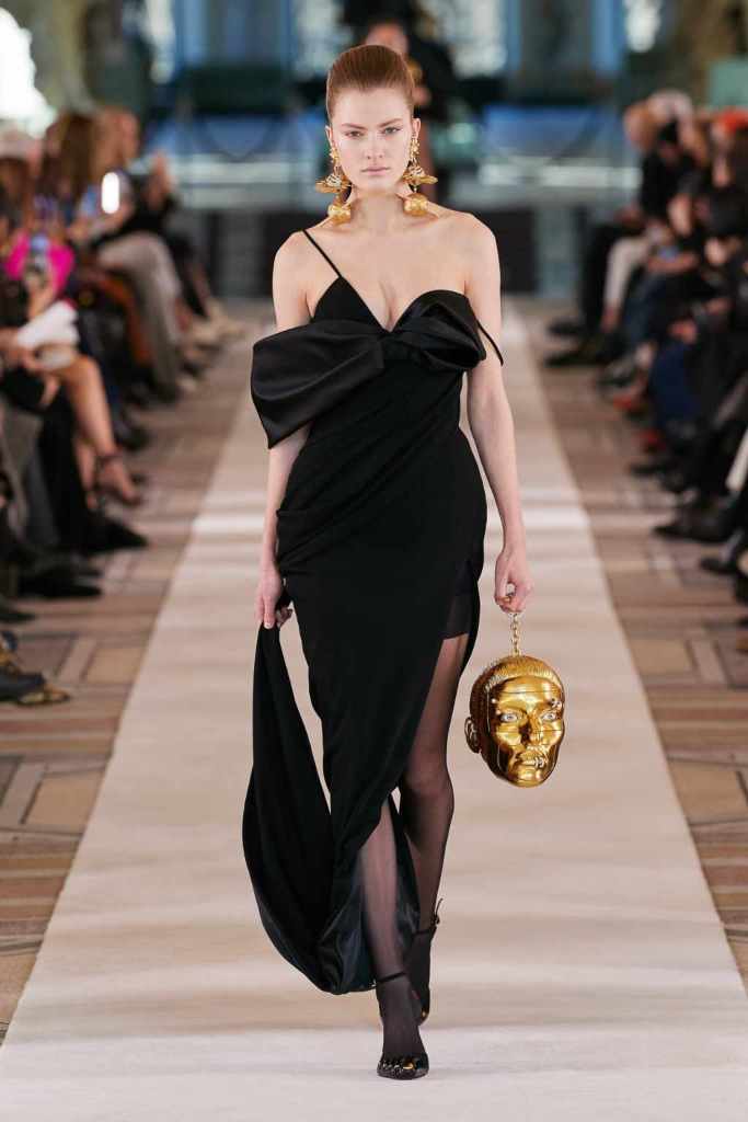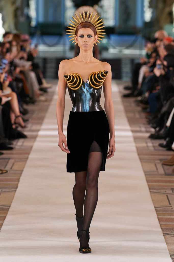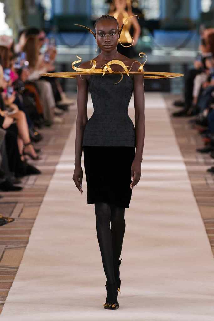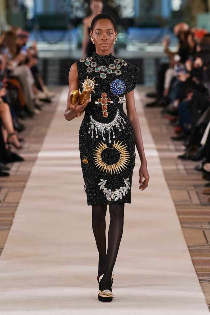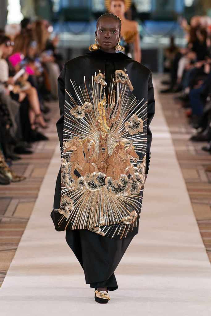 Back to the runway Daniel Roseberry continues doing divine work at Schiaparelli. Extravagant luxe jewelry, sensational silhouettes and unfiltered surrealism were the clear defining points of this collection. Made in almost all black loaded with gold detailing and Jewelry the beauty was so obvious whilst hidden in the details. Multiple recreations of Elsa Schiaparelli’s legendary pieces were done with all the sincerity one would desire along with a delightfully sequined interpretation of the Pierre Cardin Parabolic Gown. Bags loaded with that signature surrealism: from planets to human faces. From conical breast to gold jeweled gloves the collection was abundant in references and it is a reminder of Daniel Roseberry’s sensibility and brilliance. Stripped down of the usual power elements this collection was more elegant, more feminine and more restrained.