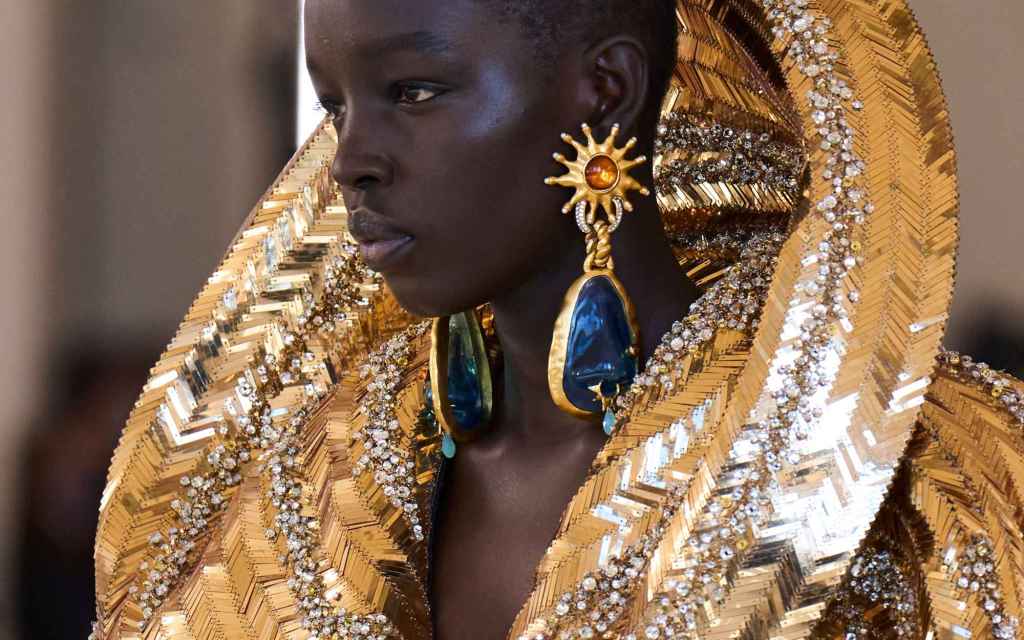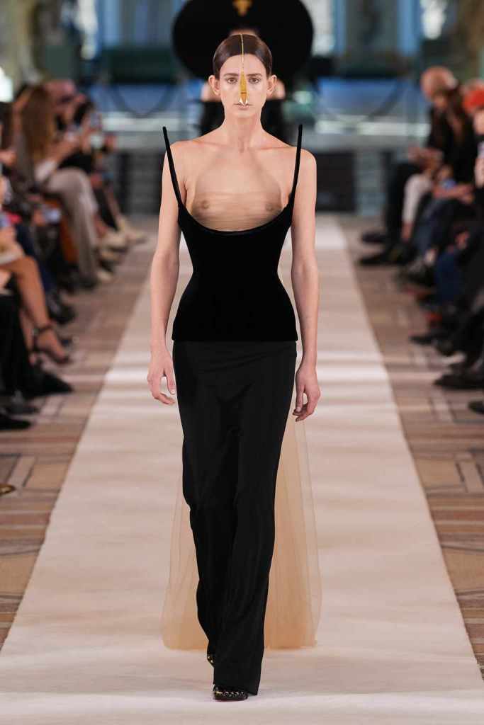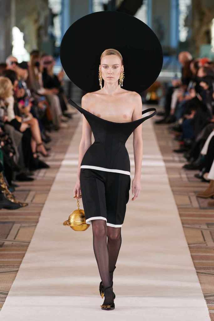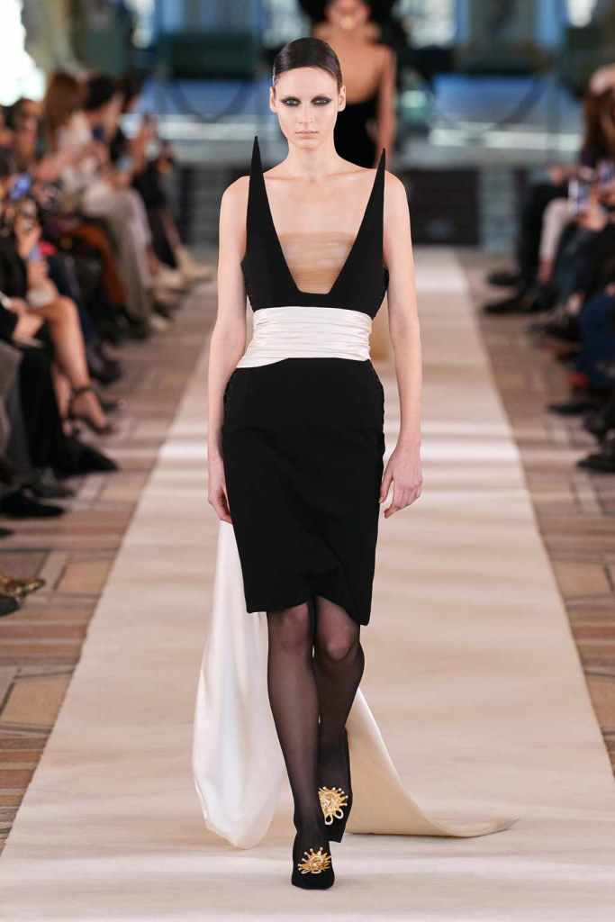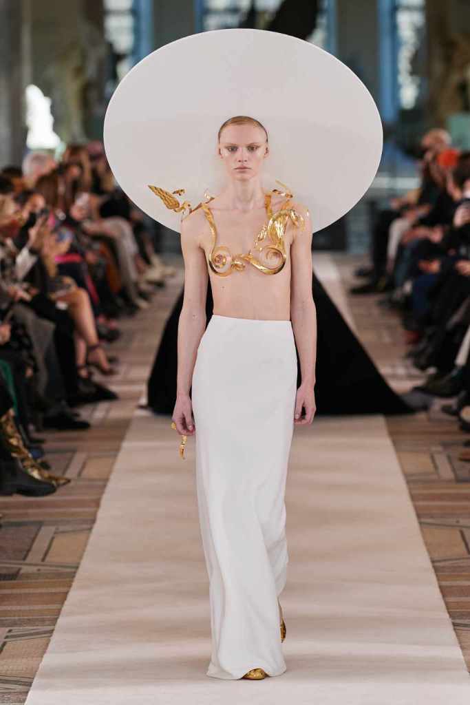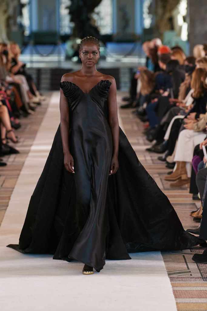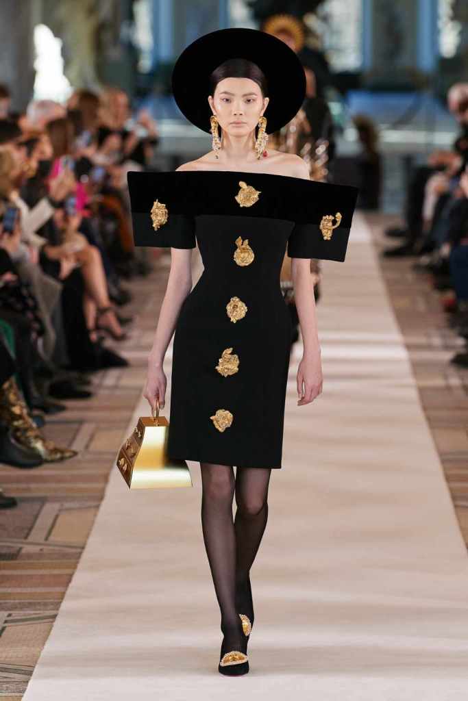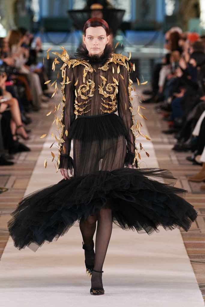 Back to the runway Daniel Roseberry continues doing divine work at Schiaparelli. Extravagant luxe jewelry, sensational silhouettes and unfiltered surrealism were the clear defining points of this collection. Made in almost all black loaded with gold detailing and Jewelry the beauty was so obvious whilst hidden in the details. Multiple recreations of Elsa Schiaparelli’s legendary pieces were done with all the sincerity one would desire along with a delightfully sequined interpretation of the Pierre Cardin Parabolic Gown. Bags loaded with that signature surrealism: from planets to human faces. From conical breast to gold jeweled gloves the collection was abundant in references and it is a reminder of Daniel Roseberry’s sensibility and brilliance. Stripped down of the usual power elements this collection was more elegant, more feminine and more restrained.