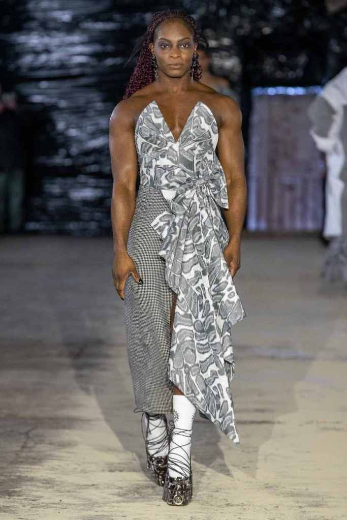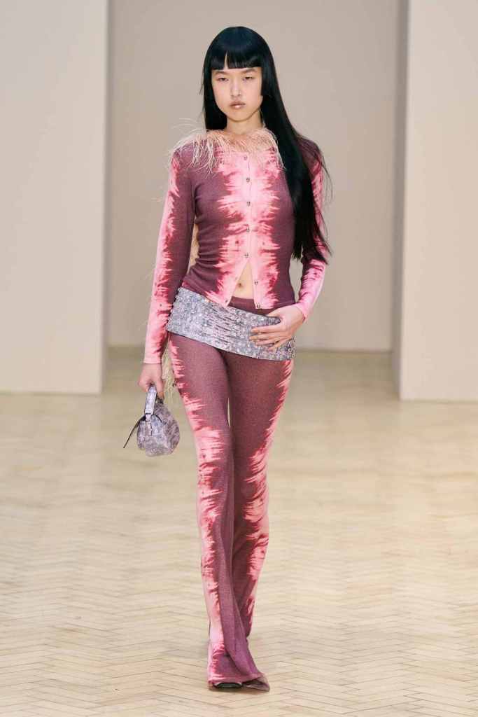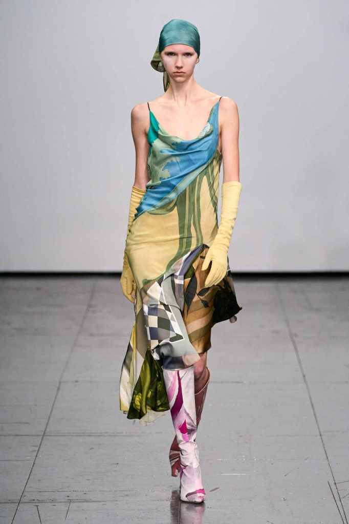 Connor Ives: This is a runway debut worth the wait. Fun colors, slinky Y2K silhouettes and lux materials bring together quite an energetic collection. A master tailoring moment was a black suit with a sharp Mandarin neck. The prints were trippy, the vibe was seductive and those asymmetrical slip dresses would flatter anyone who wears them. I have this desire to be the designer who does it all,” Connor told WWD and might I say it’s happening already