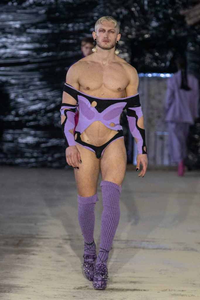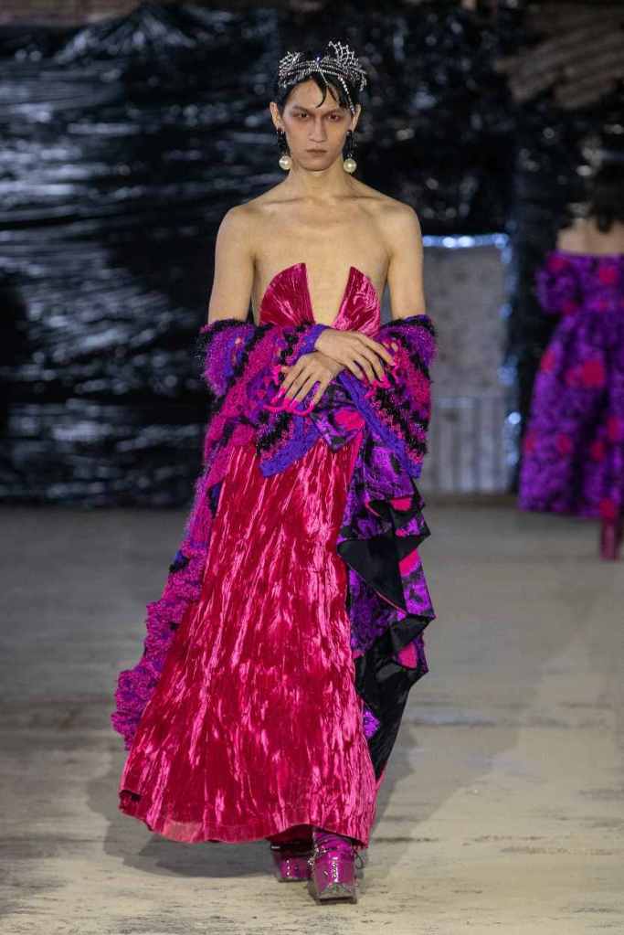 Edward Crutchley: Now this is the aesthetic I live for! Edward Crutchley is now a fav that I’ll look for every fashion week. A white knit dress with circles cutouts opened the show set the tone for a queer, fun and important collection. A softly tailored lavender suit was a favorite along with an all-black moment – velvet mini top & skirt worn under a delicious leather jacket. Crushed velvet gowns in pinks and purples are the ultimate definition of the 80s, glam and fashun.