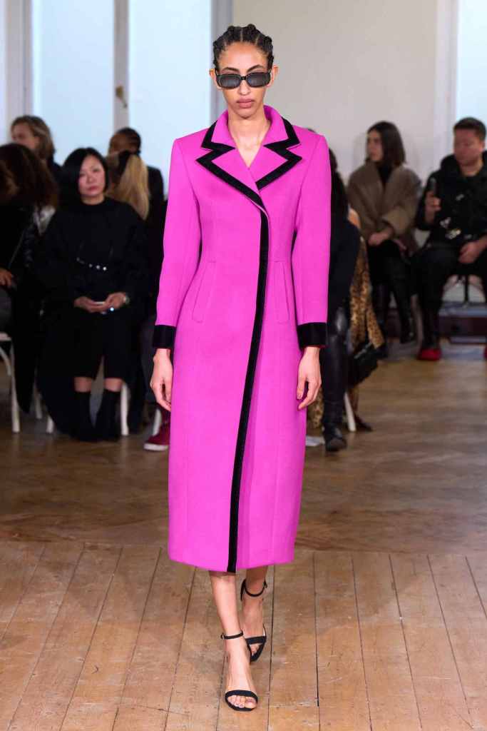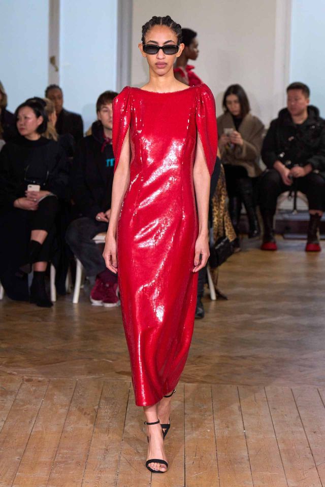 Huishan Zhang: Zhang gives a revamped Carolina Herrera vibe; mostly cause of the similar demographic. I do believe his work might be more suited for New York or Paris but for now, let’s swoon here in LFW. In vibrant pinks and statement reds, this collection did have some hard-hitting lux pieces. The opening look – an almost neon pink coat with black contrast lines was quite gorgeous, another favorite was a red sequined dress with draped sleeves. The bridal look was quite pretty and does make me wonder… will Zhang do better as a bridal designer?