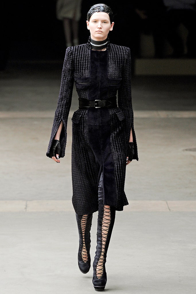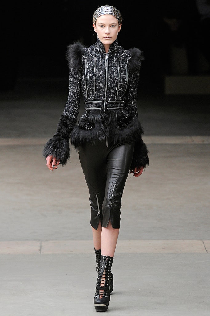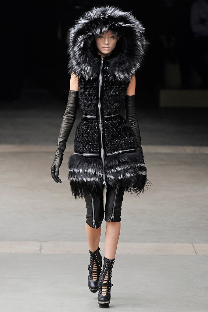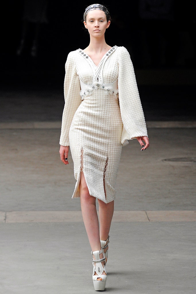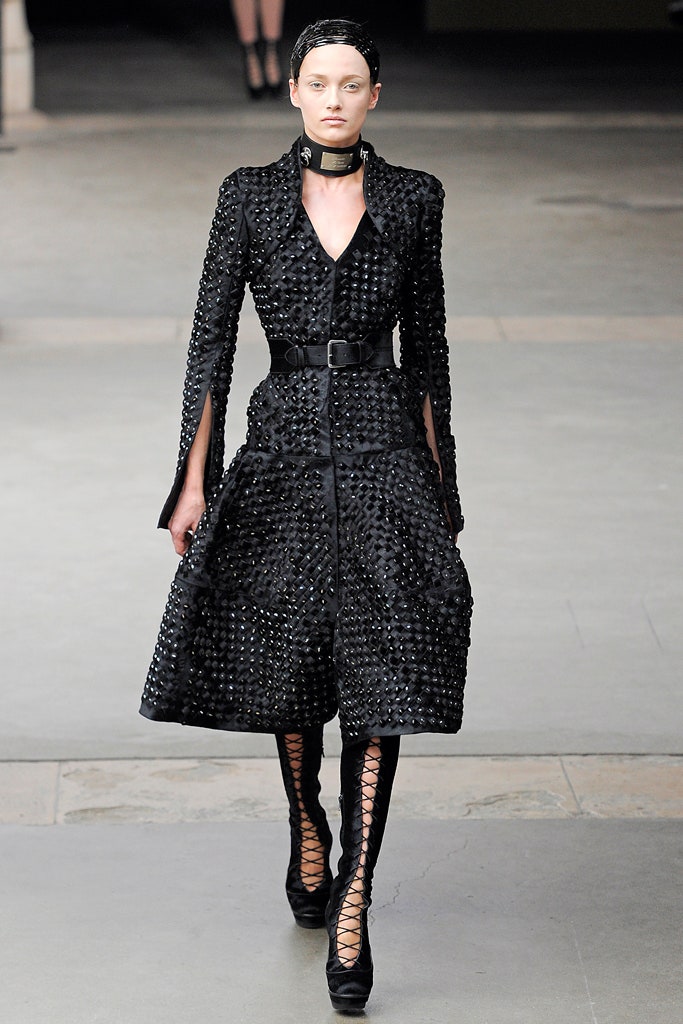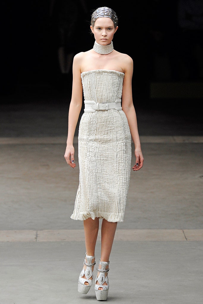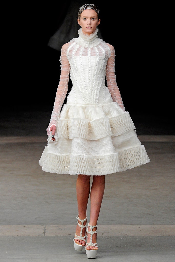 Colorful mosaic structures, extravagant fur trims, intricate leather paneling and infinitely layered organza were just some of the elements that added to the couture-like craftsmanship of the clothes. Some looks, all white giving off a fairy late energy, others all black are for an elegant vixen. Caged and scriptural high heels carry of the wild McQueen shoe legend well. Models were helmeted using silver hair clips; something inherently girly being used as a shield. A similar though seen in a pretty white chiffon dress worn under a black leather harness. Among the final lineup of gowns, there was also the well deserved enormously pleated ivory gown ‘Dress of the year’ in 2011. Cinched waists, metal zipper piping, embellished quilting, neck ruffs worn as chokers were among many exquisite elements in this collection.