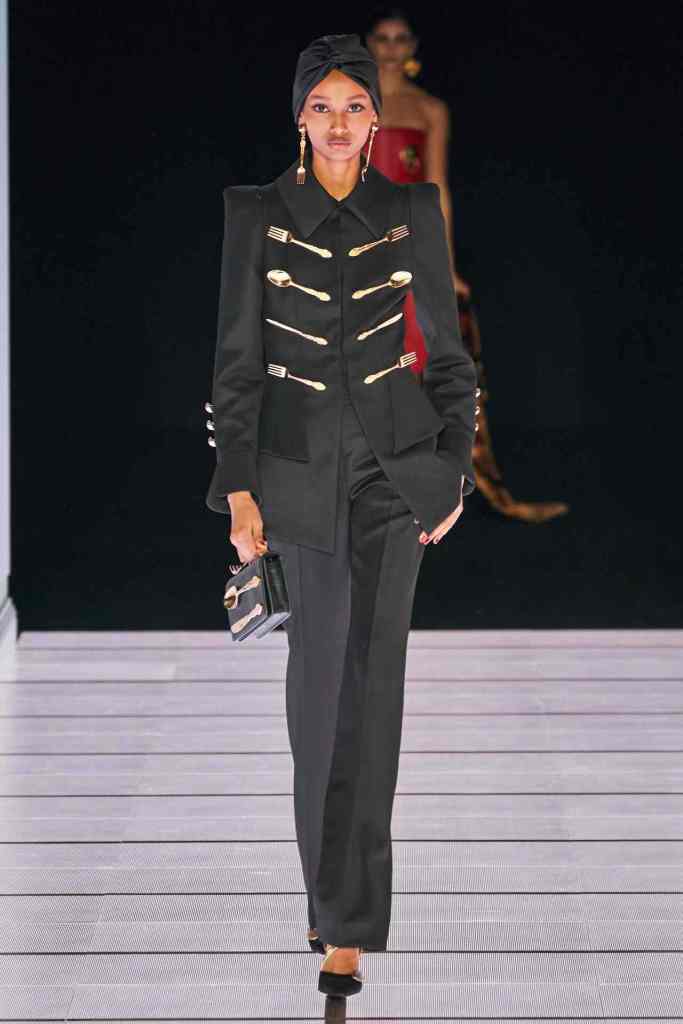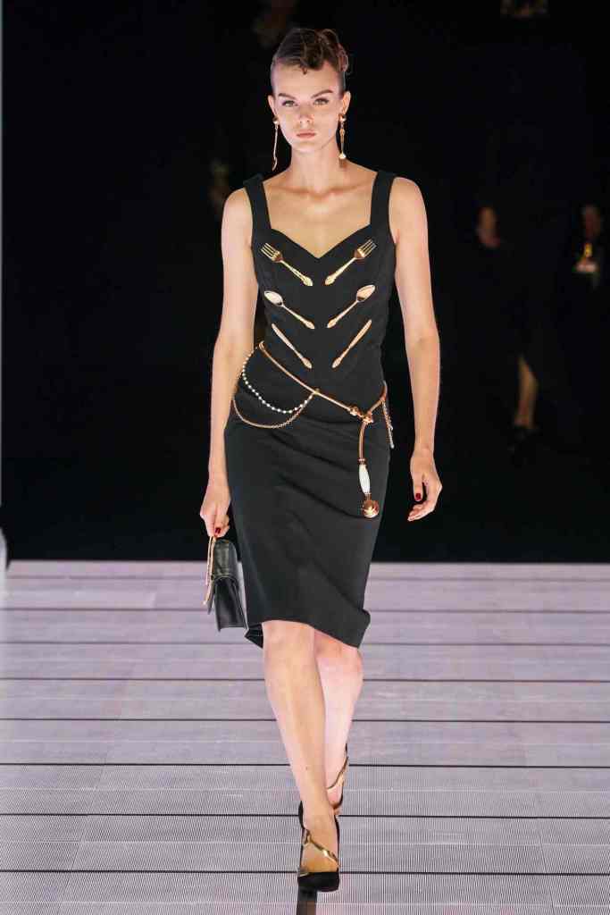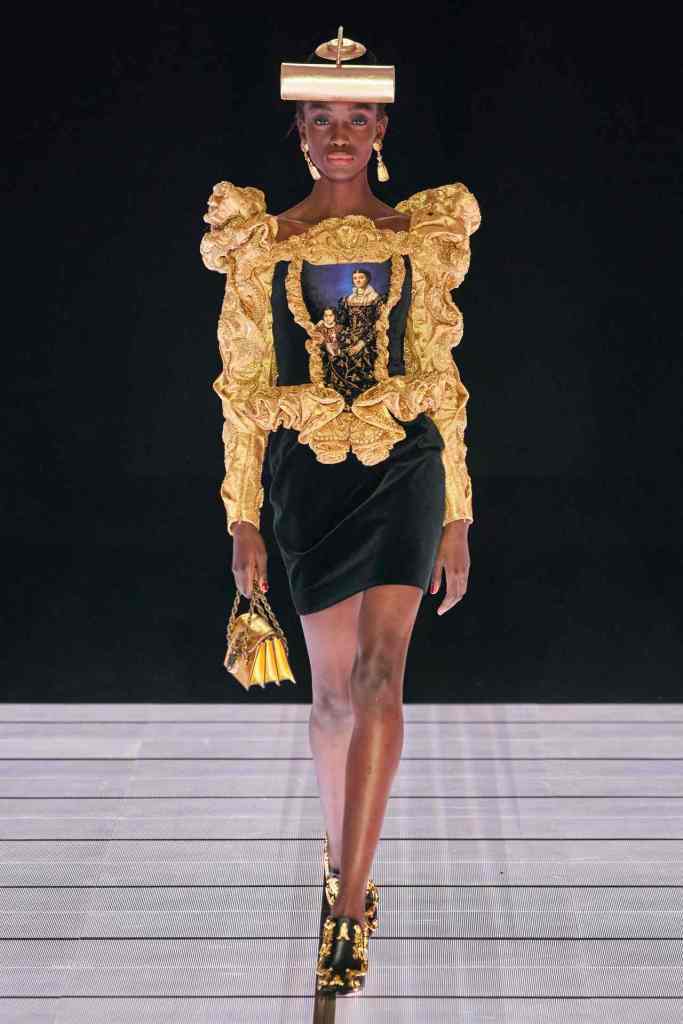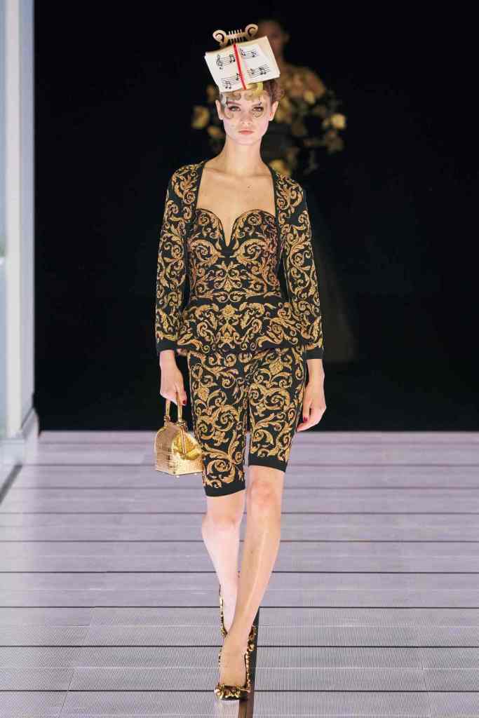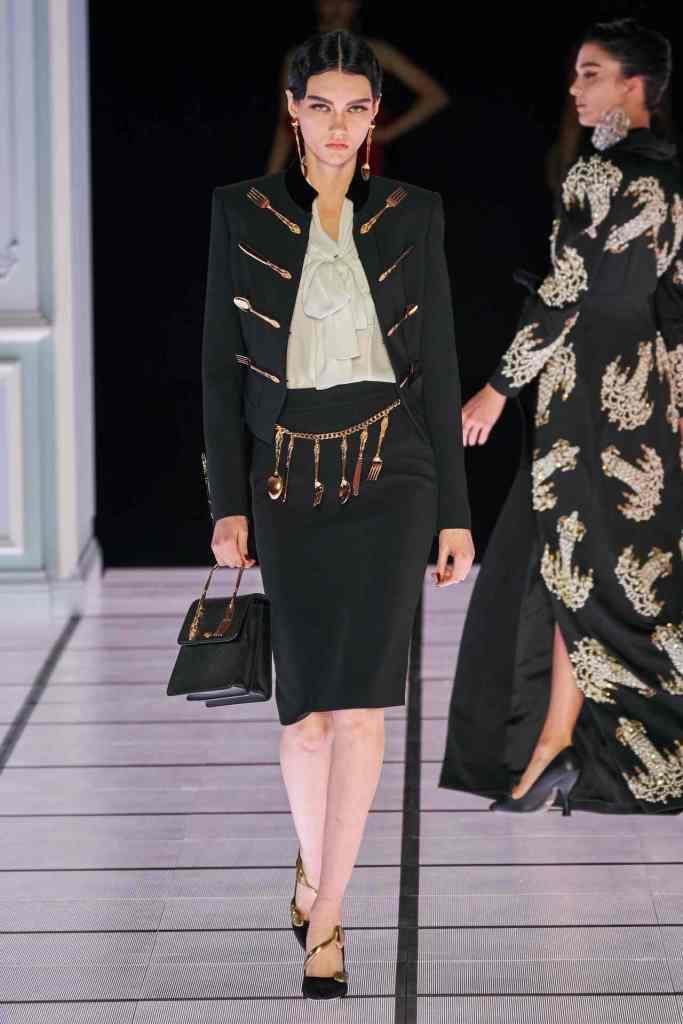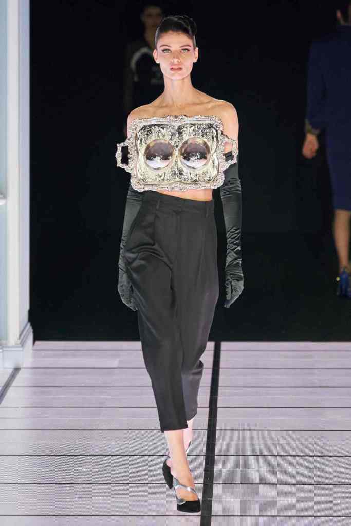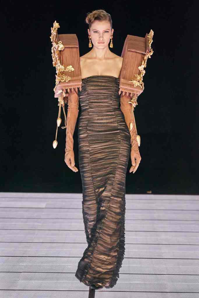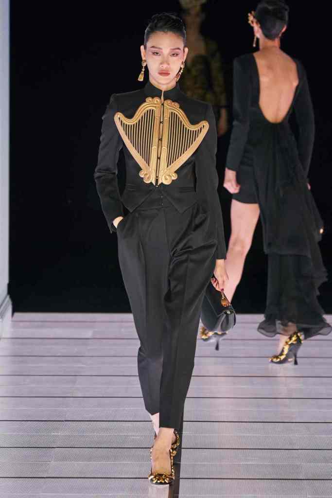 One of the most defining looks was a black skirt suit with gold detailing and cutout windows at the buttocks worn over a gold beaded bralette. A silver serving tray was transformed into a sculpted bustier. One look had a headpiece that was lighting up the painting the model wore on her torso; it doesn’t get more real than that. Pieces decorated with golden cutlery were inspired by the archives. A gold gown looks pretty from the front but is a full human-sized harp on the back, talk about plot twist.