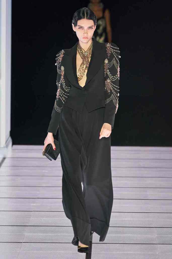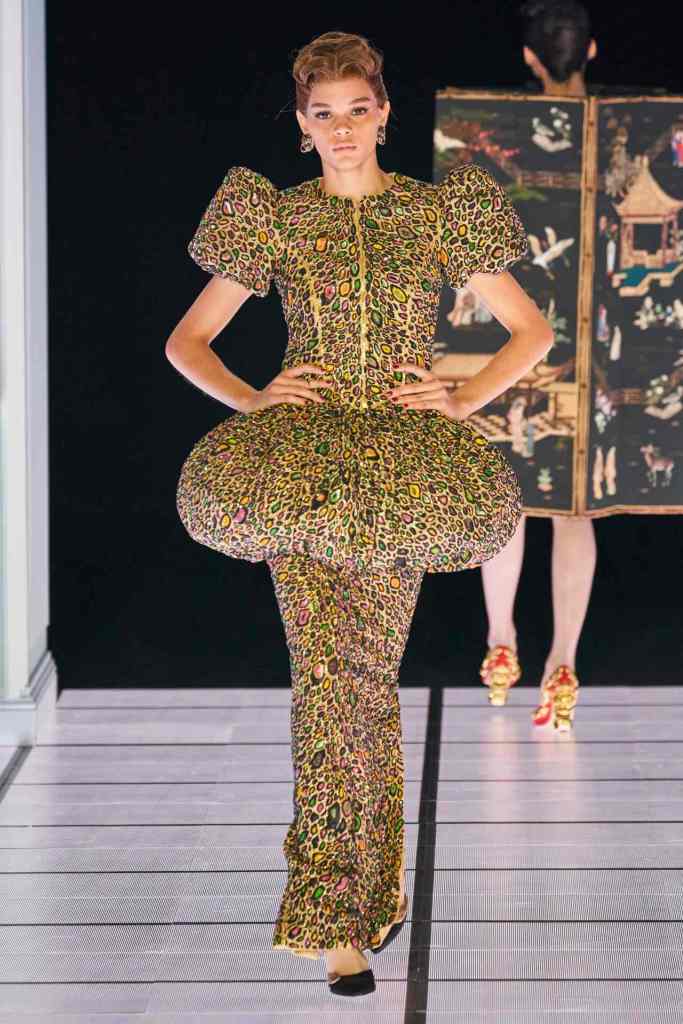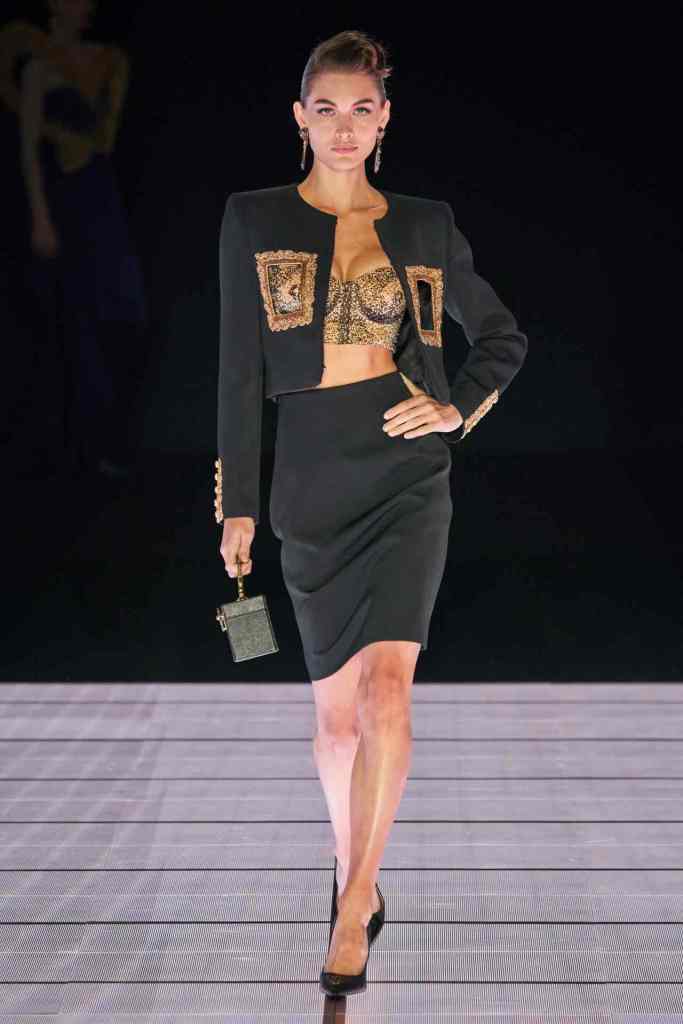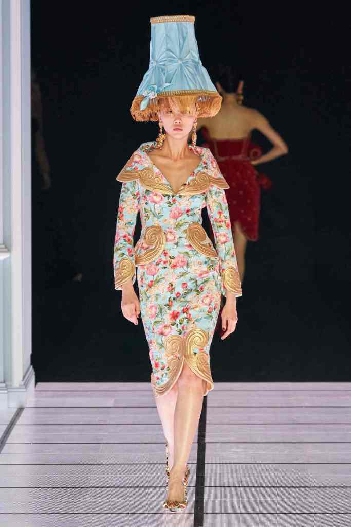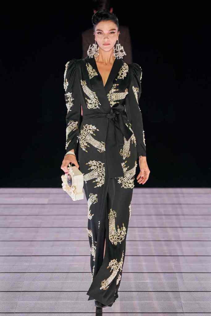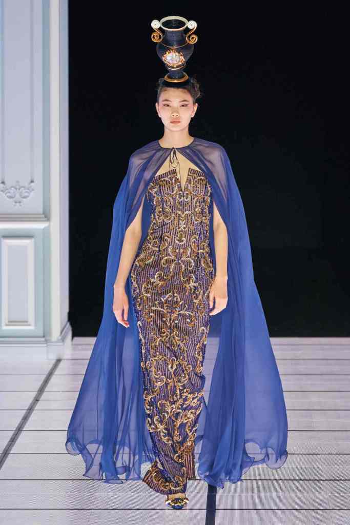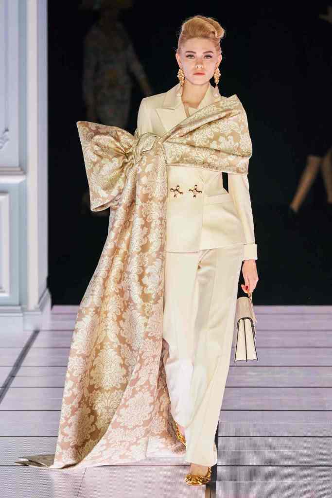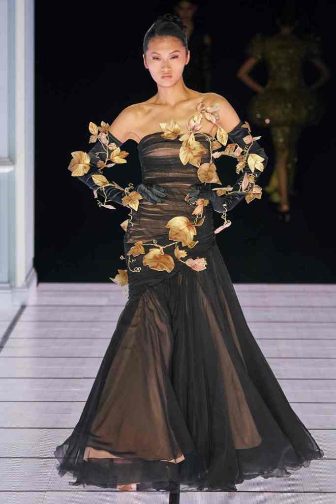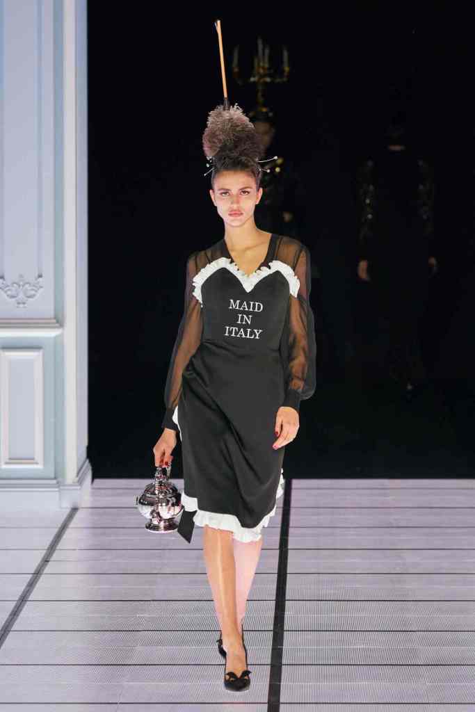 One of the most defining looks was a black skirt suit with gold detailing and cutout windows at the buttocks worn over a gold beaded bralette. A silver serving tray was transformed into a sculpted bustier. One look had a headpiece that was lighting up the painting the model wore on her torso; it doesn’t get more real than that. Pieces decorated with golden cutlery were inspired by the archives. A gold gown looks pretty from the front but is a full human-sized harp on the back, talk about plot twist.