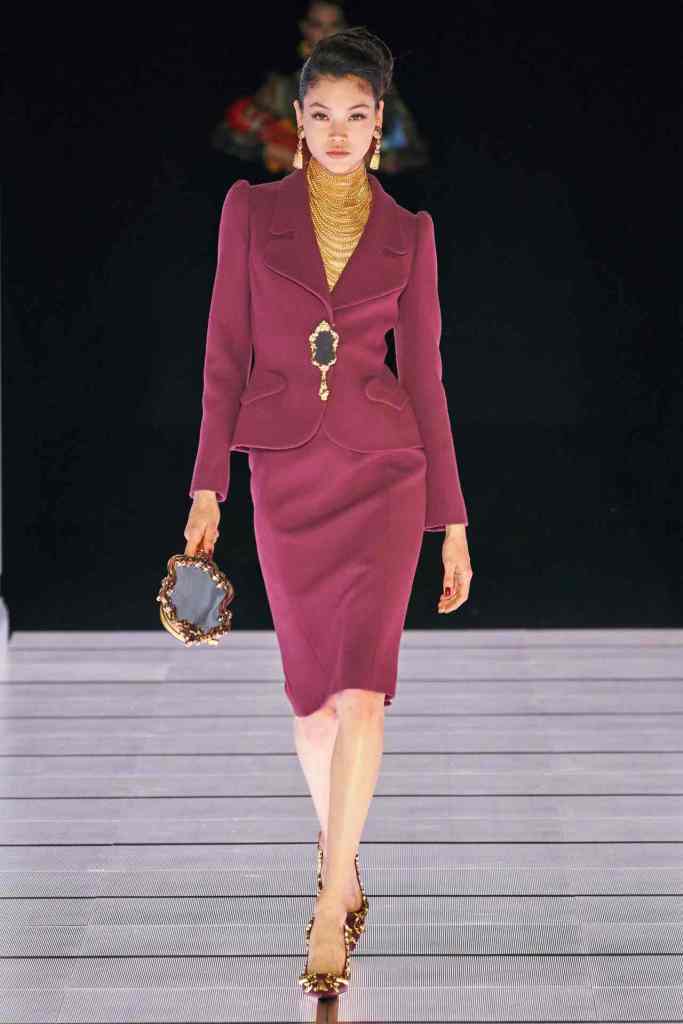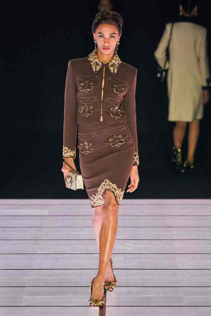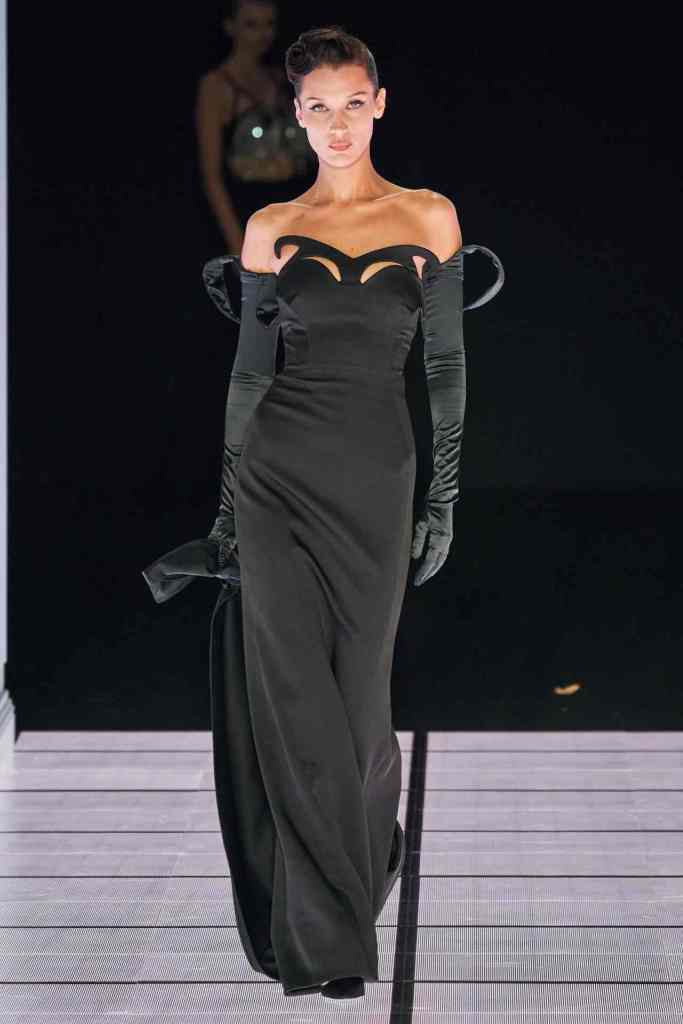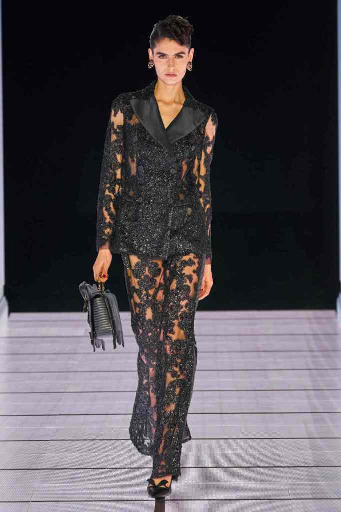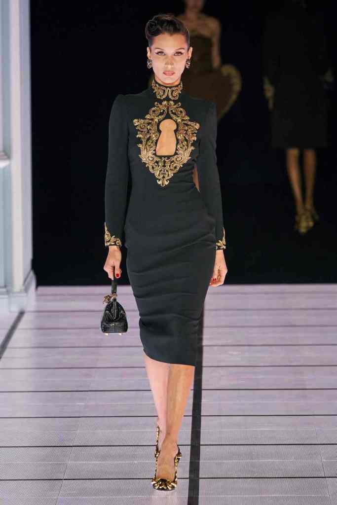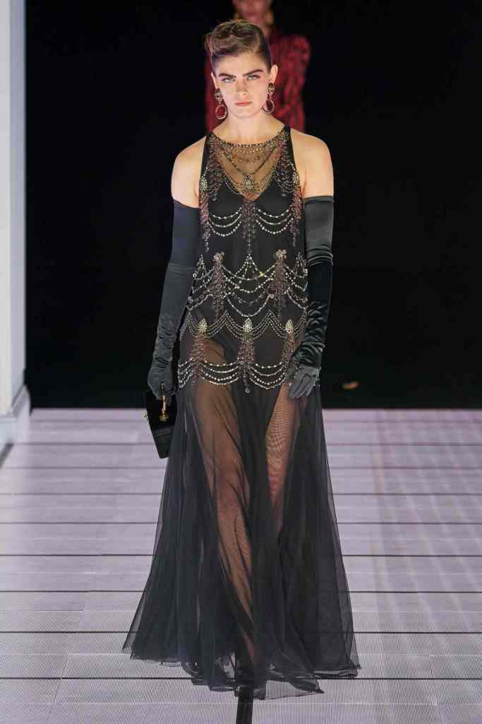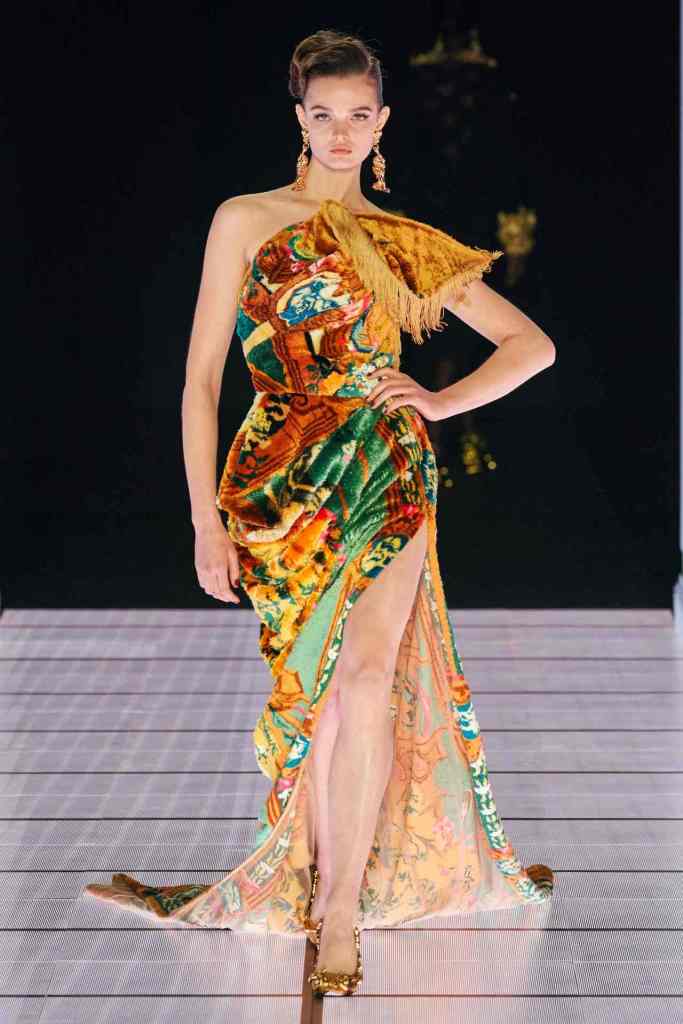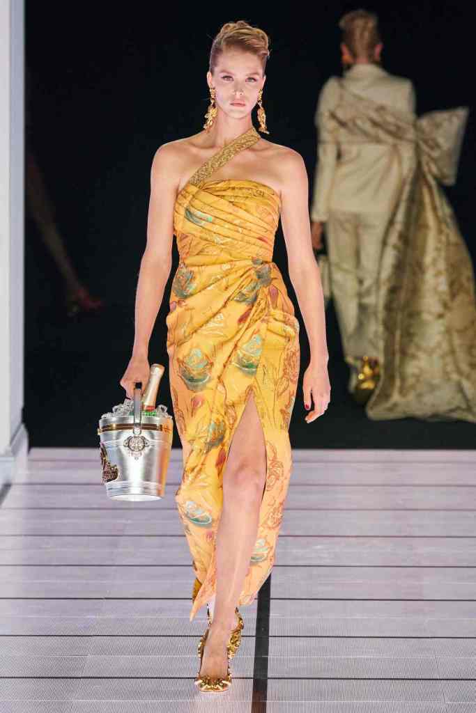 One of the most defining looks was a black skirt suit with gold detailing and cutout windows at the buttocks worn over a gold beaded bralette. A silver serving tray was transformed into a sculpted bustier. One look had a headpiece that was lighting up the painting the model wore on her torso; it doesn’t get more real than that. Pieces decorated with golden cutlery were inspired by the archives. A gold gown looks pretty from the front but is a full human-sized harp on the back, talk about plot twist.