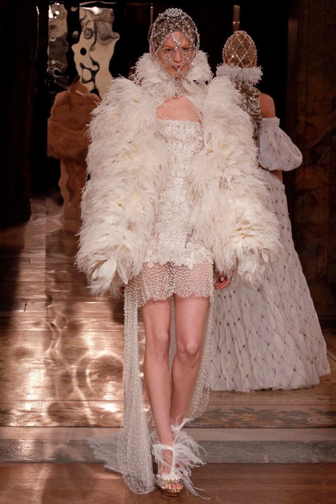 Truly theatrical looks created with the highest level of craftsmanship and detail. 10 looks but essentially 5 since they came in pairs. Detailed craftsmanship featured soutage embroidery, enameled flowers, metal thread embroideries, beading, lace, ostrich feathers, countless pearls and embellishments among more. Pearl-laden metal caged face masks along with ruff neck collars; the devil was in the divine details. The pearl-encrusted boots were hardcore meets royalty. Erotic undertones were consistent beneath the regal references; a heartfelt dedication to unabashed femininity.