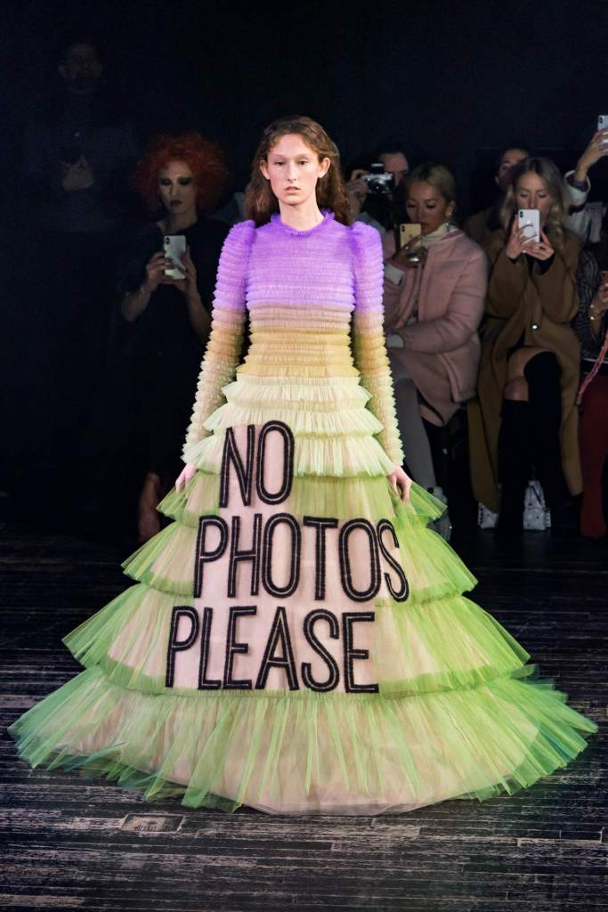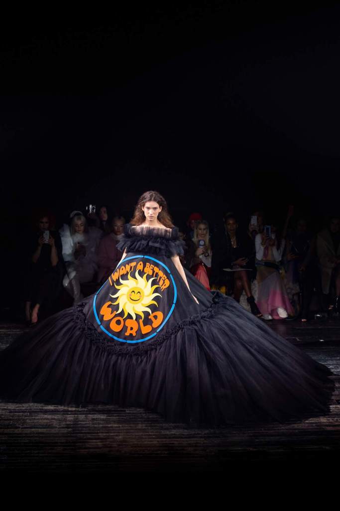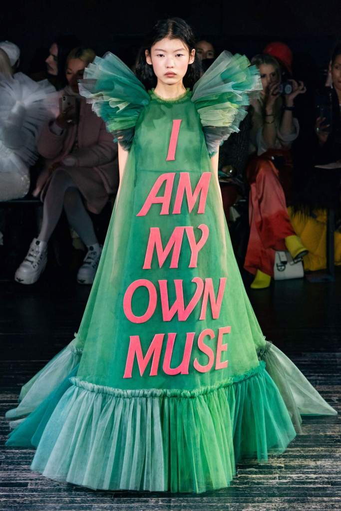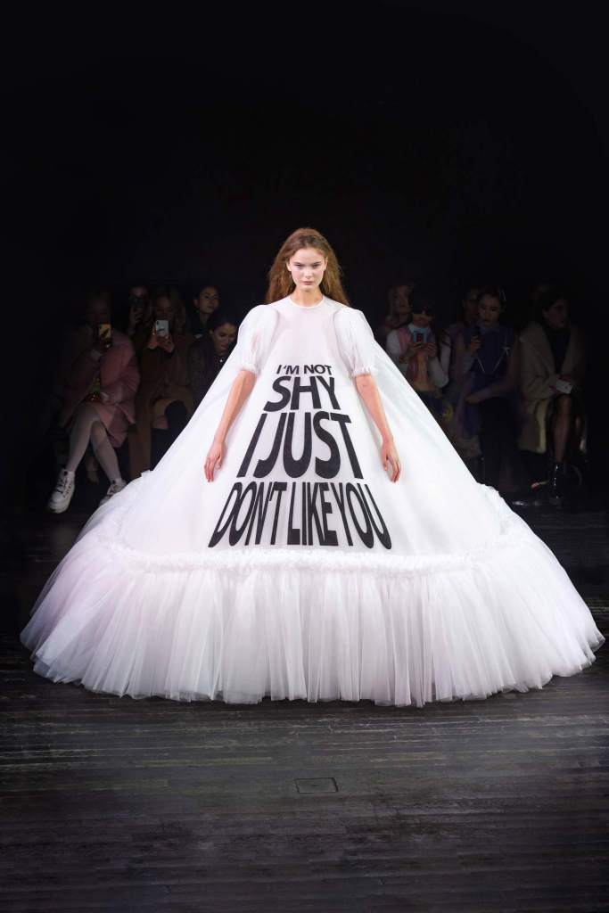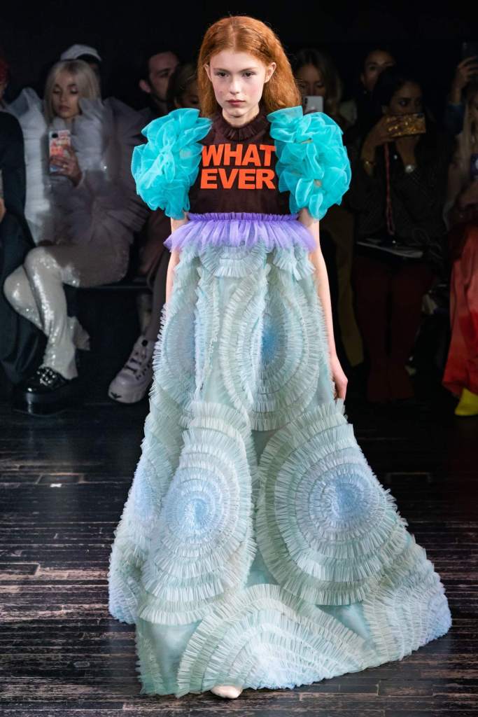 Social media staple slogans were pasted across romantic scrumptious tulle gowns. Explicitly expressive, rainbow-like colors and super dramatic silhouettes. This is one way to make couture relevant, with looks that instantly hit home this was relatability explored via new mediums. This was one of those truly viral collections, it was on everyone’s stories. It was called ‘Fashion Statements’ and it gave us Fashion Statements indeed. But the irony was very much there; ‘Less is more’ splashed across the most extravagant gown or ‘No photos please’ on the very first gown on the runway. A commentary on social media and its dual sided self-indulgent reality; this is exemplified by statements like “I’m Not Shy I Just Don’t Like You” and “Sorry I’m Late I Didn’t Want To Come”. Be it a ‘F this I’m going to Paris’, ‘Whatever’ or ‘No photos please’ it was all very loveable. We’ll stick to graphic t-shirts for now but it was quite fun to watch. Clever and memeworthy and thoughtful.